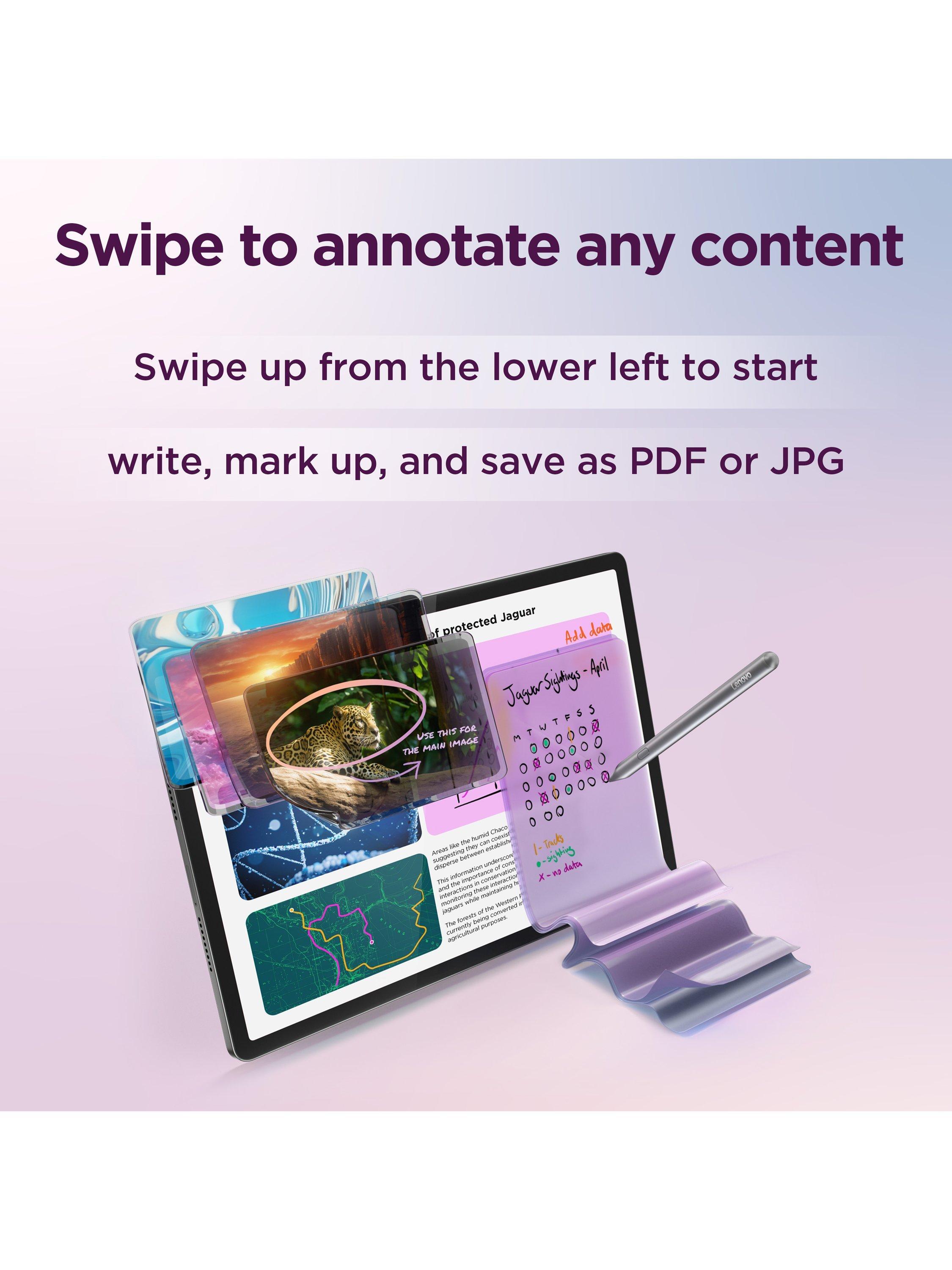 Quickly annotate class materials or online videos in one step with the Lenovo Tab Pen Plus. Just swipe from the lower left corner —perfect for capturing entire webpages or documents. Need to save a long scroll? Just select, select, and boom—save it as a PDF or JPG. Easy as that!