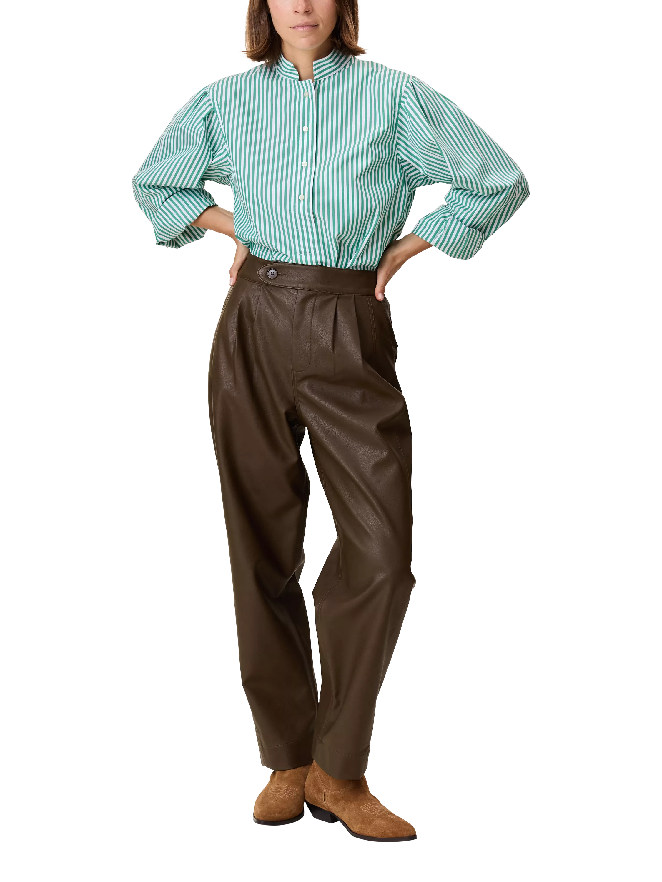 Faux-leather trousers with front pockets and buttoned flap-over back pockets.