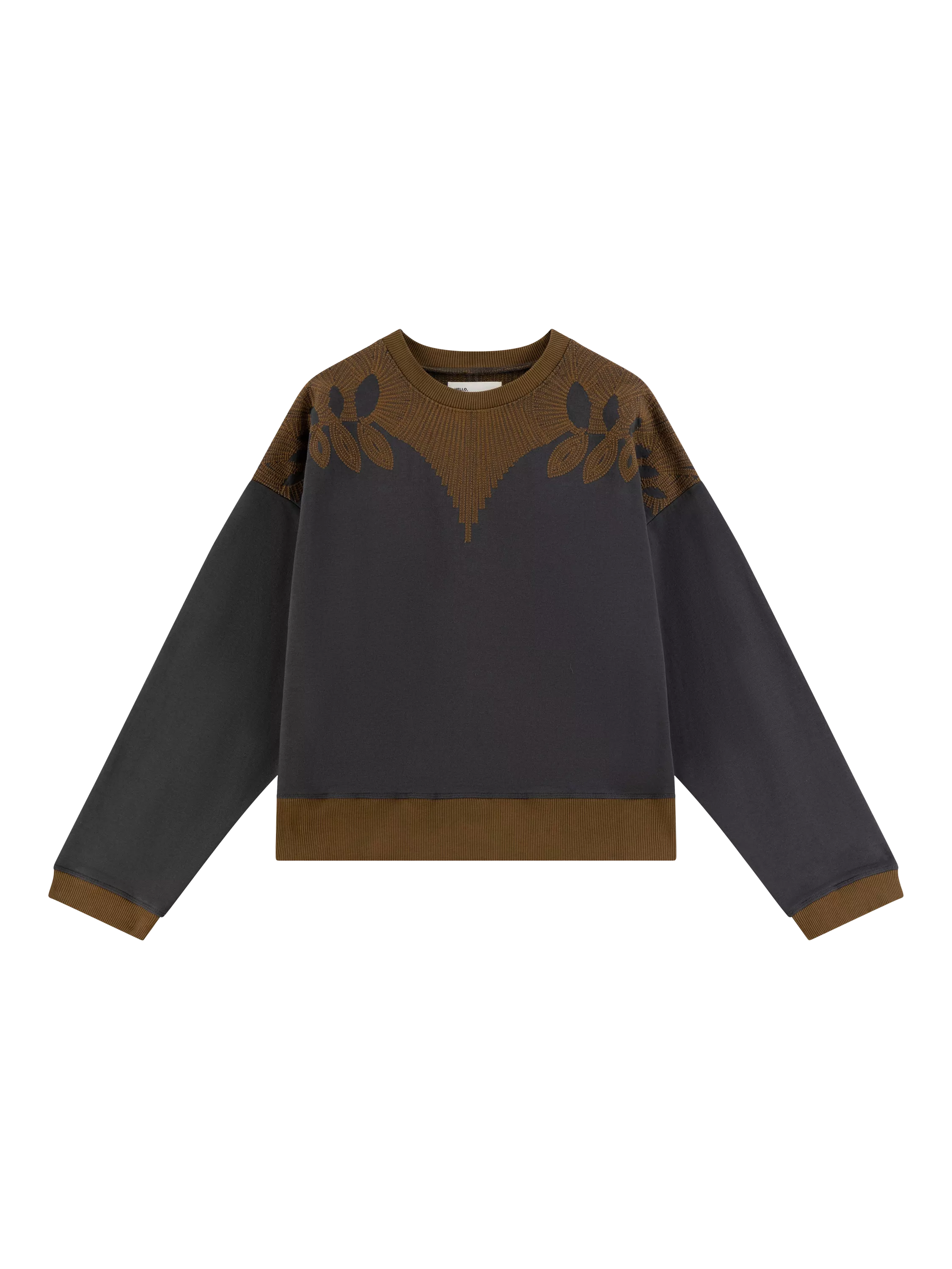 Sweatshirt made of a soft cotton blend fabric with modern leaf-pattern embroidery on the shoulders and neck. Completed with a ribbed crew neck, cuffs and hem.