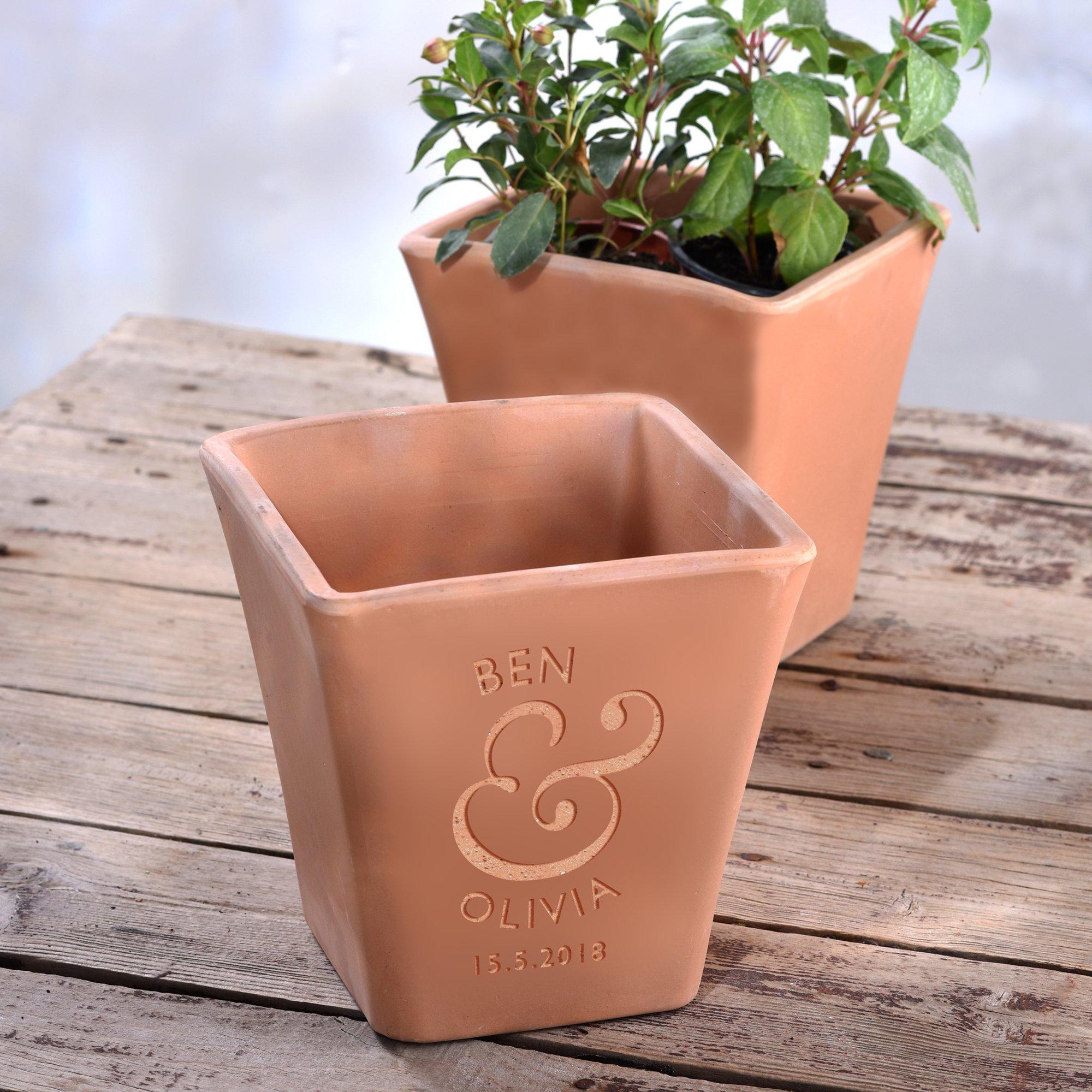 A personalised terracotta plant pot engraved with your choice of text such as the names of the couple with their wedding date, for a unique gift. A modern take on the traditional tuscan terracotta planter, this is a great pot for flowers or herbs.
