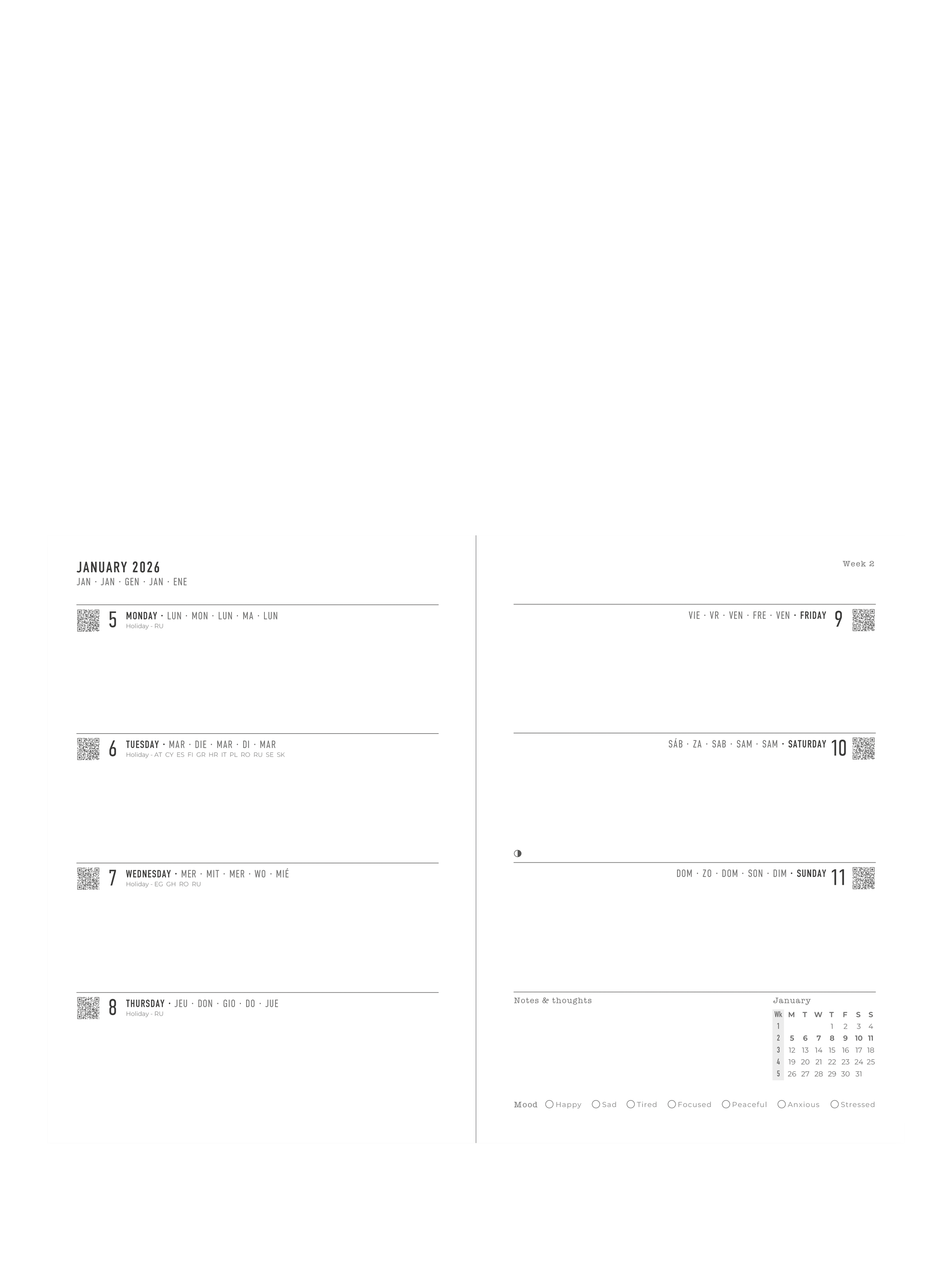 This Letts diary features a QR code on every day which, when used together with the Letts Reminder App, allows you to plan on paper and review on your phone. Simply download the free Letts Reminder app and scan the QR code on the date of your choice. This will allow you to not only copy appointments from your diary onto the App, but also set up reminders. The appointments can also be synced with your phone's calendar. This innovation will allow you to always have the important contents of your diary with you.