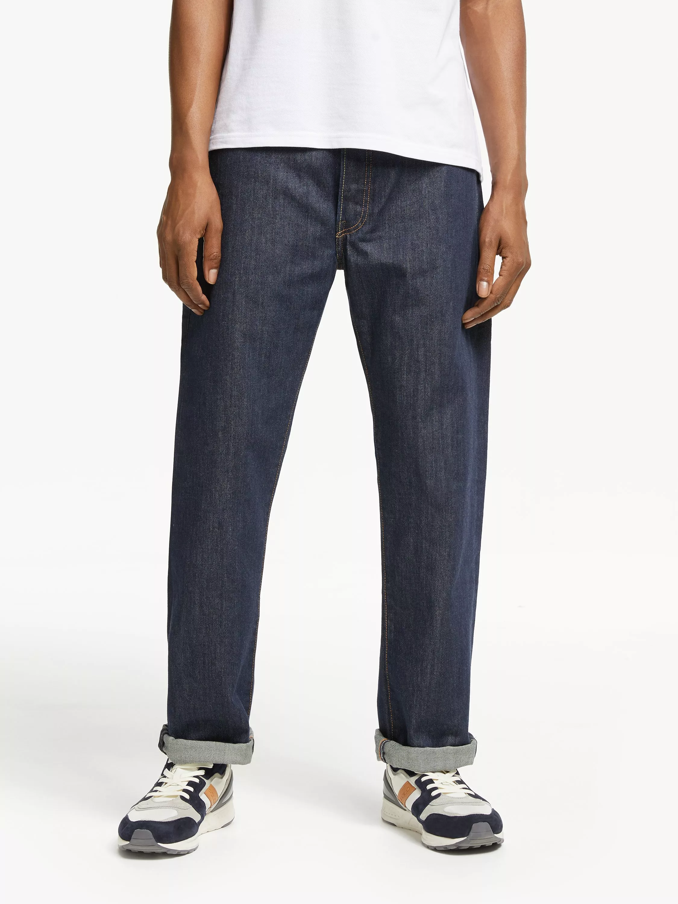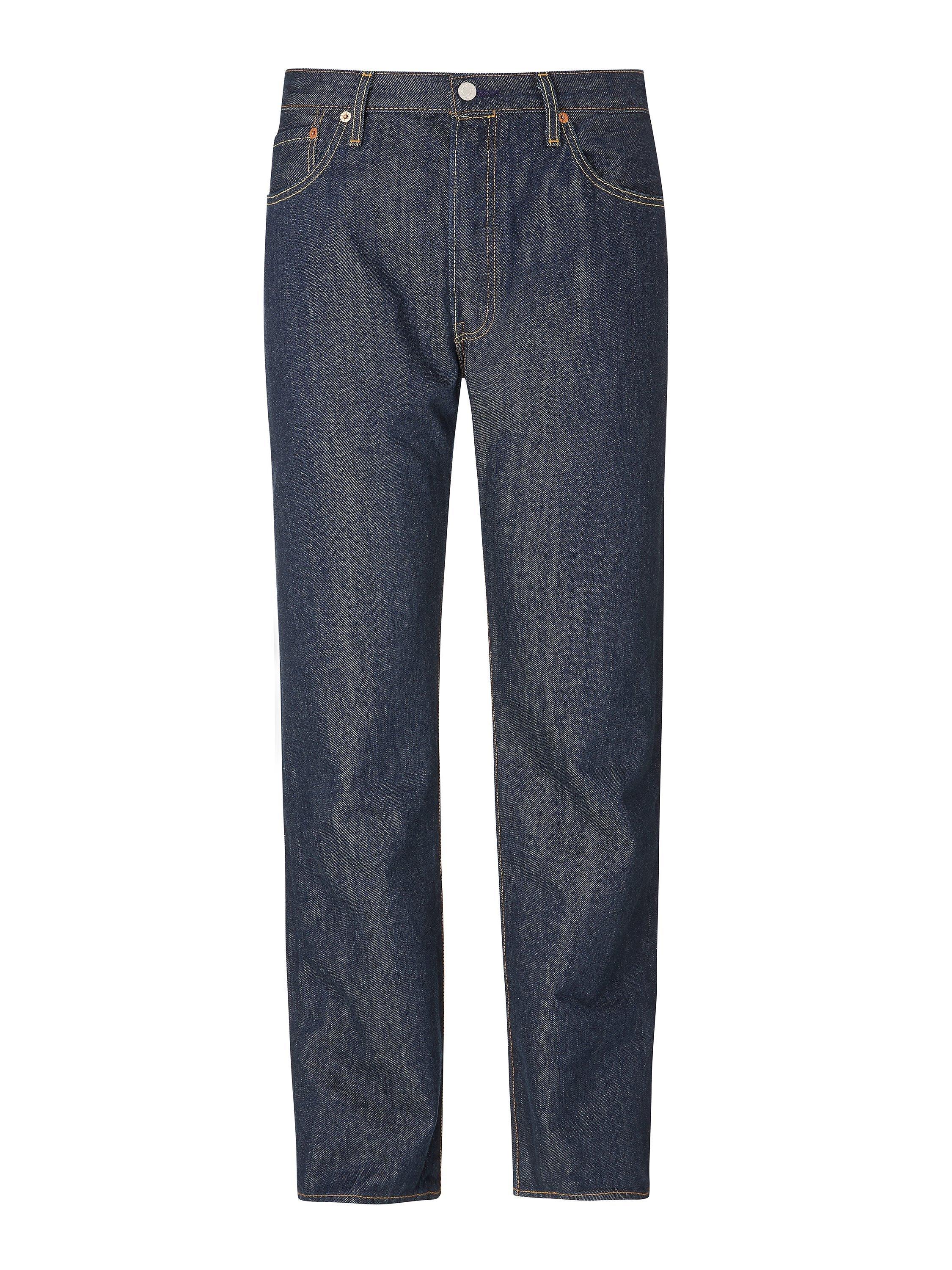 Crafted from non-stretch mid-weight cotton denim in a regular fit that's straight through the hip with a slightly tapered leg opening, their mid rise cut sits below the natural waist with a tilted waistband that pitches toward the front.