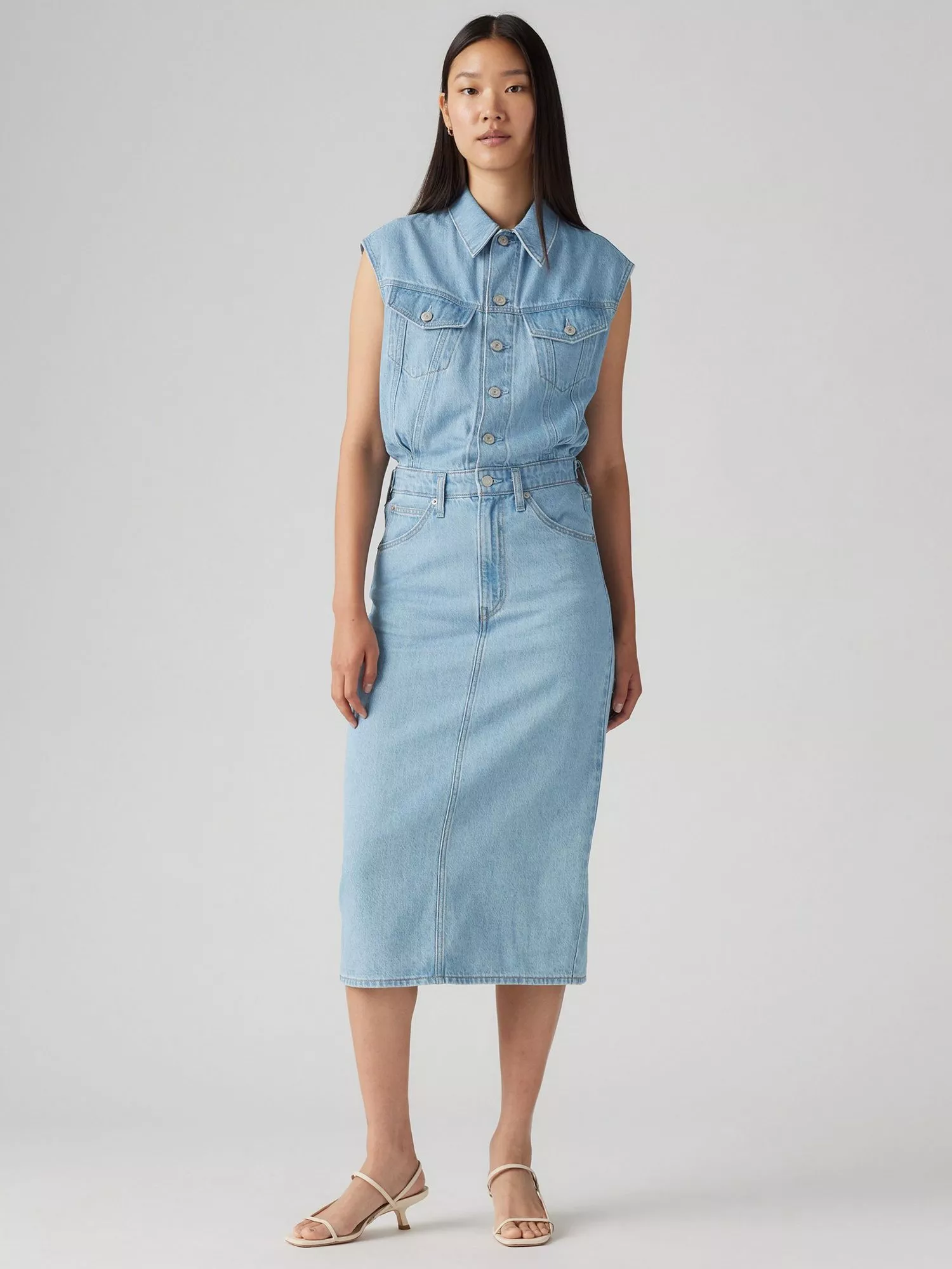 Our Iconic Sleeveless Dress gets its name for a reason. Designed with drapey denim, it pays homage to our timeless Trucker Jacket with two front pockets and a classic button-up design all topped off with the perfect midi length.