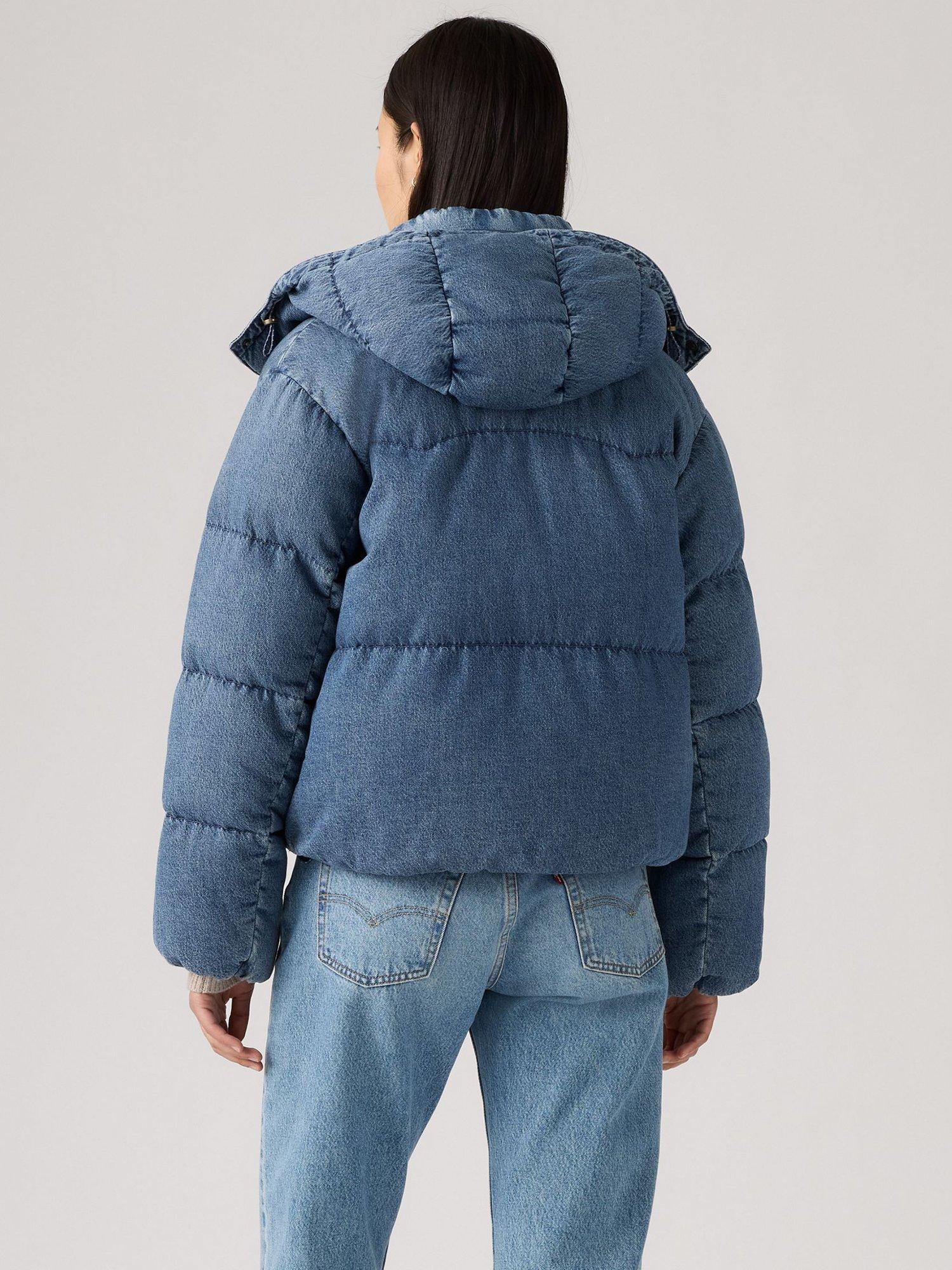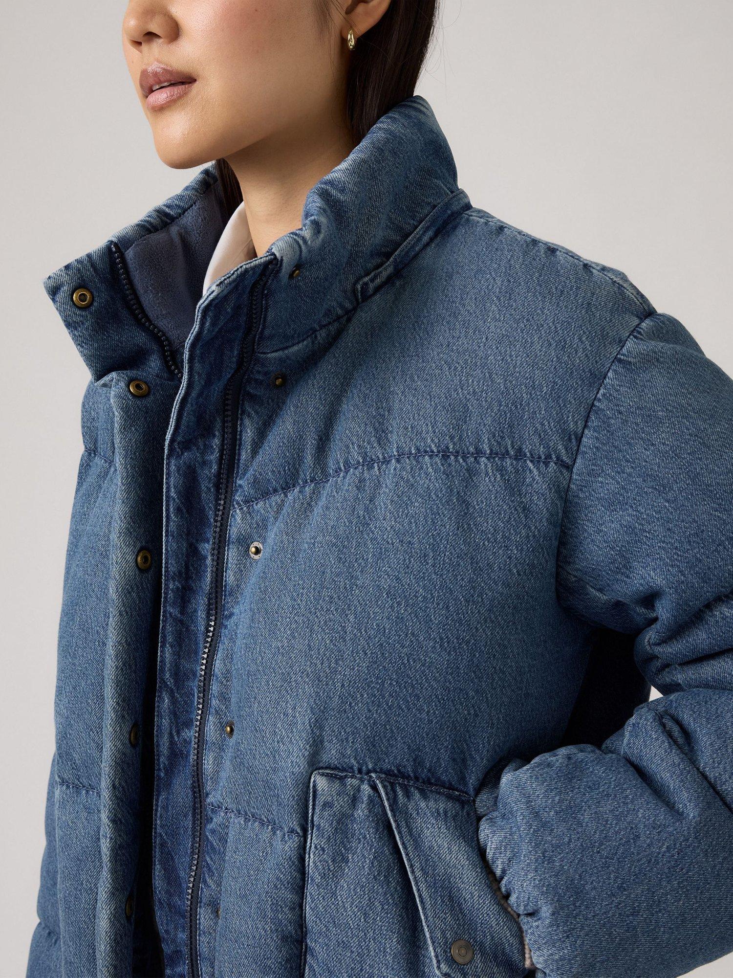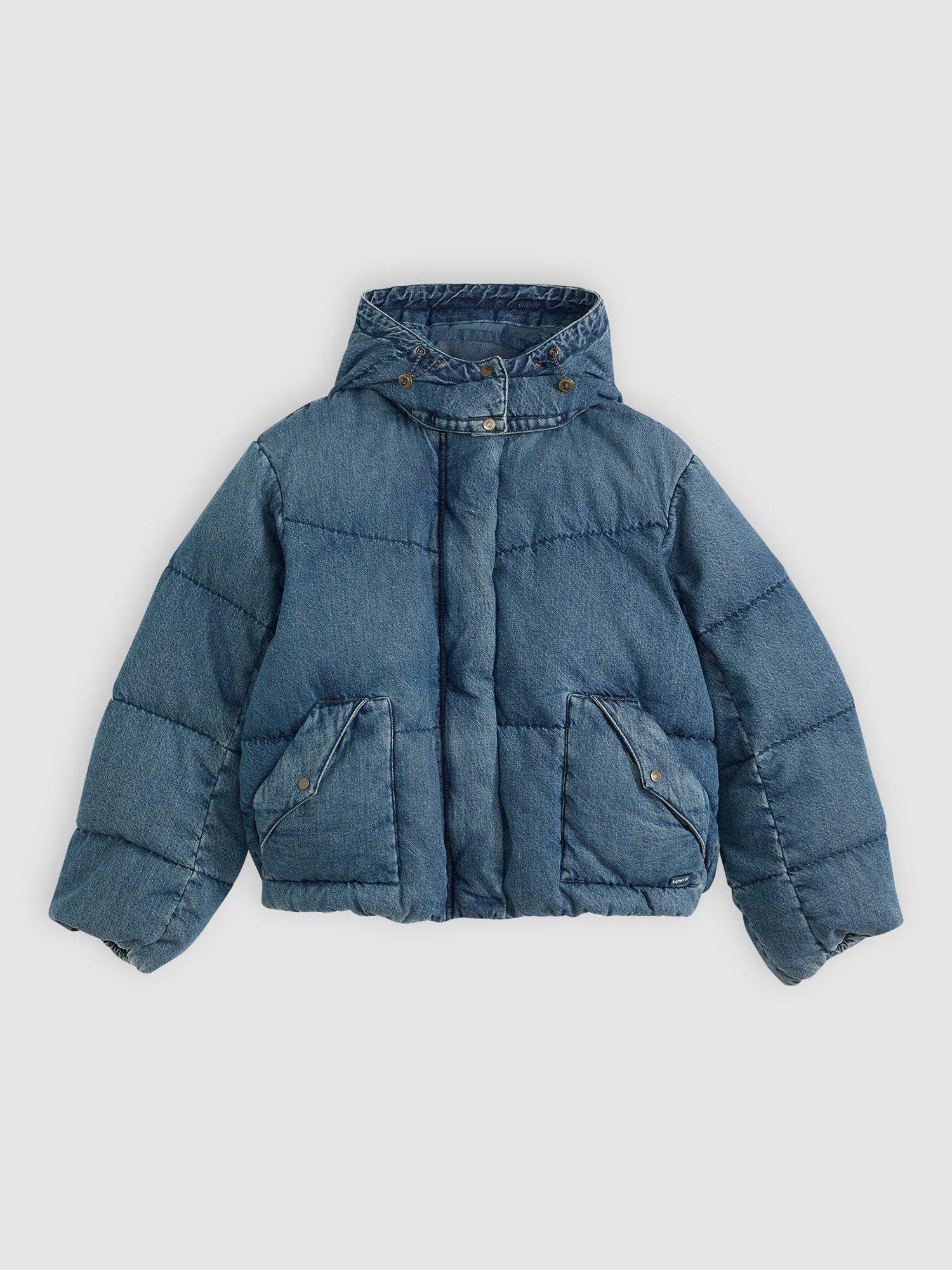 This cropped puffer jacket keeps you comfortably warm and stands out with its textured denim design. With a soft structure and quality wear, slip it on over your regular fit trousers and take on chilly days your way.
