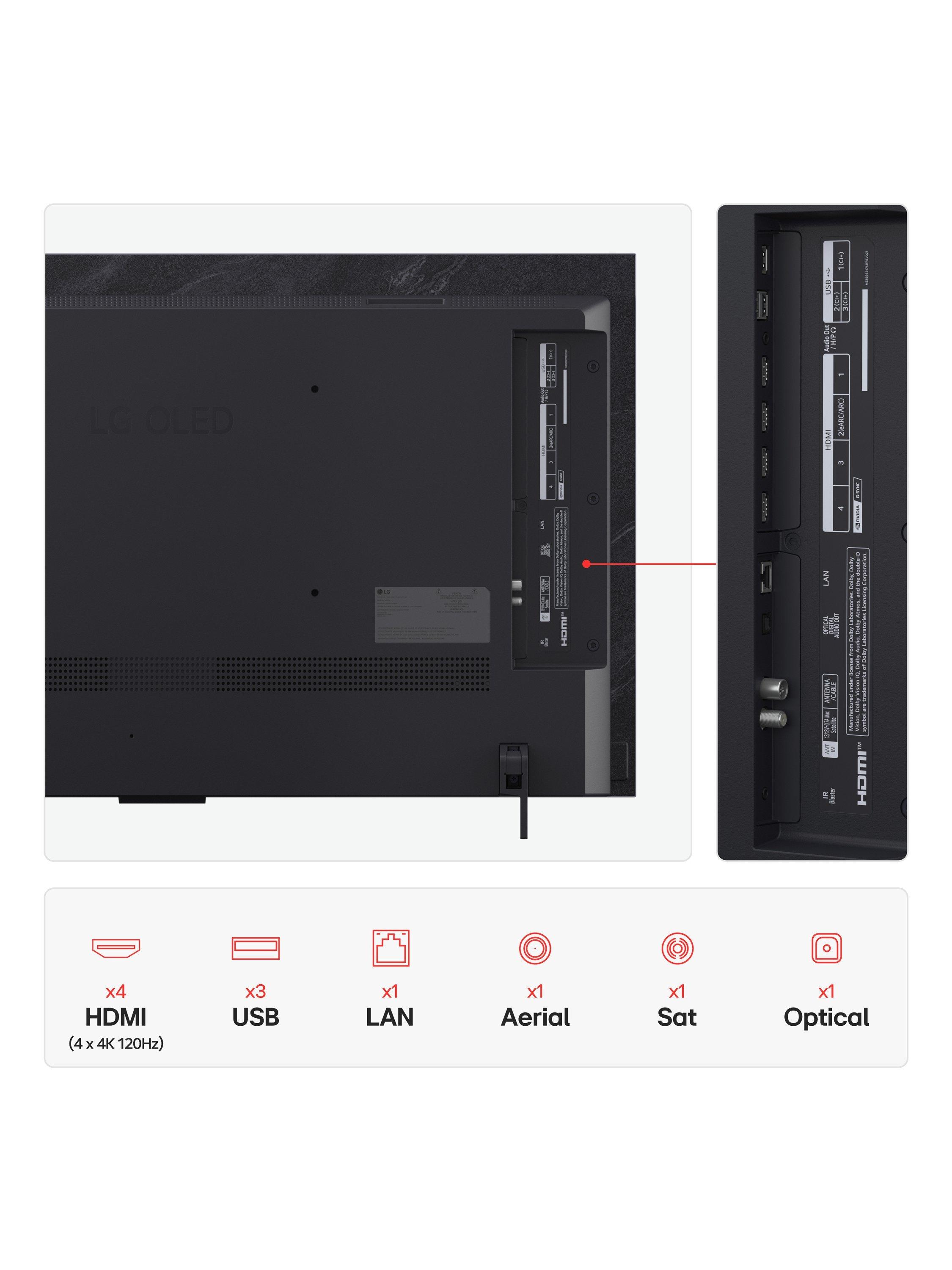 - HDMI 2.1 x4, USB 2.0 (Type A) x3, Antenna Coaxial Female, Satellite Coaxial Female, TOSLINK (Optical Audio), Ethernet/RJ45