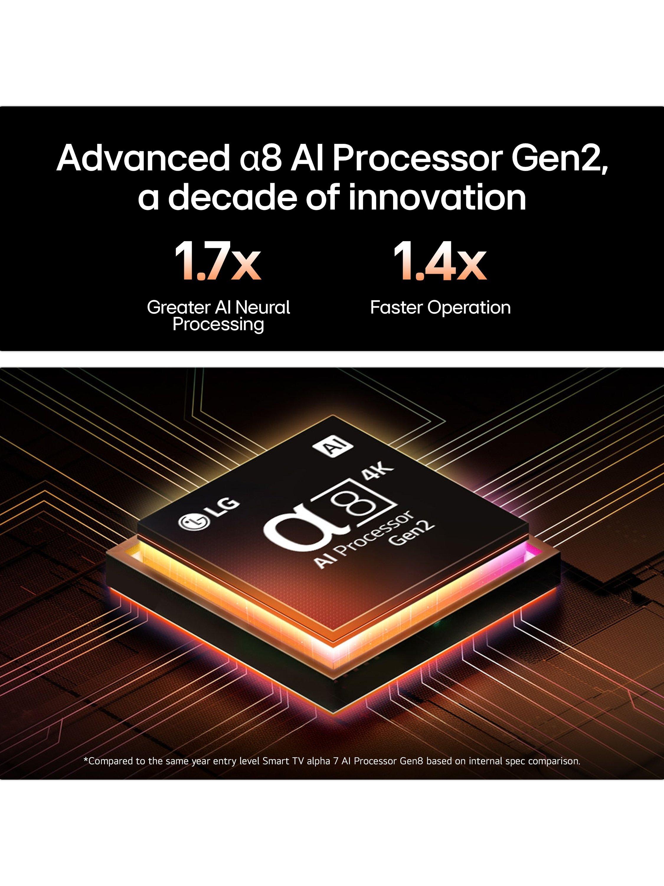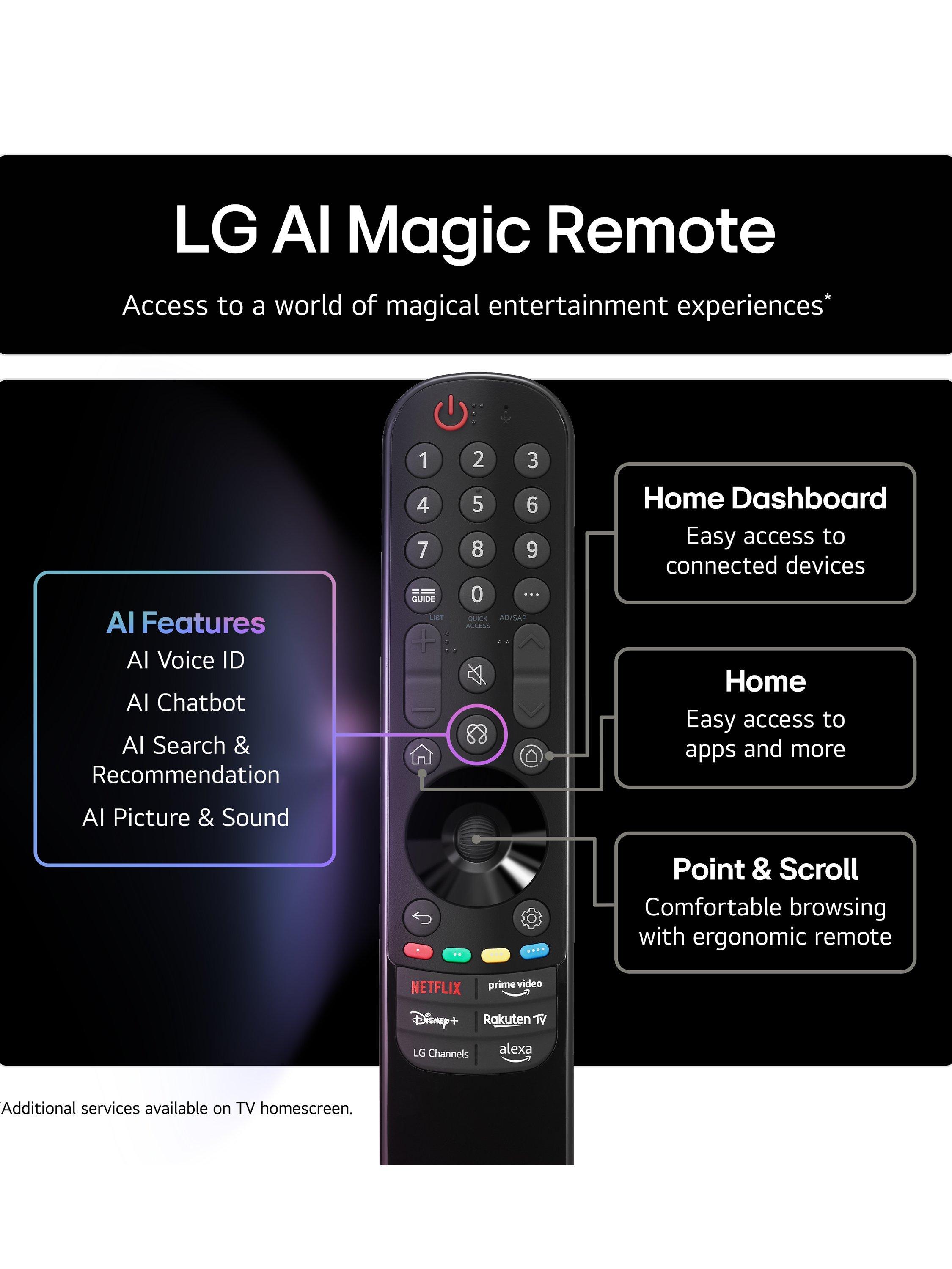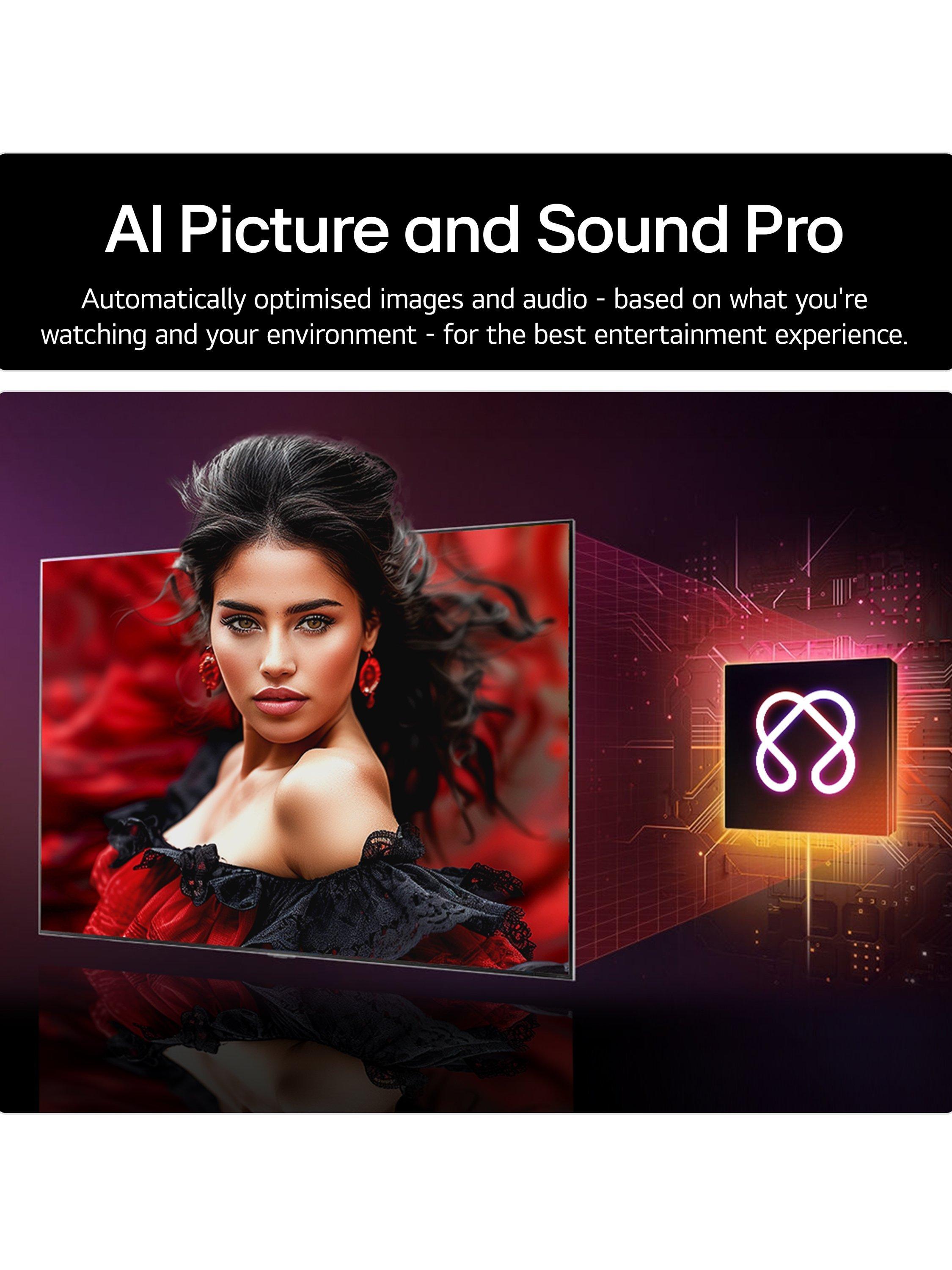This LG TV features webOS, LG's smart platform which hosts a huge variety of the top streaming services, while making browsing and searching for what to watch completely hassle-free. It opens up a world of information and assistance through a variety of AI-driven services. These include the AI Chatbot - which can help you to change the image or sound to your liking simply by asking, Voice ID – which can recognise different users and provide personalised recommendations, and much more.