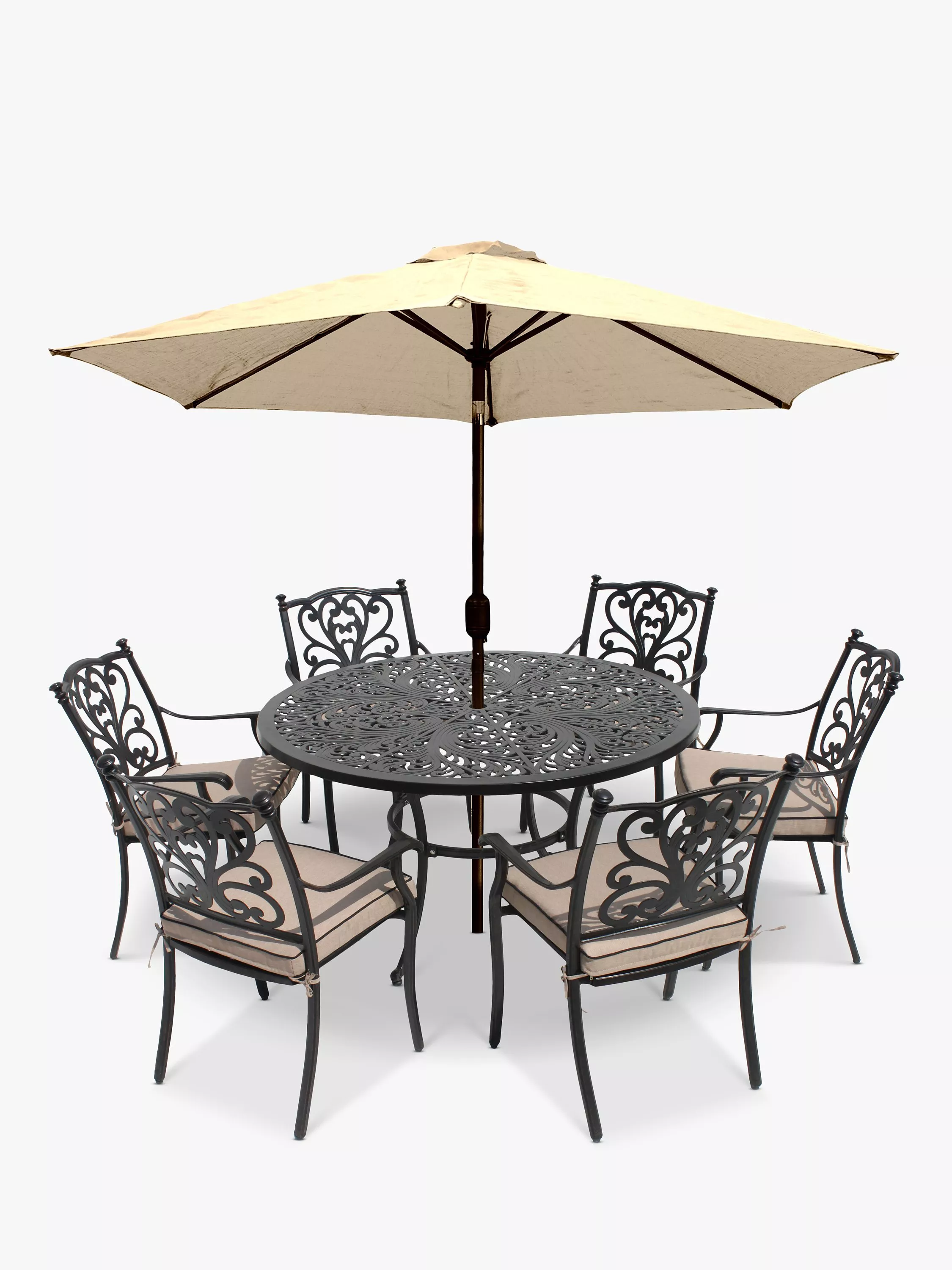 LG OutdoorDevon 6-Seater Garden Dining Table & Chairs Set with Parasol, Bronze