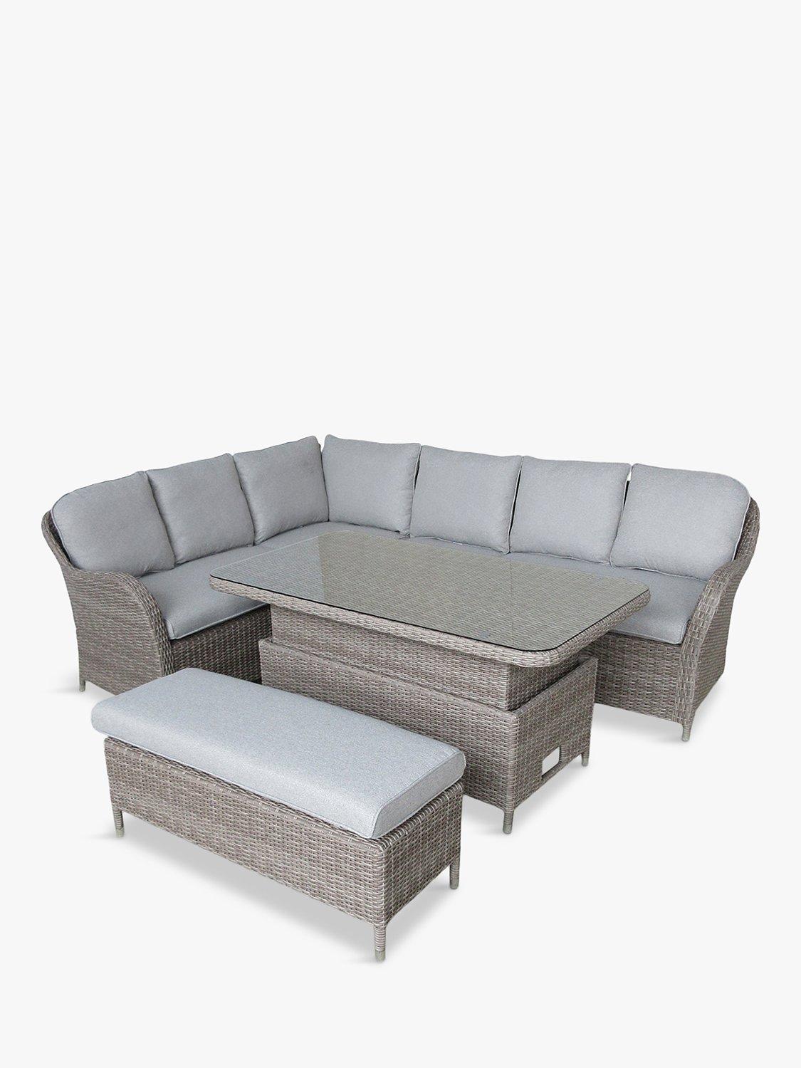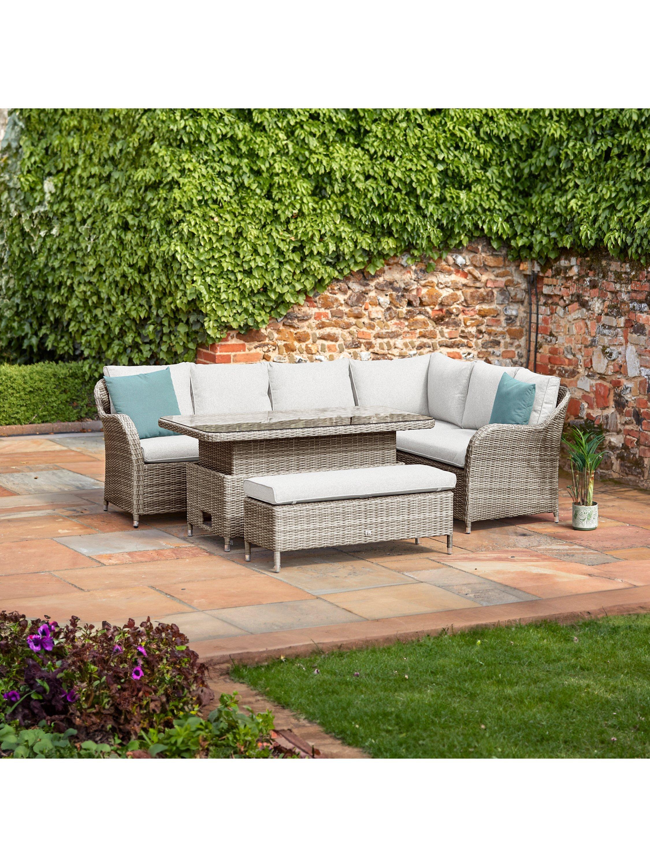 This eight-seater set includes a rectangular garden table with a toughened glass top. The table is height adjustable to take it from a coffee table to a casual dining table.