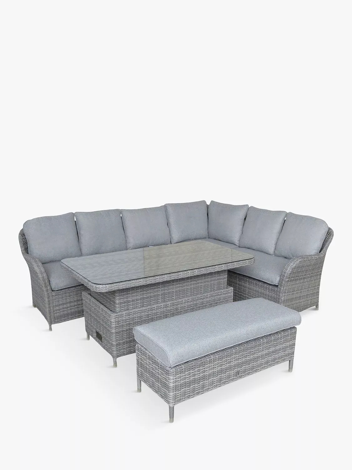 This eight-seater set includes a rectangular garden table with a toughened glass top. The table is height adjustable to take it from a coffee table to a casual dining table.
