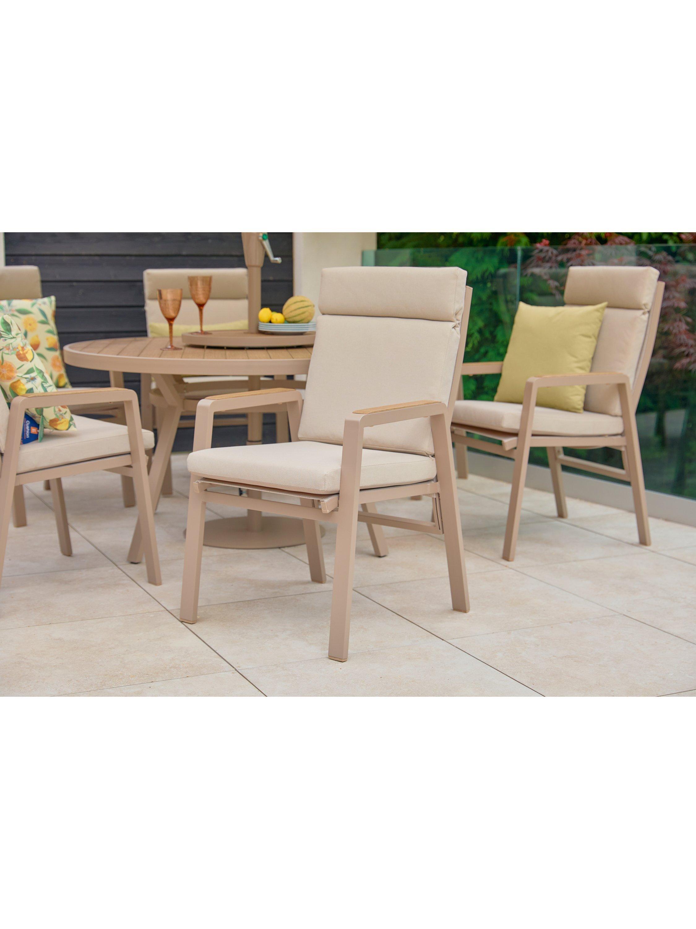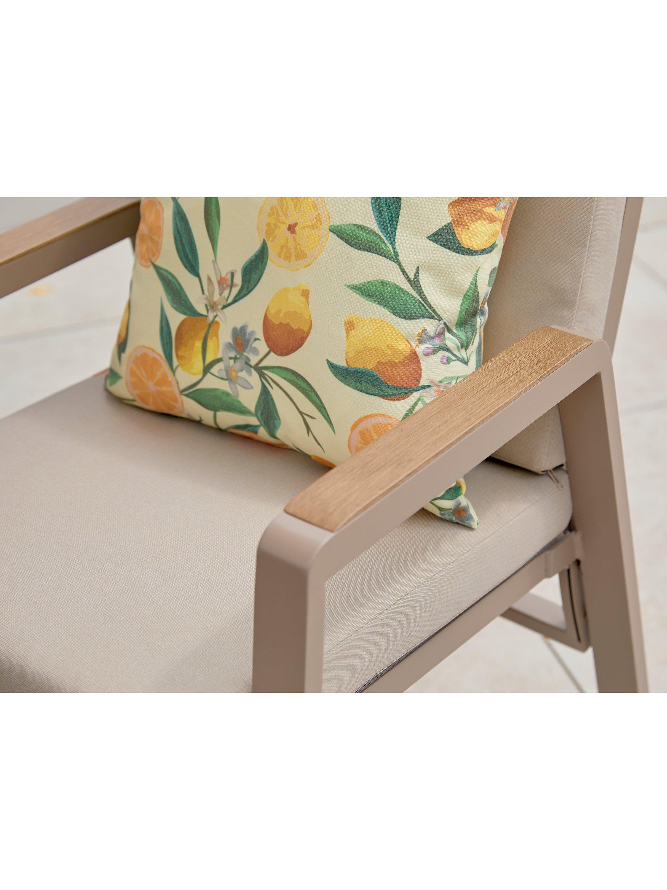 Relax outdoors at home with the Sorrento garden furniture range from LG Outdoor. The frames and tabletops are made of lightweight yet robust hand-brushed wood-effect powder-coated aluminium. Seating comes with season-proof cushions that are water-repellent, stain-resistant, UV-resistant and quick-drying.