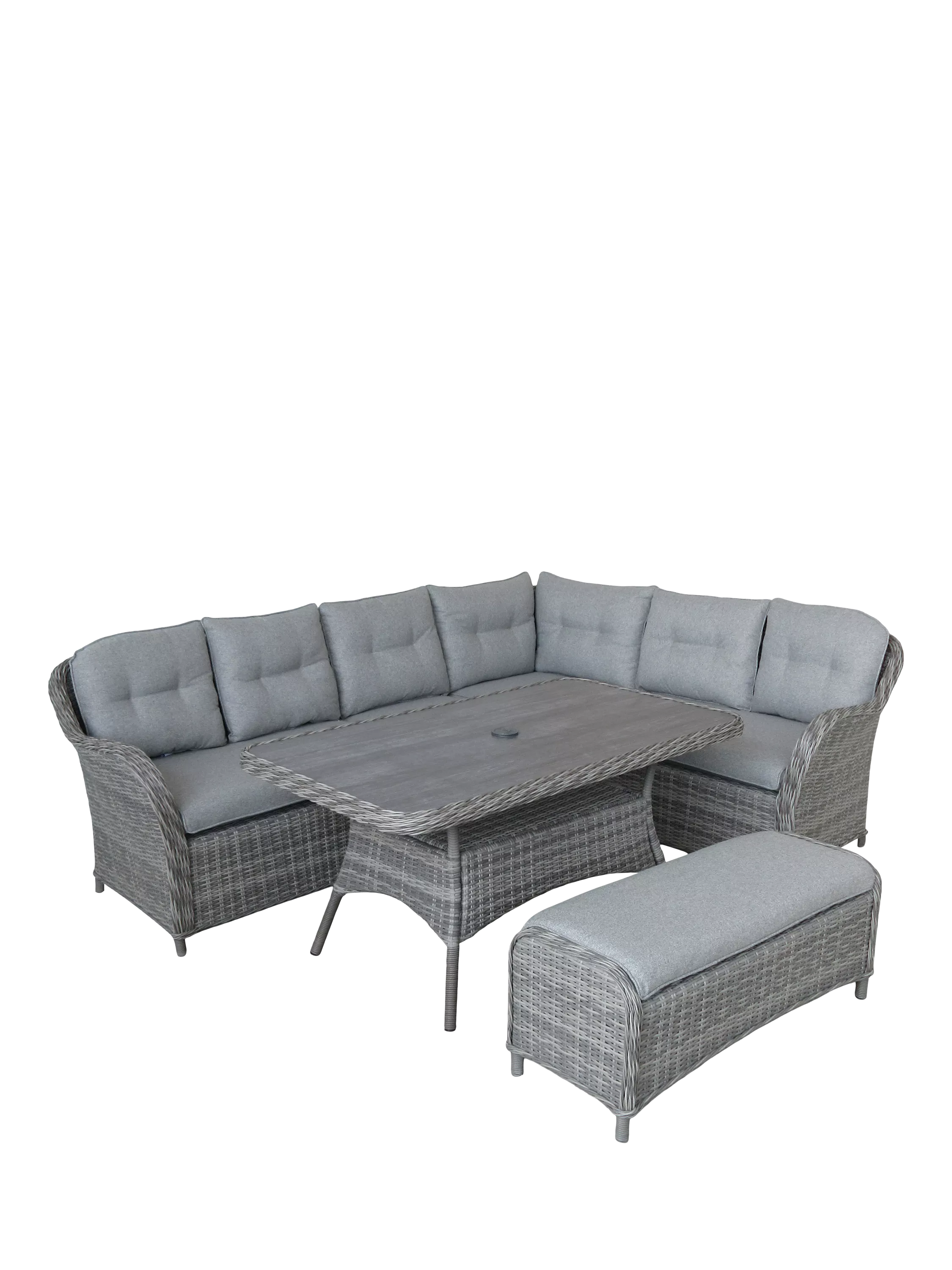 This eight-seater set includes a rectangular garden table for casual dining. Elegant and durable, the table has a ceramic-coated, wood-effect glass top and a parasol hole in the middle.