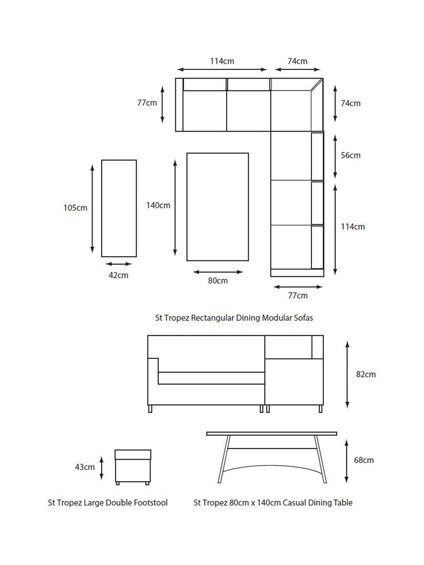 - Table: H68 x W140 x L80cm Left Sofa: H82 x W170 x L77cm Right Sofa: H82 x W114 x L77cm Footstool: H43 x W105 x L42cm