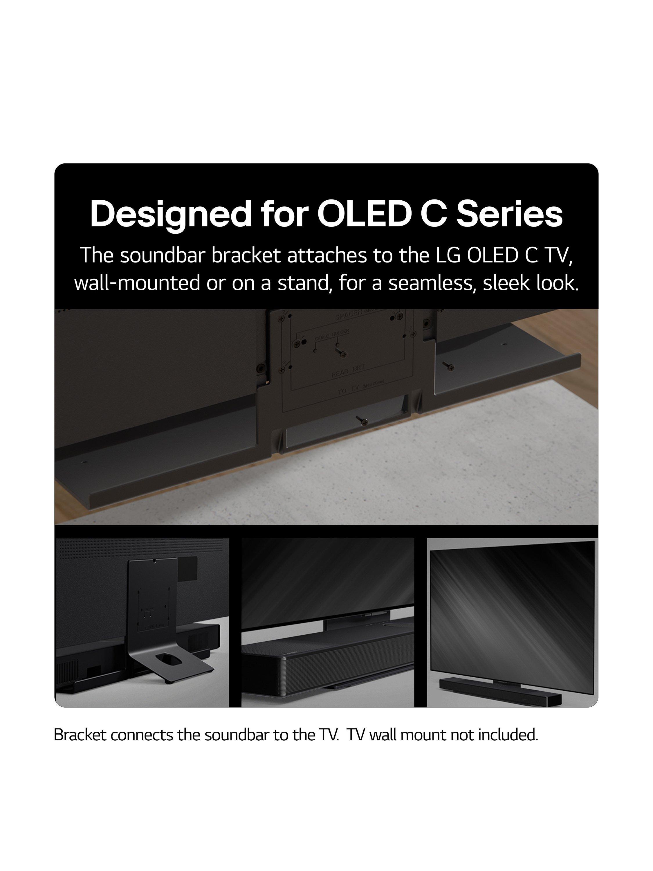 Designed to match perfectly with LG OLED C series TV, the USC9S features a stylish design, and comes with a bracket for attaching to compatible LG OLED TVs*. The bracket can be used in wall-mount or table-stand mode, and ensures a seamless look between TV and Sound Bar – as if they are one product. *Stand compatible with LG OLED C series models; 55/65/77”, model year 2022 on. Separate bracket required to wall-mount TV