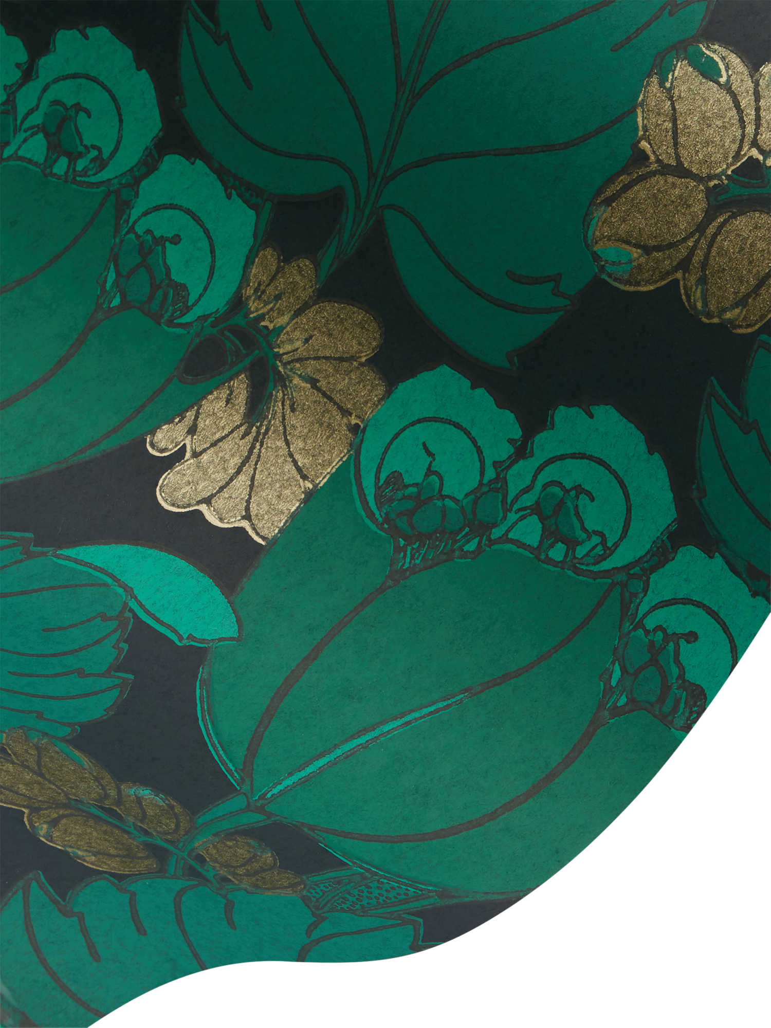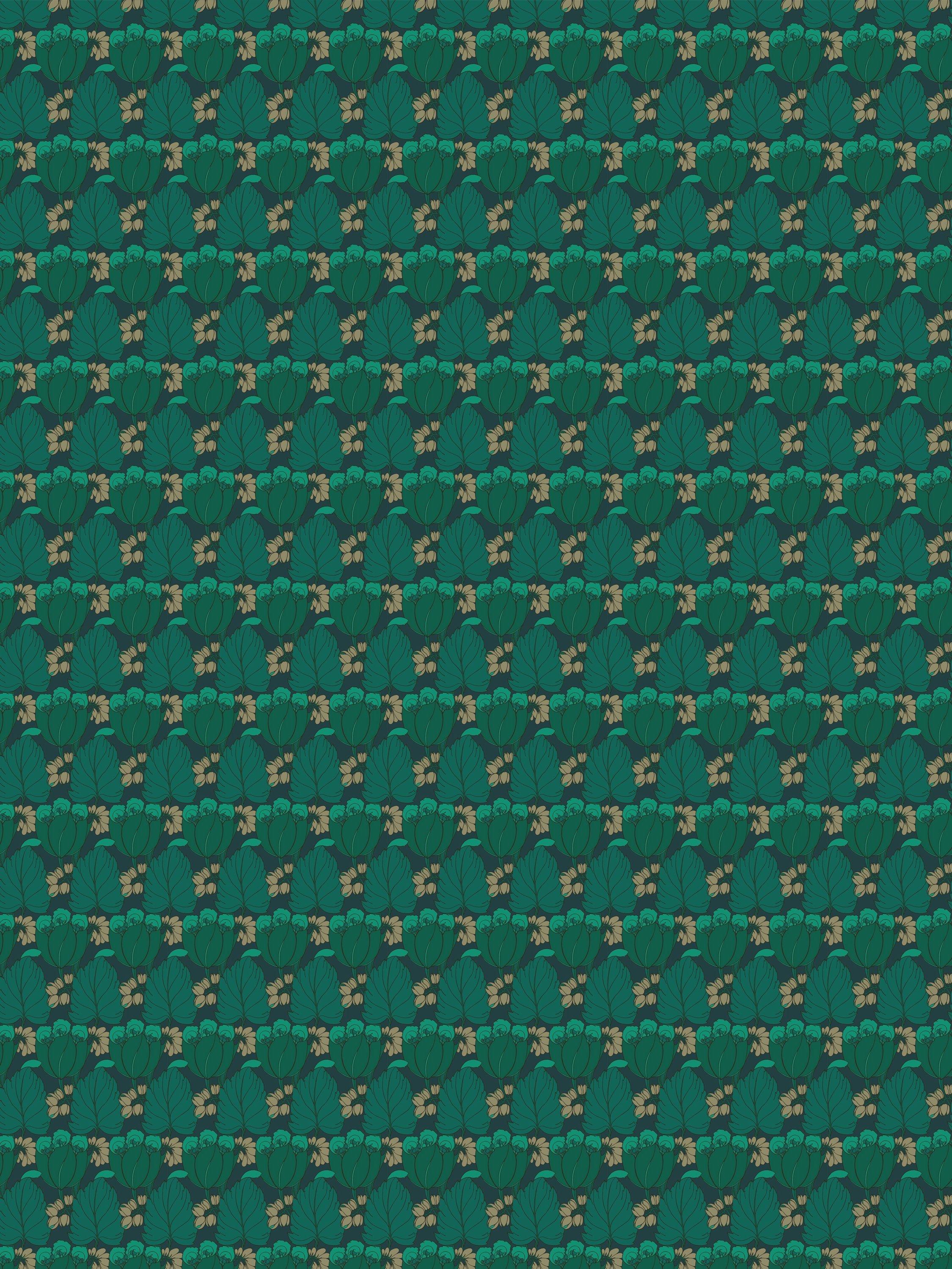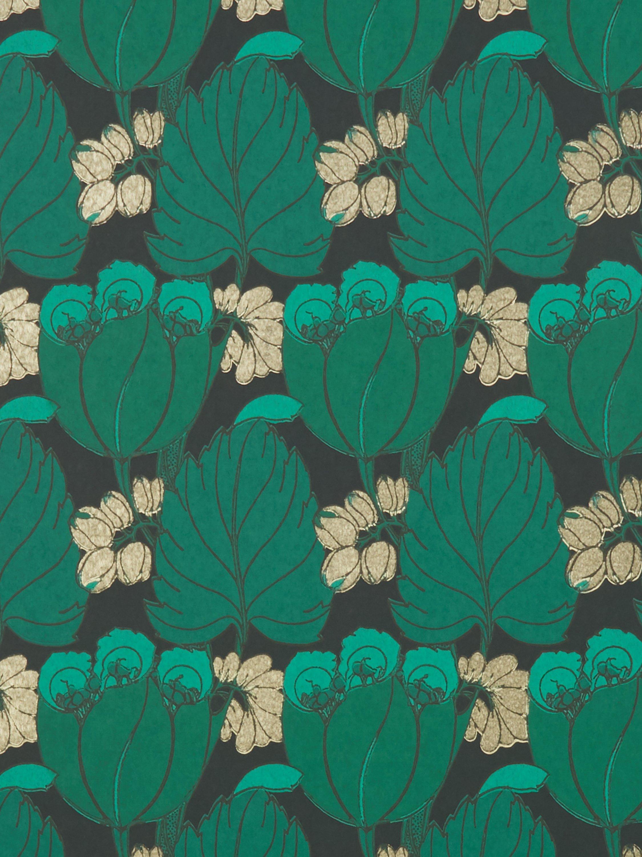 Rich chalky grounds form the background for the boldly coloured tulip motifs, in beautiful matte and metallic pigments. Carefully selected to bring this design to life, the surface print technique allows rich reticulation of surface pigment, emulating traditional block printing effects.