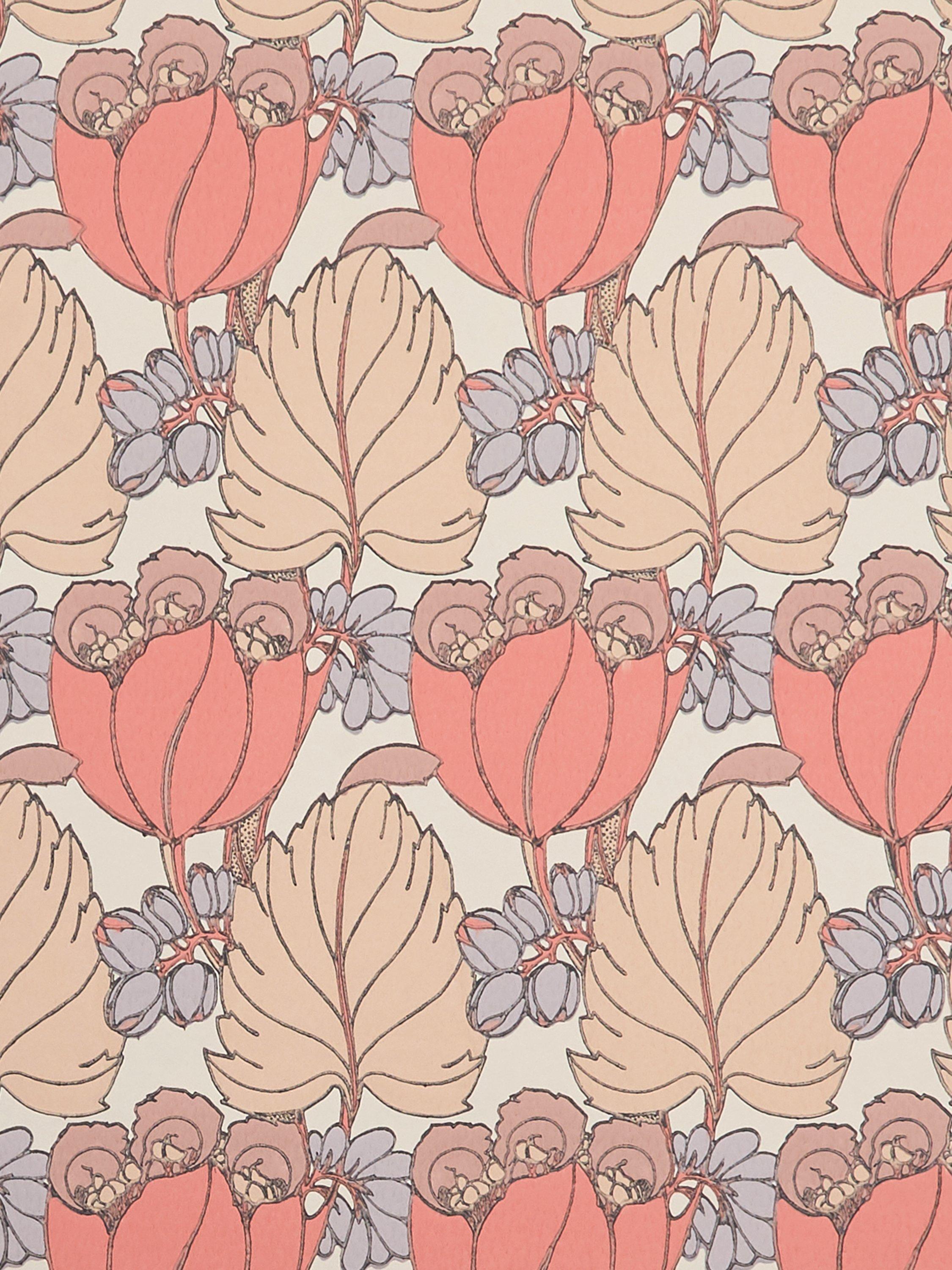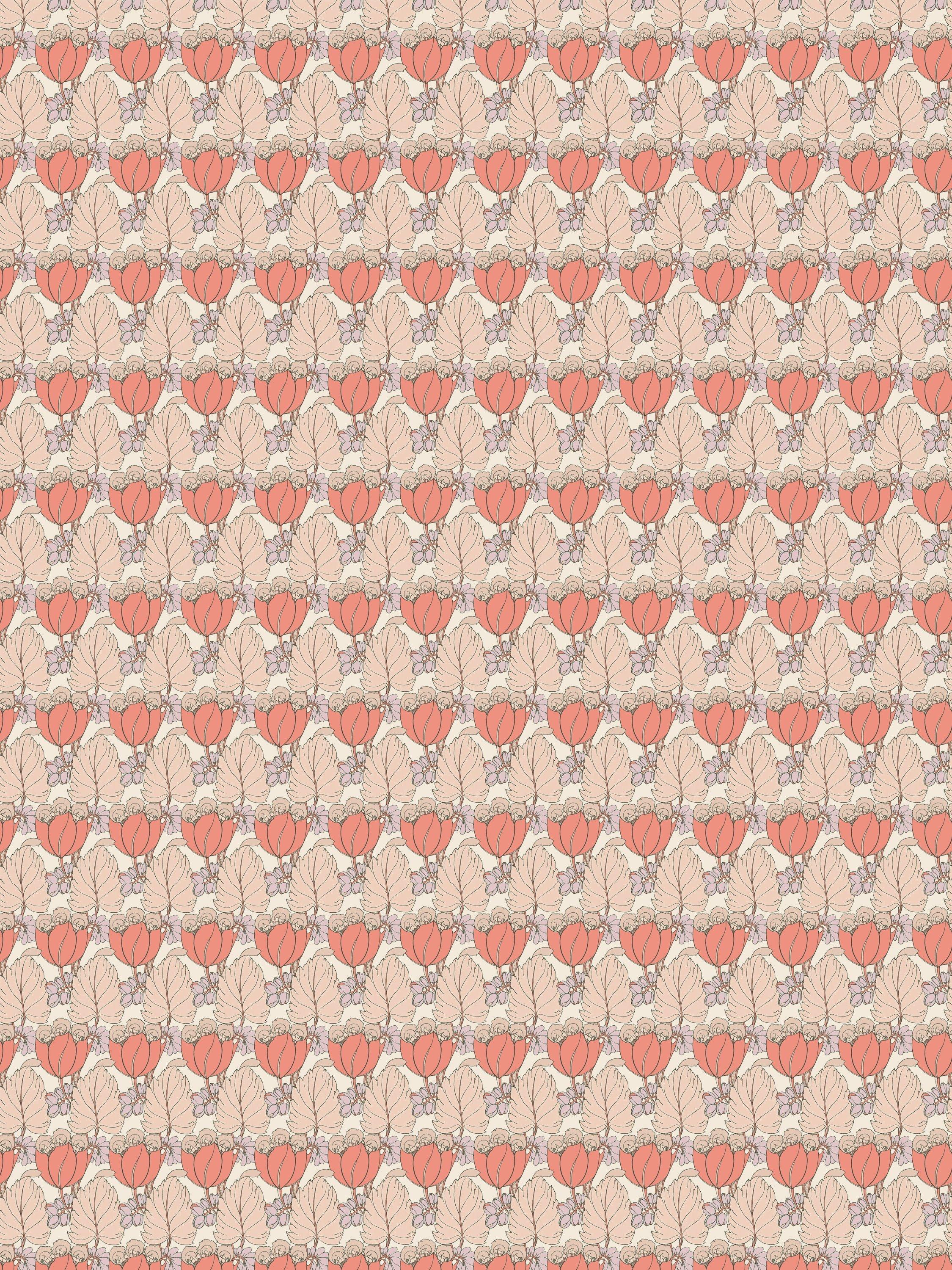 Rich chalky grounds form the background for the boldly coloured tulip motifs, in beautiful matte and metallic pigments. Carefully selected to bring this design to life, the surface print technique allows rich reticulation of surface pigment, emulating traditional block printing effects.
