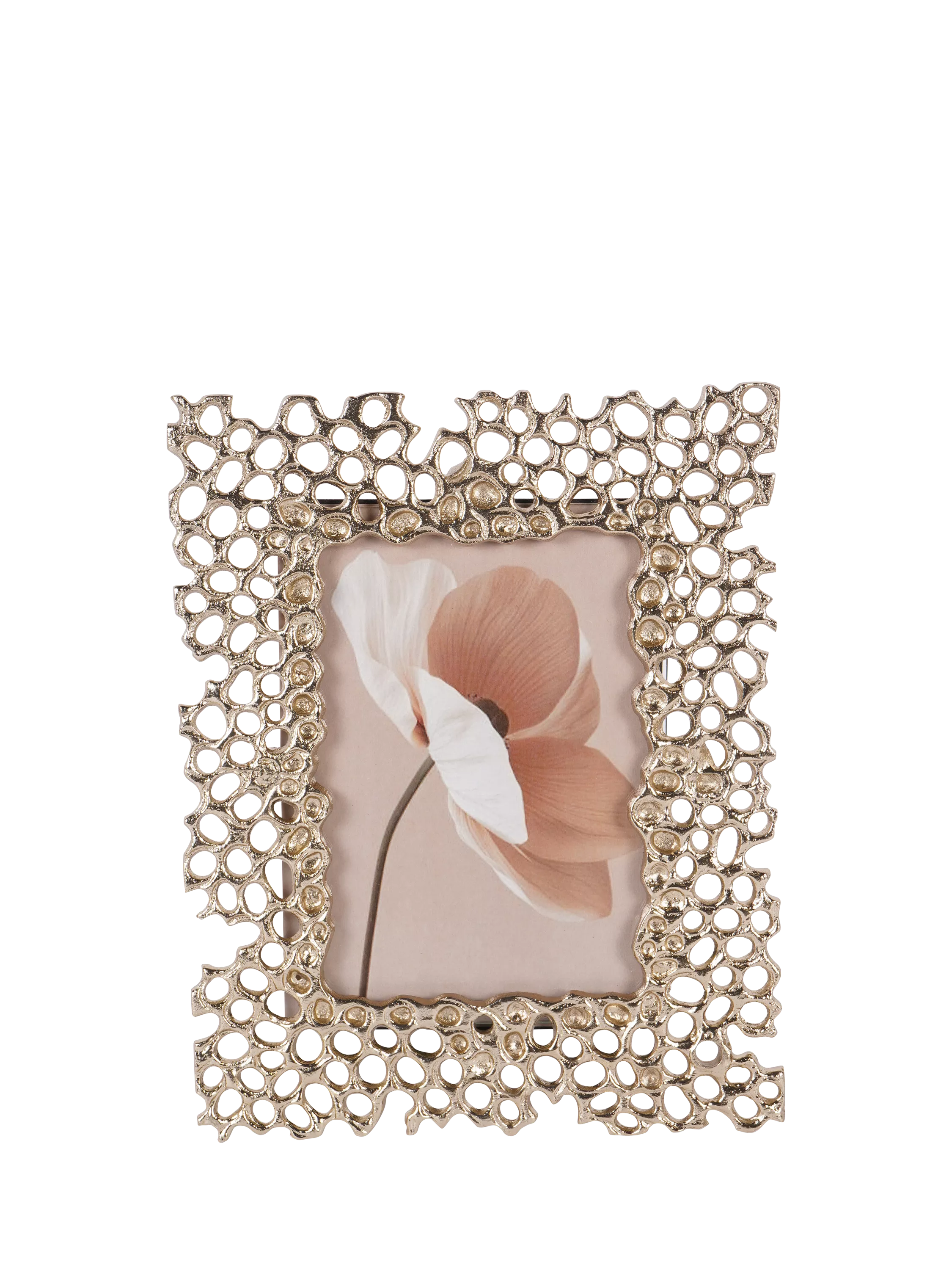 A decorative photo frame with an ornate, abstract design. The frame features an openwork pattern resembling honeycomb. It's finished in a metallic gold tone with a textured, slightly glossy surface, adding a luxurious and eye-catching touch. Display freestanding, vertically or horizontally.