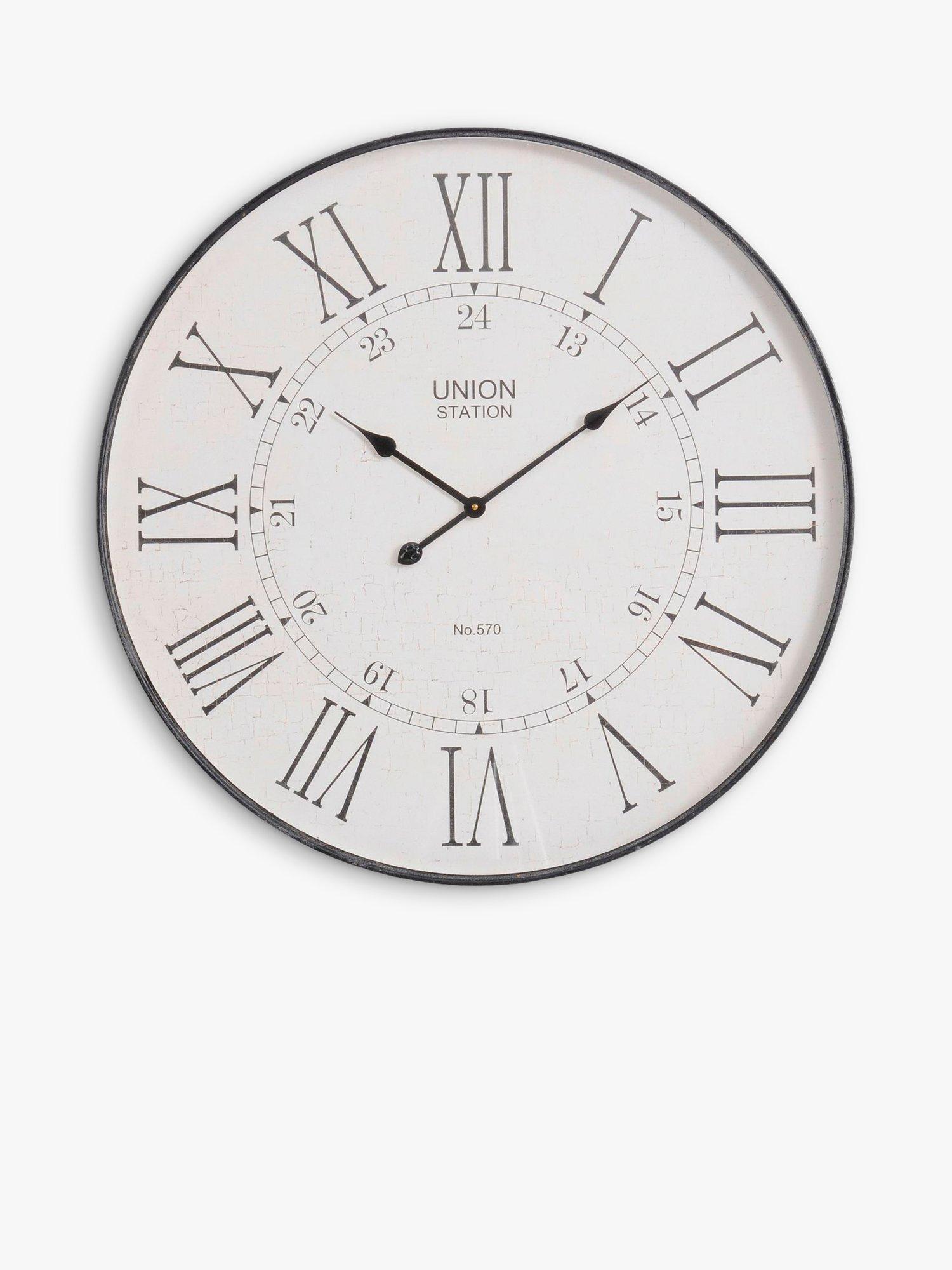 A modern spin on vintage design, this large round wall clock from Libra Interiors has Roman numerals alongside 24-hour Arabic numerals. The iron clock has an antique finish with decorative clock hands.