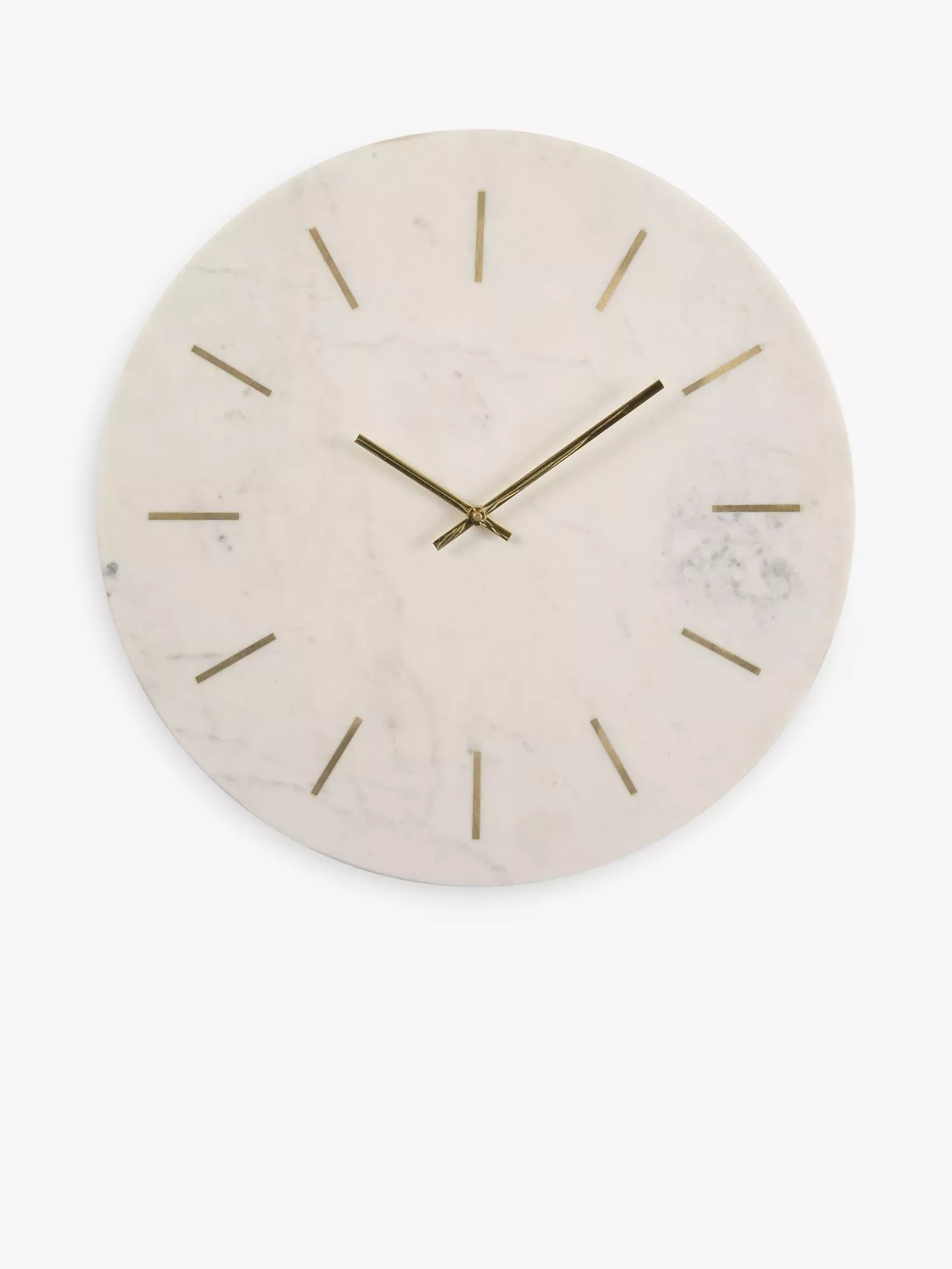 A pared-back design reminiscent of the Art Deco era, this round wall clock from Libra Interiors has contemporary appeal with a marble clock face and minimalist brass-inlay hour markers and hands. It's easy to wall-mount with the single keyhole fitting on the back.