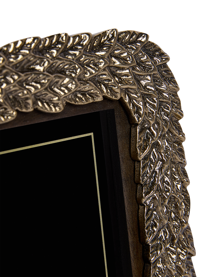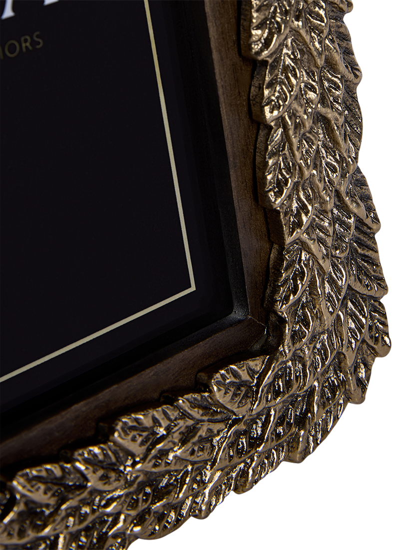 An elegant decorative photo frame from The Libra Company featuring a textured antique metallic finish with a leaf motif border. Individual leaves are intricately sculpted to create a sense of natural movement and depth. Wall-mount or display freestanding, vertically or horizontally.