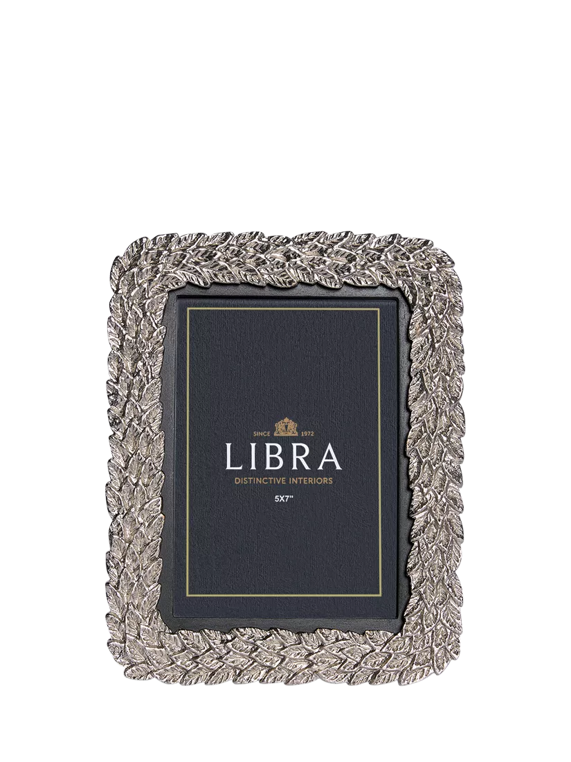 An elegant decorative photo frame from The Libra Company featuring a textured antique metallic finish with a leaf motif border. Individual leaves are intricately sculpted to create a sense of natural movement and depth. Wall-mount or display freestanding, vertically or horizontally.