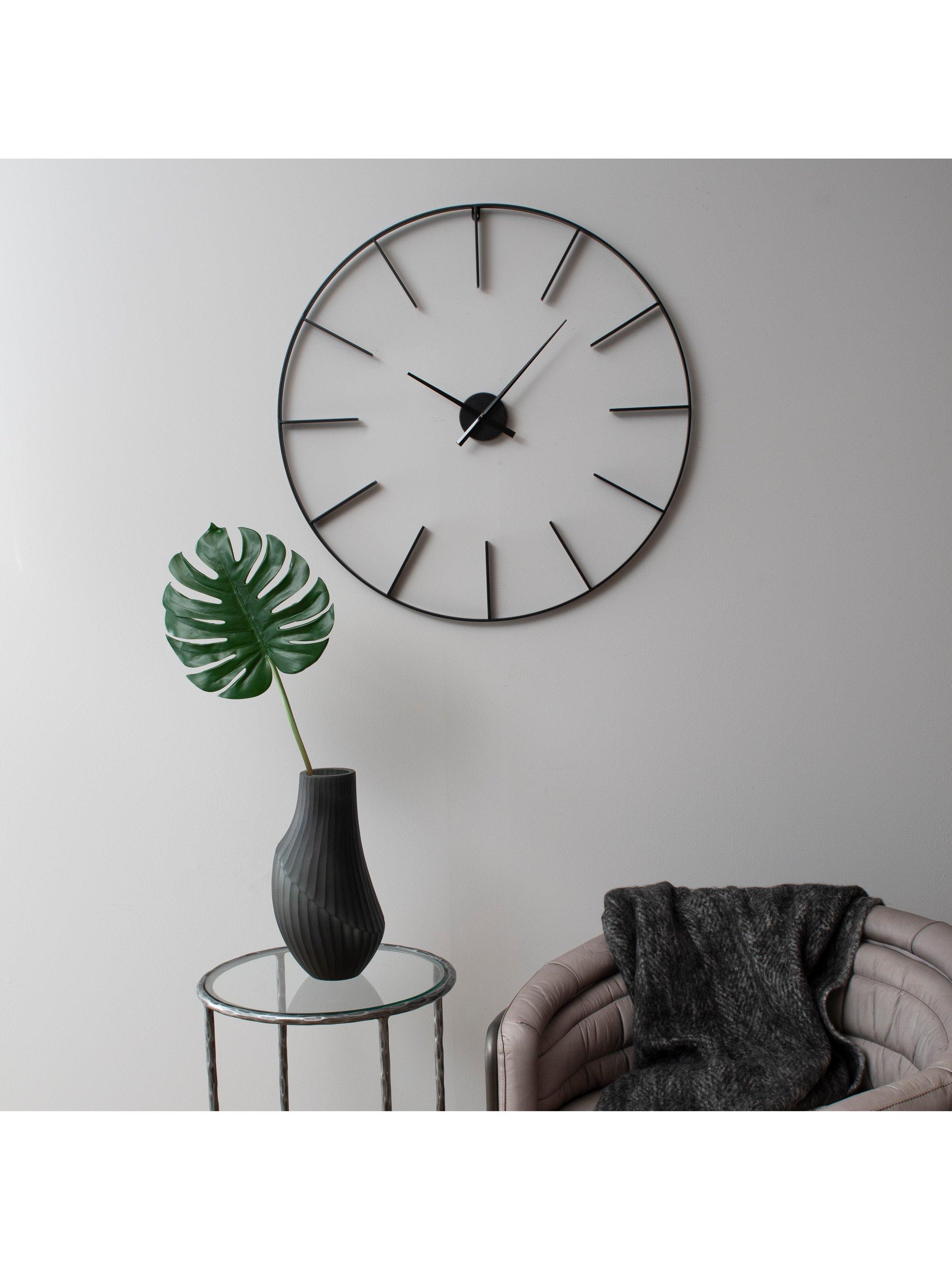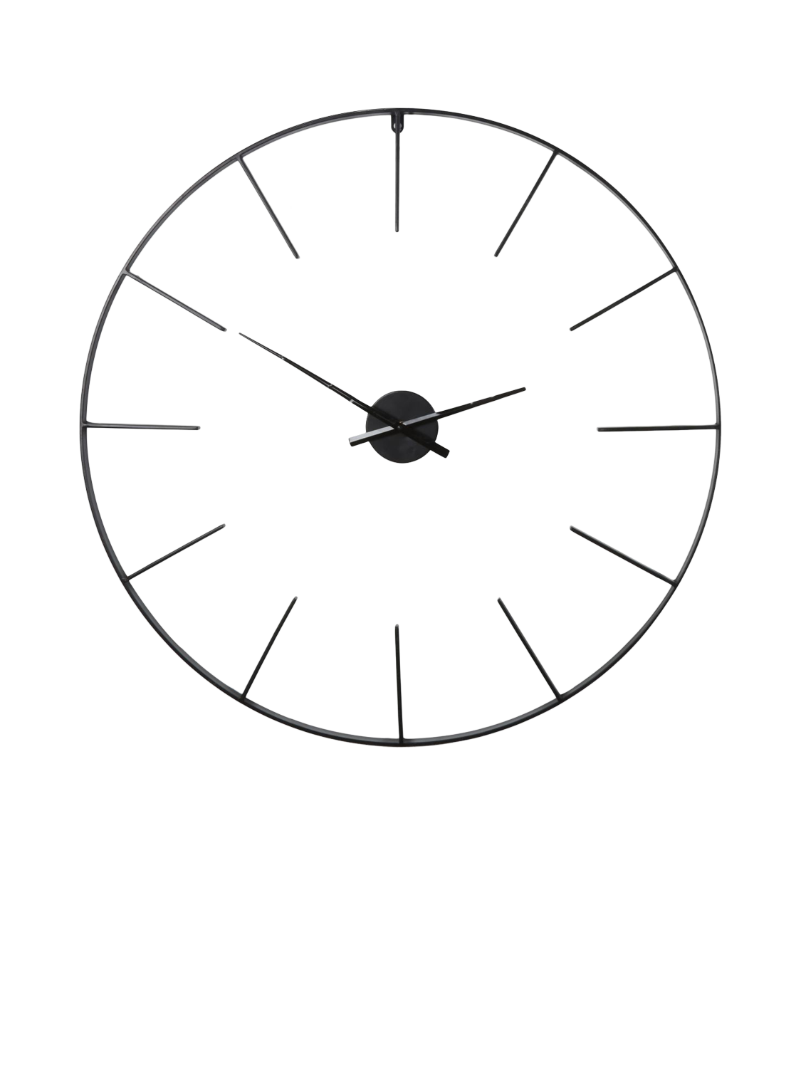 The Tiverton skeleton clock is a modern addition to any home, made up of two separate parts: a striking external frame and a central mechanism upon which the hands are placed. This large wall clock is made of strong metal with a black powder-painted finish. This clock produces a gentle ticking sound, adding to its charm.