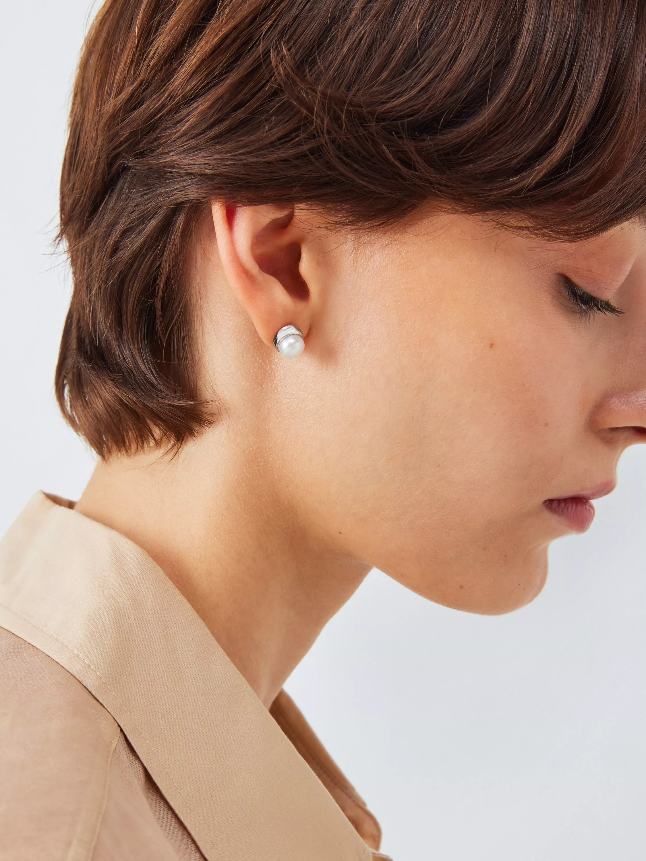 Crafted in sterling silver, these bezel-set freshwater button pearl stud earrings sit on post fittings, and are suitable for pierced ears only.