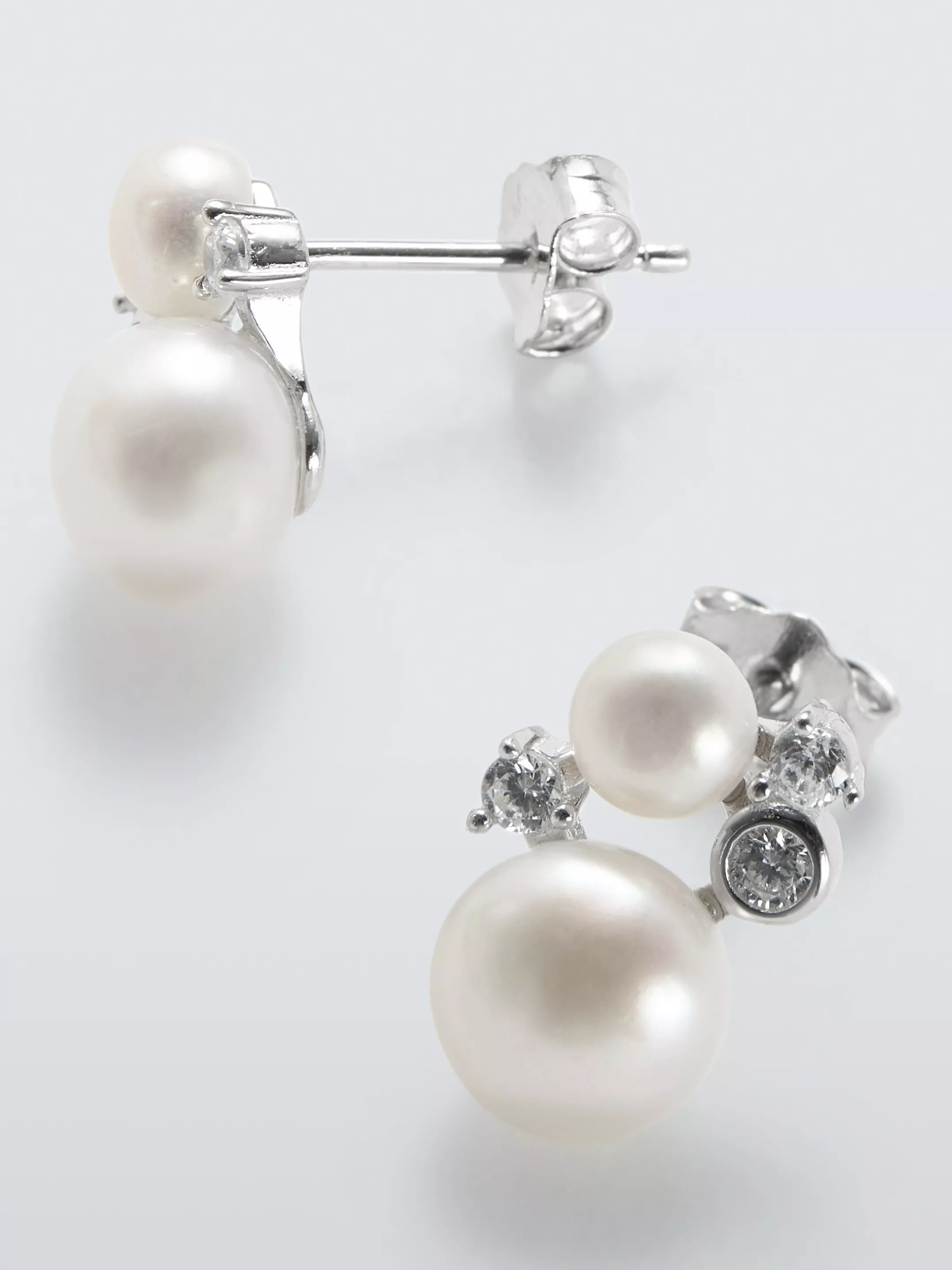 Opt for understated elegance with these Cubic Zirconia and double freshwater button pearl bubble-style stud earrings. Suitable for pierced ears only.