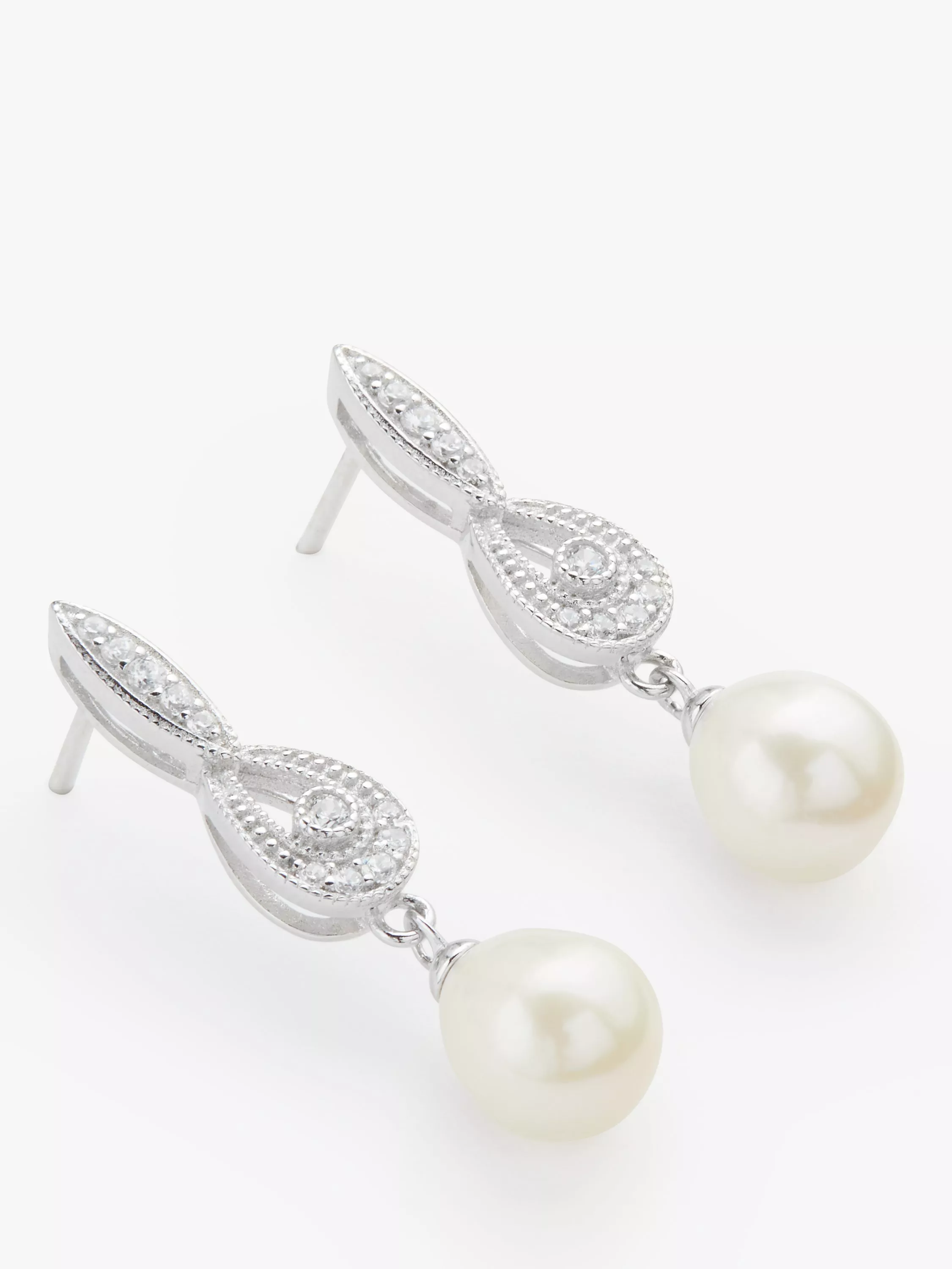Crafted from sterling silver, the design features an elongated drop with marquise and teardrop shapes encrusted with sparkling cubic zirconia. From this, the freshwater pearls finish the glamorous earrings with enduring finesse and flair. They fasten with traditional fittings that are for pierced ears only.