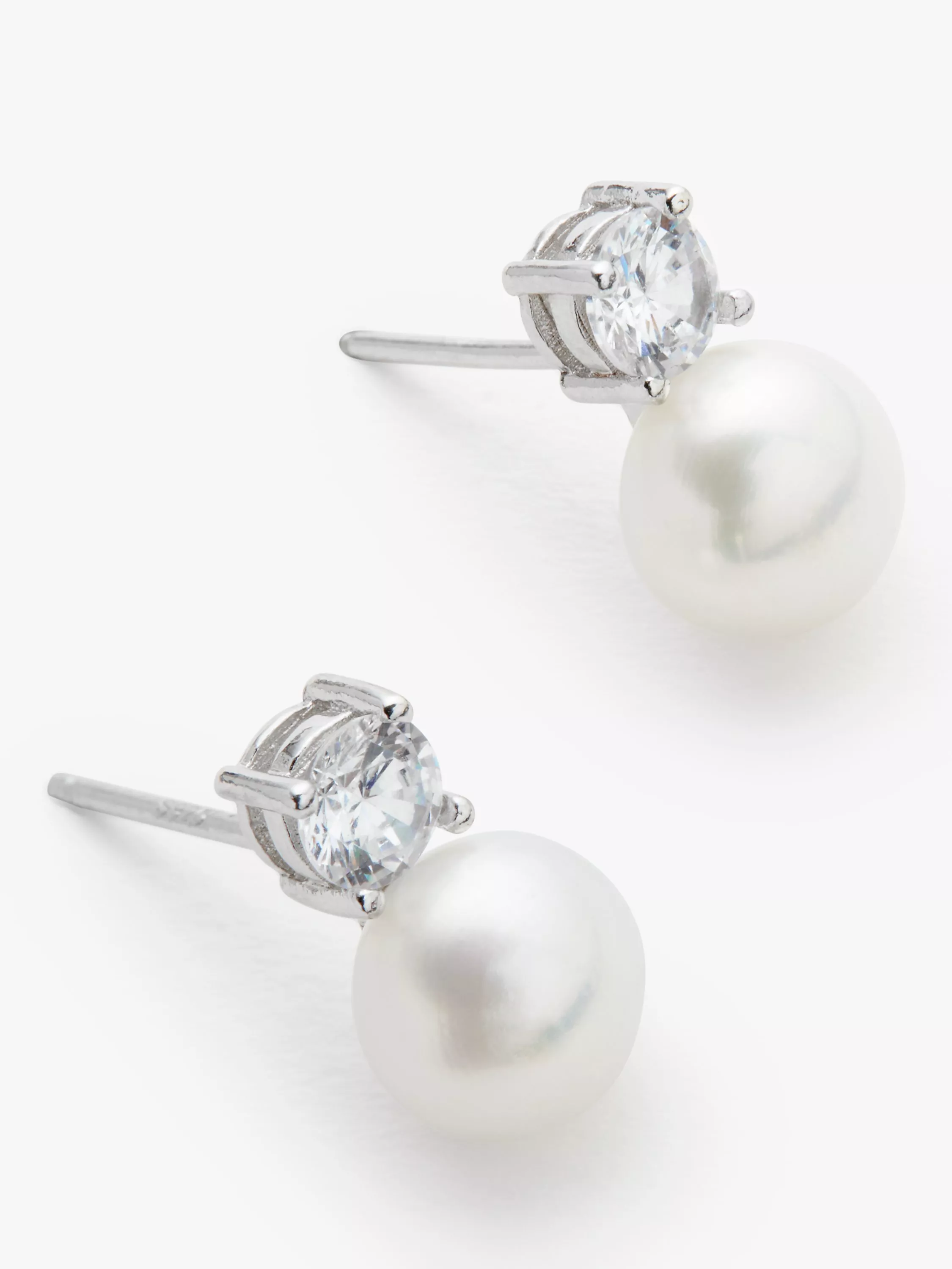 The earrings feature a single rounded freshwater pearl, with a dash of sparkle that sits atop in the form of a smaller cubic zirconia sphere.