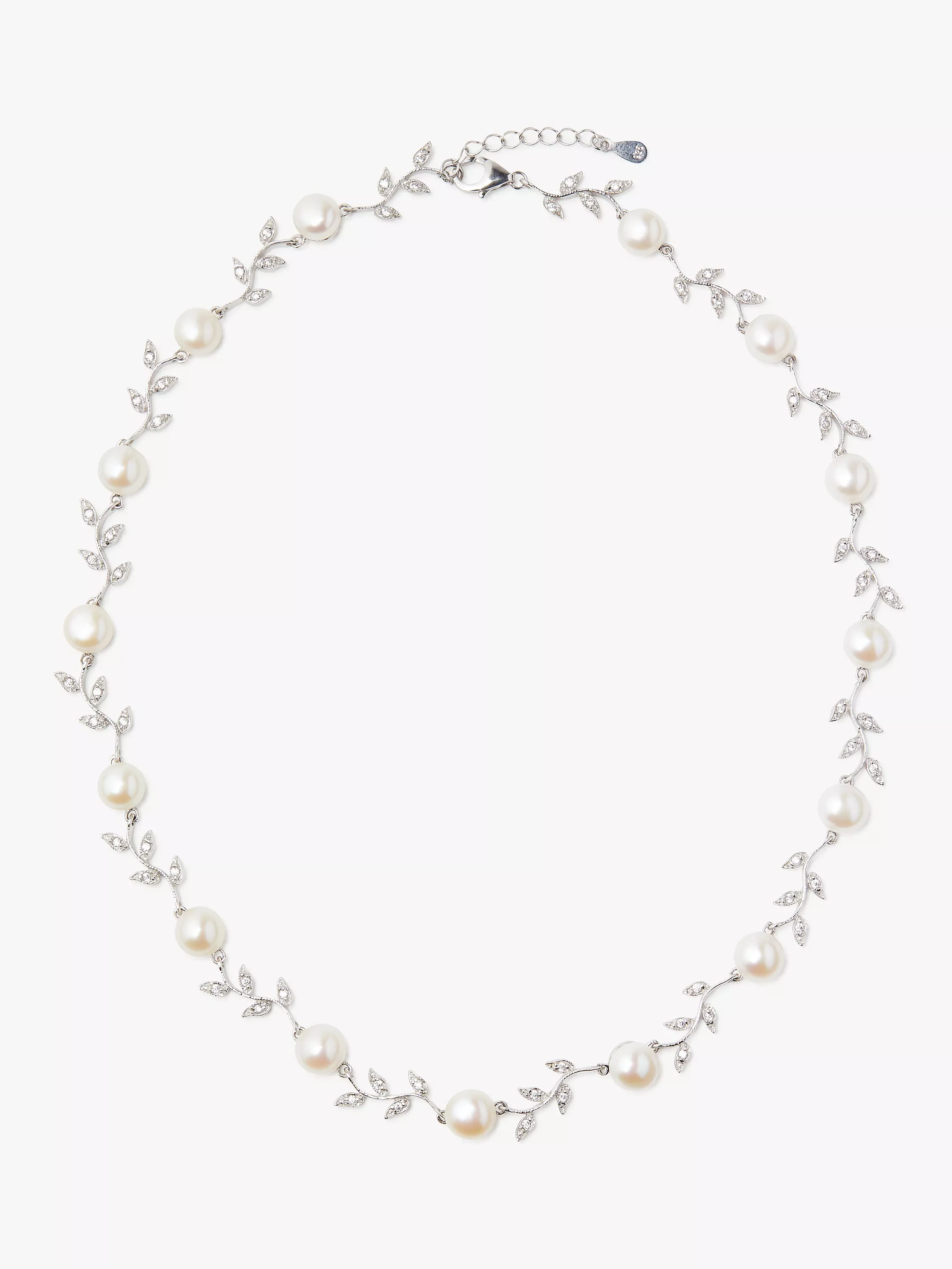 Dainty sterling silver sections are crafted into elaborate leaf shape and studded with sparkling cubic zirconia, while natural white pearls add an alternating harmony to the silhouette. The necklace is complete with an adjustable extension chain and a lobster clasp.