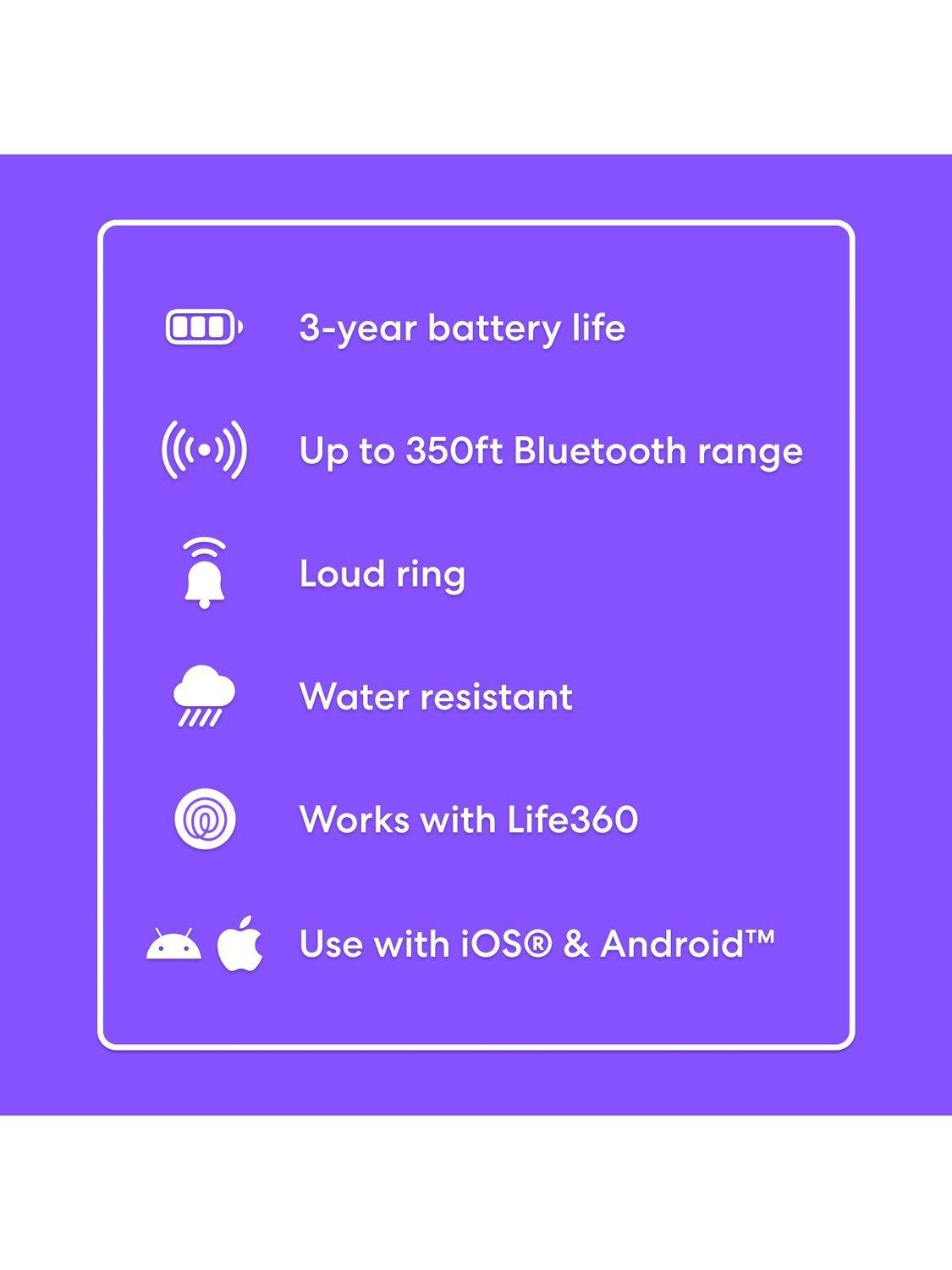 350-foot / 105m Bluetooth range. Up to a 3-year non-replaceable battery. Water-resistant (IP68 rated). Built-in attachment loop.