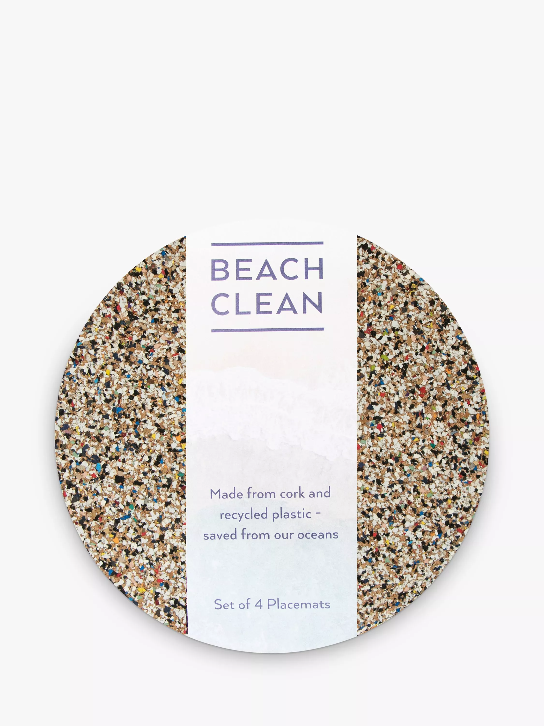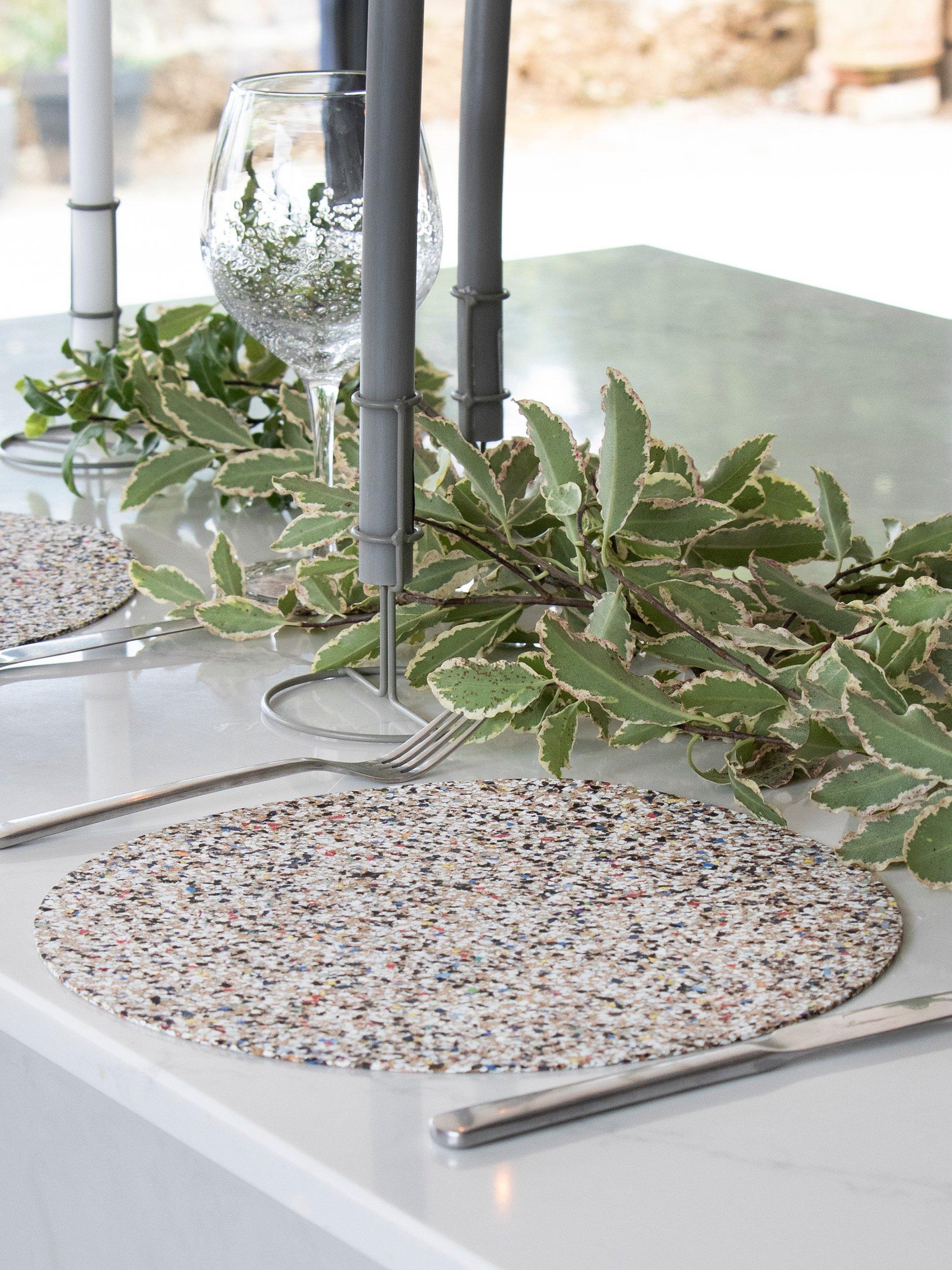 Four round placemats from LIGA's Beach Clean collection, made from natural cork and recycled, food-safe EVA plastics, saved from the oceans. Variations in the materials create slightly different patterns and colours from item to item, making each one unique.