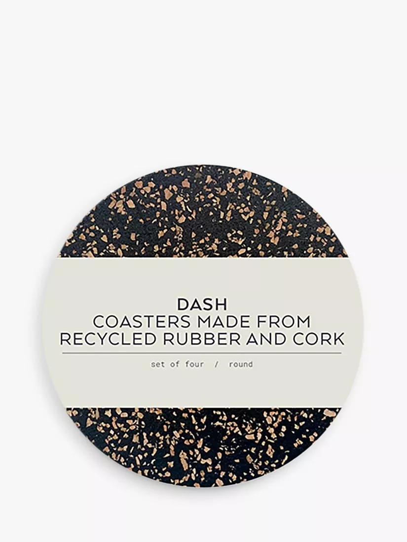 A set of four round coasters from LIGA's Dash collection, made from natural cork and recycled rubber. Variations in the materials create slightly different patterns and colours from item to item, making each one unique.