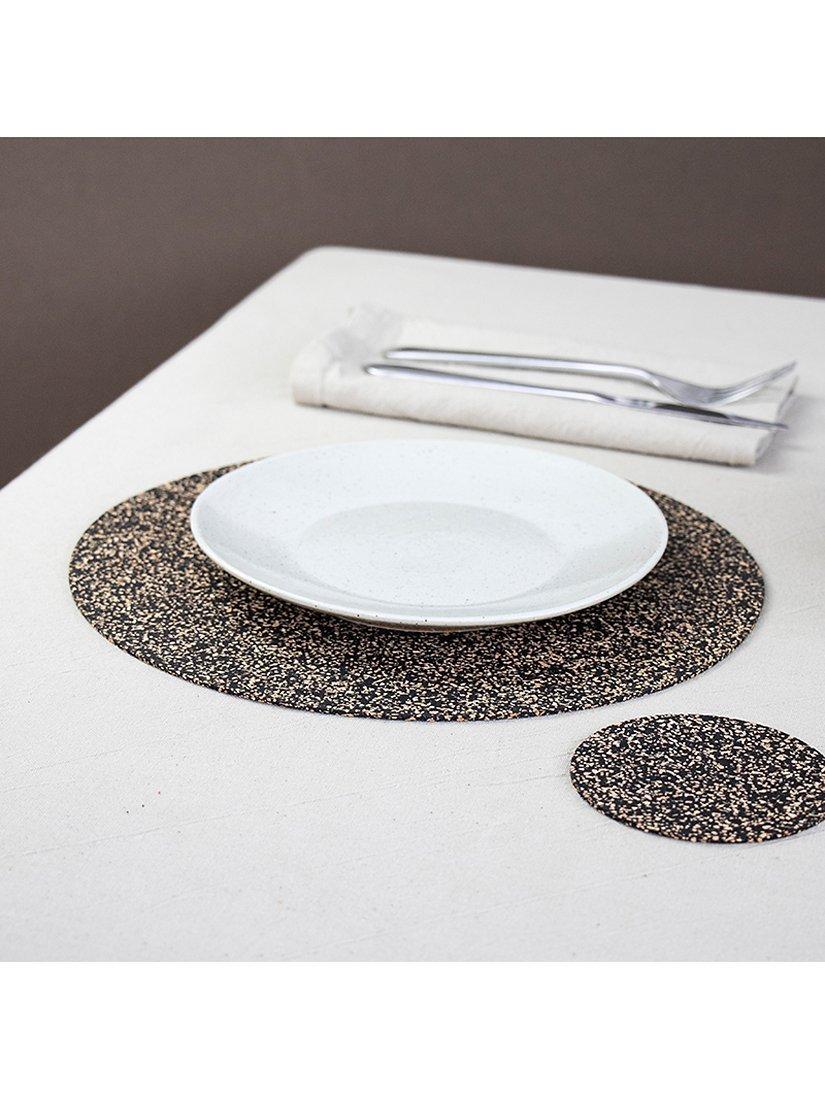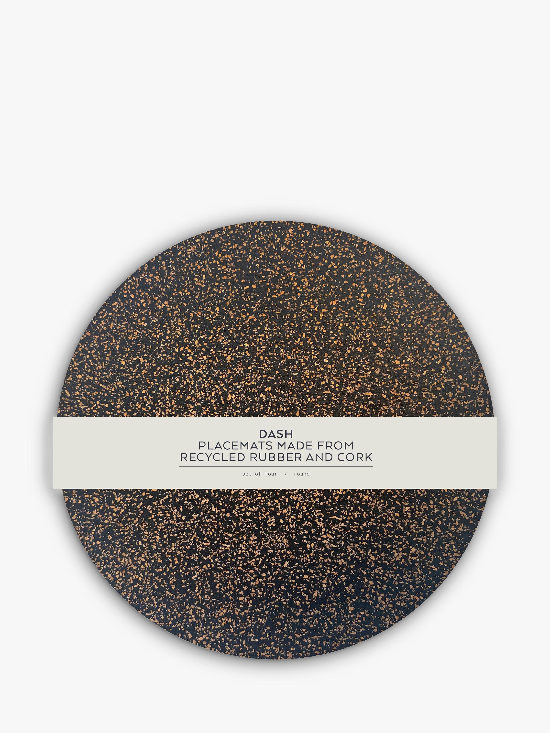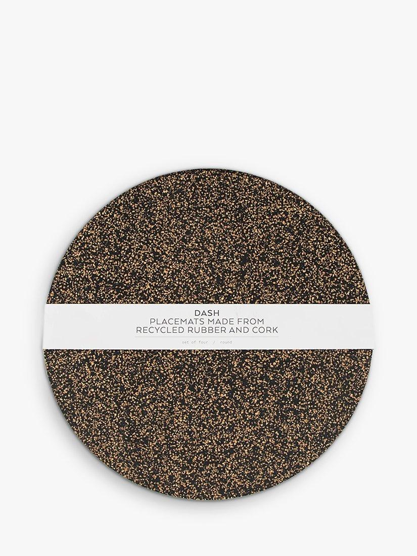 A set of four round placemats from LIGA's Dash collection, made from natural cork and recycled rubber. Variations in the materials create slightly different patterns and colours from item to item, making each one unique.