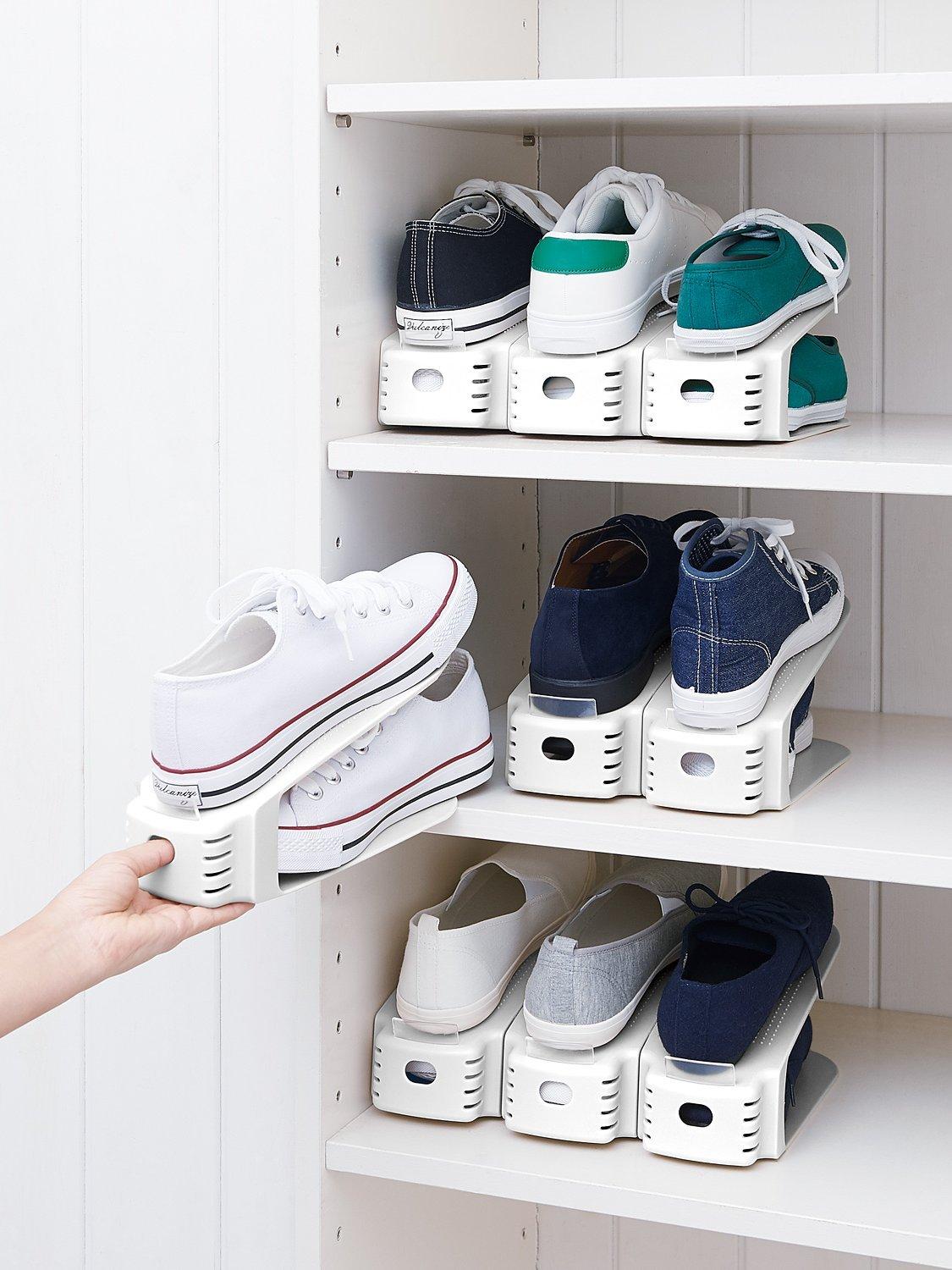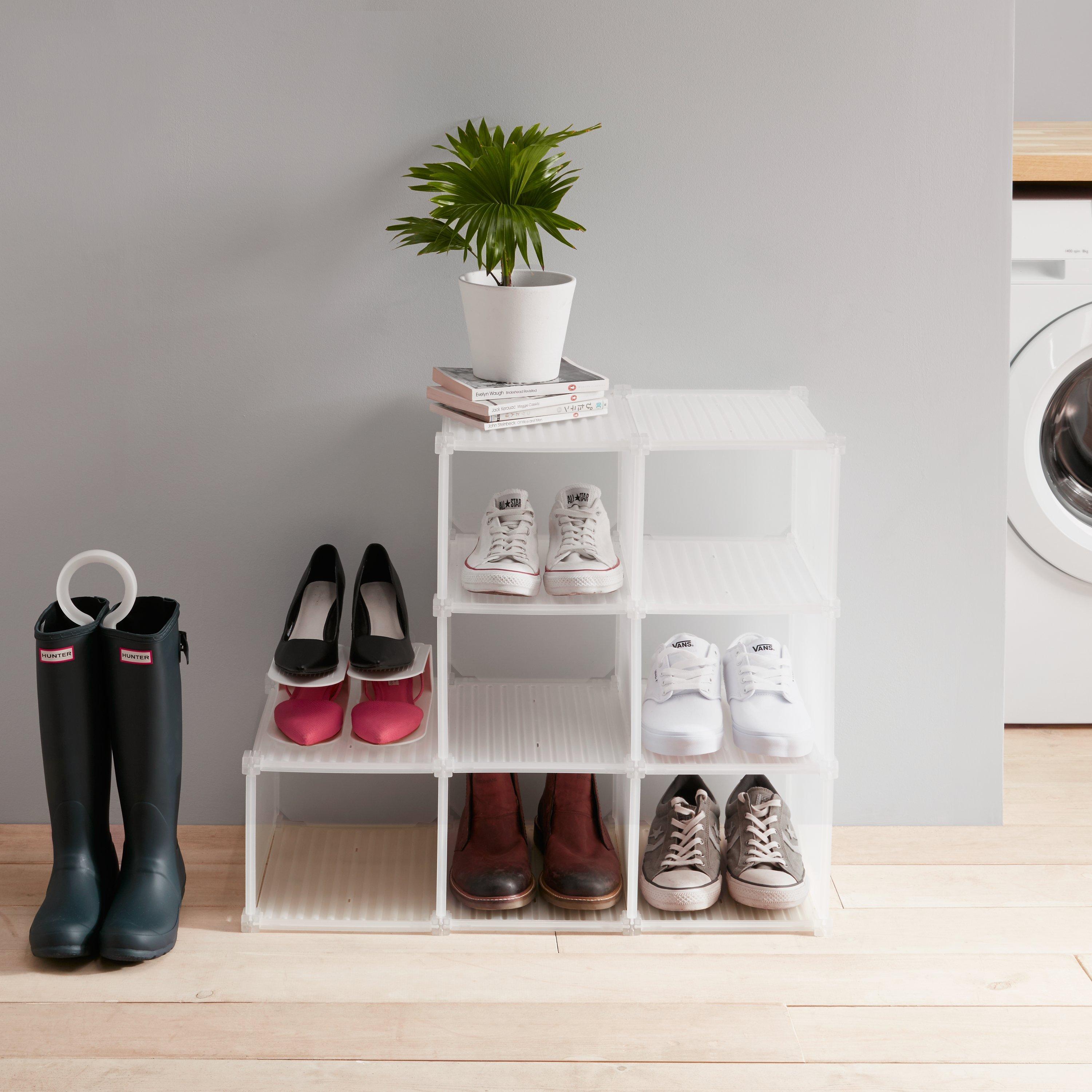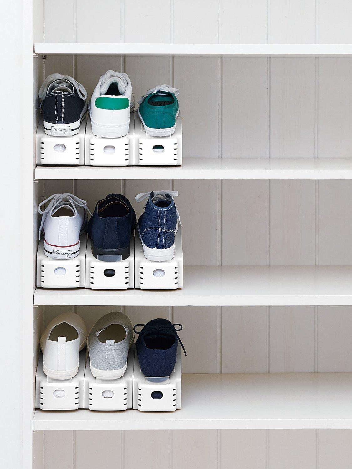 This set of 2 shoe holders is the perfect space-saving solution for storing your shoes. Rest one shoe on the top and the other on the base. The top shoe is kept in place by the bar at the front, whilst the bottom shoe slides out easily from underneath.
