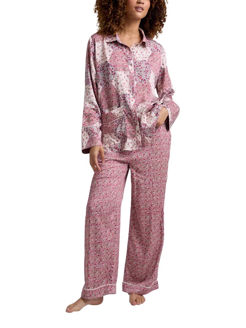 Cut from a new, super-soft satin for a dreamy sleep or at-home comfort. A classic, button-down pyjama shirt with piping details on front patch pockets, paired with drawstring-tie, wide-leg trousers for unstructured bliss. The set features the Aster patchwork pink print and comes in a printed drawstring pouch.