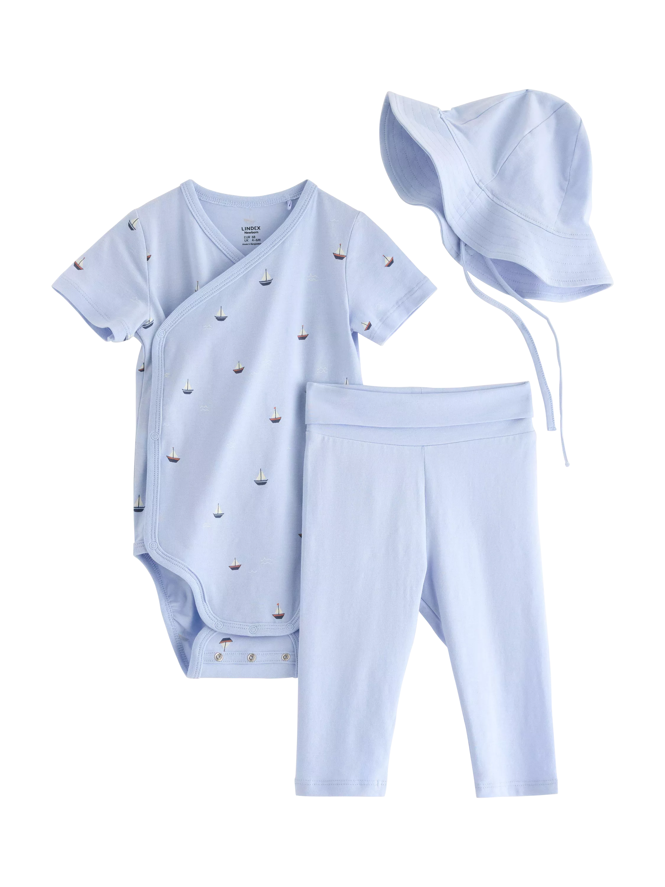 Comfortable and stylish three piece baby set perfect for all-day wear, featuring a wrap bodysuit, fold-over waistband leggings and sun hat.