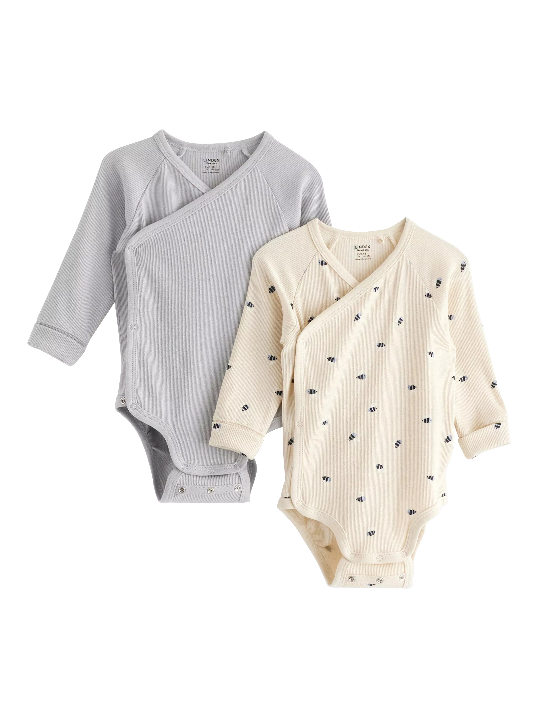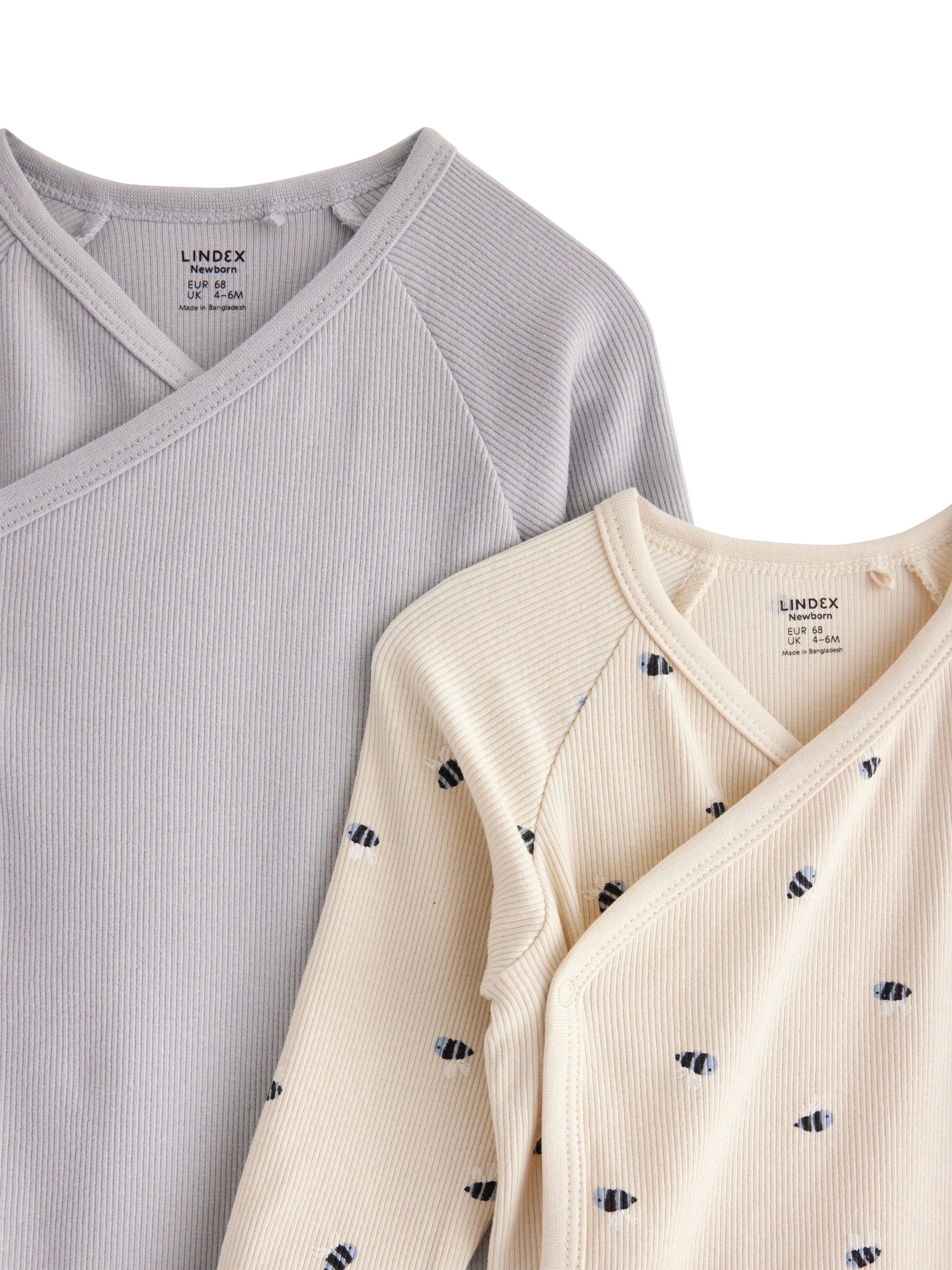 Ribbed wrap bodysuits in soft and stretchy cotton with long sleeves. With Lindex's smart extended size solution the baby can grow a size and still keep the same garment.