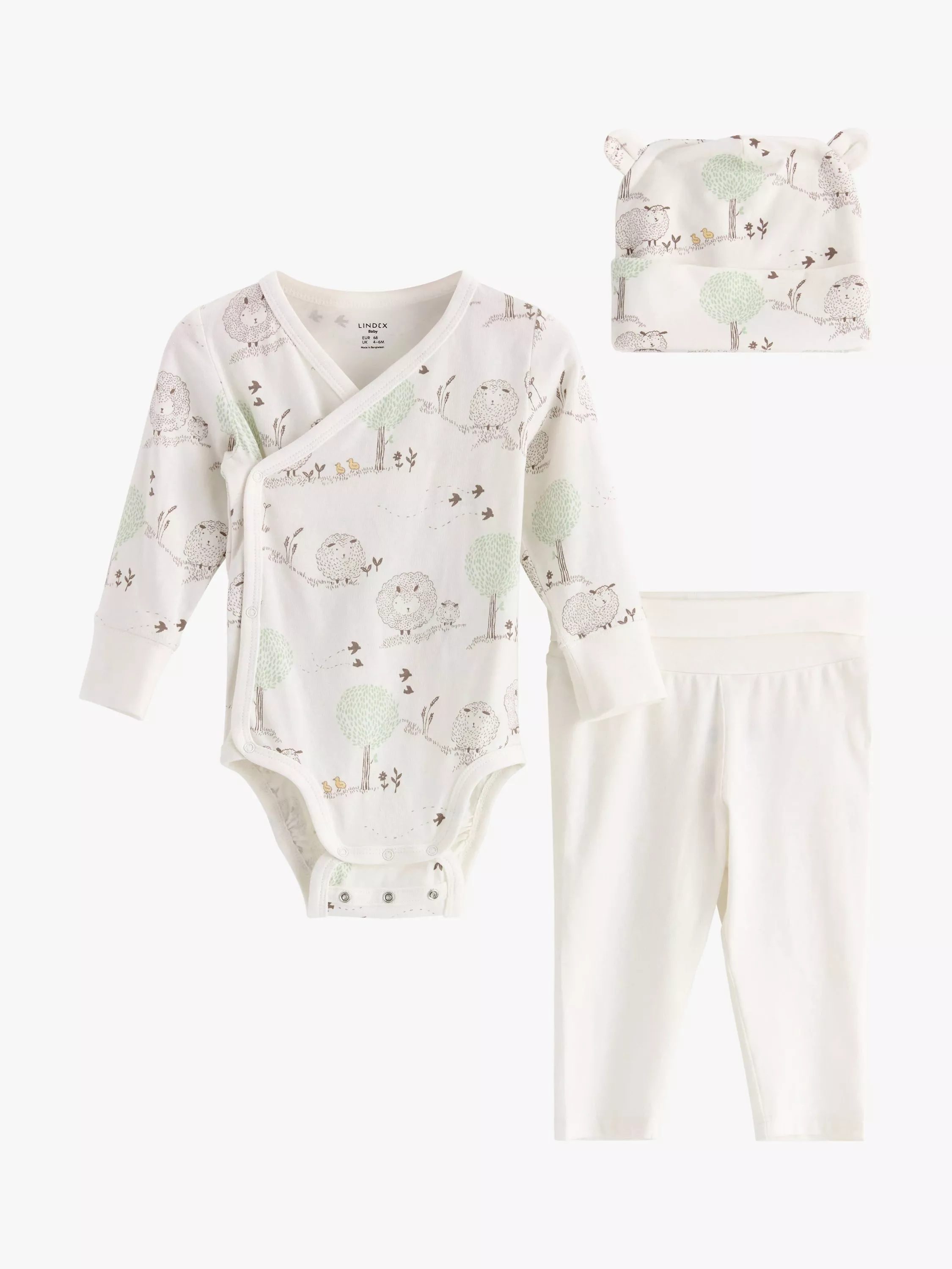 Comfy three piece set with a wrap style bodysuit, leggings and matching hat.