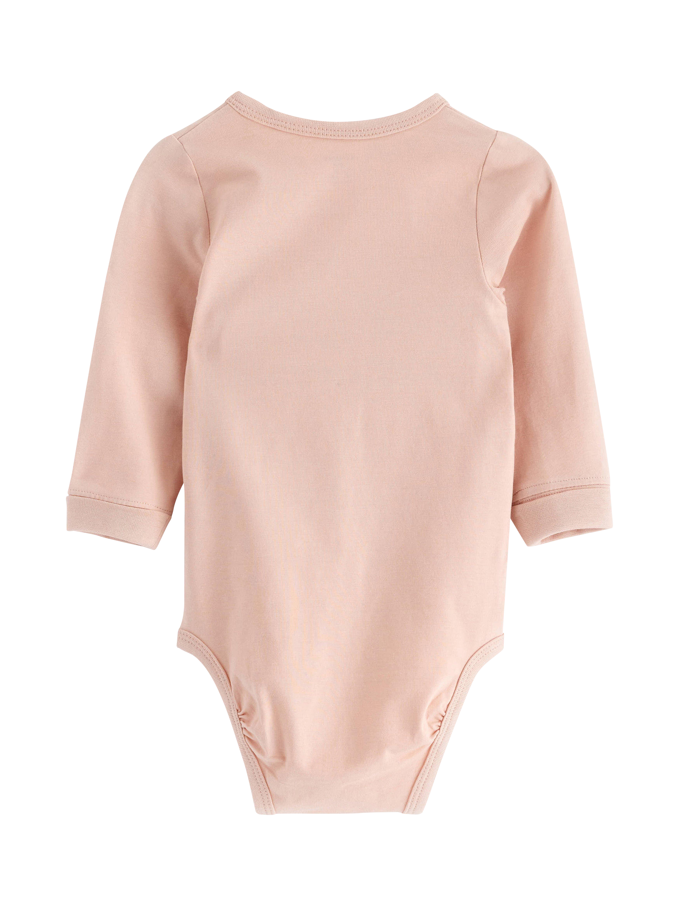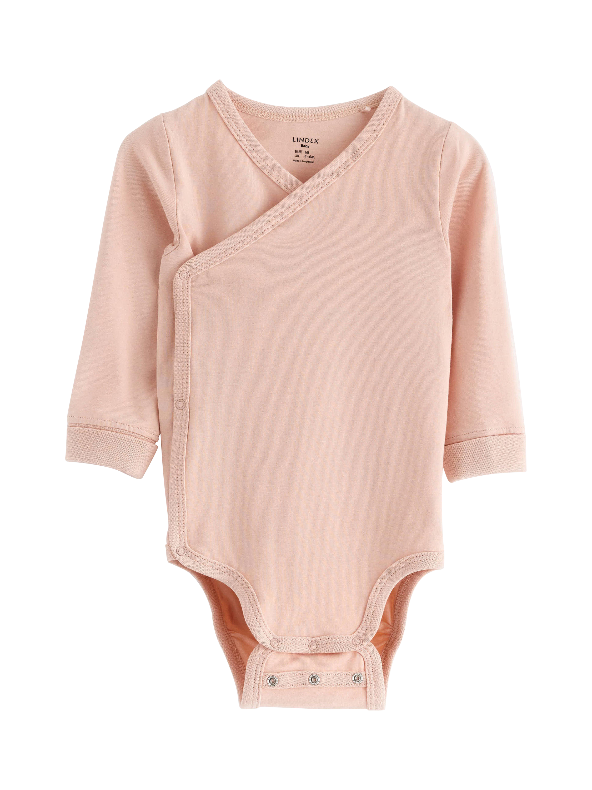 A soft and comfy wrap style bodysuit made in a stretchy cotton blend. Designed for extended wear so even when baby grows a size, the outfit still fits.