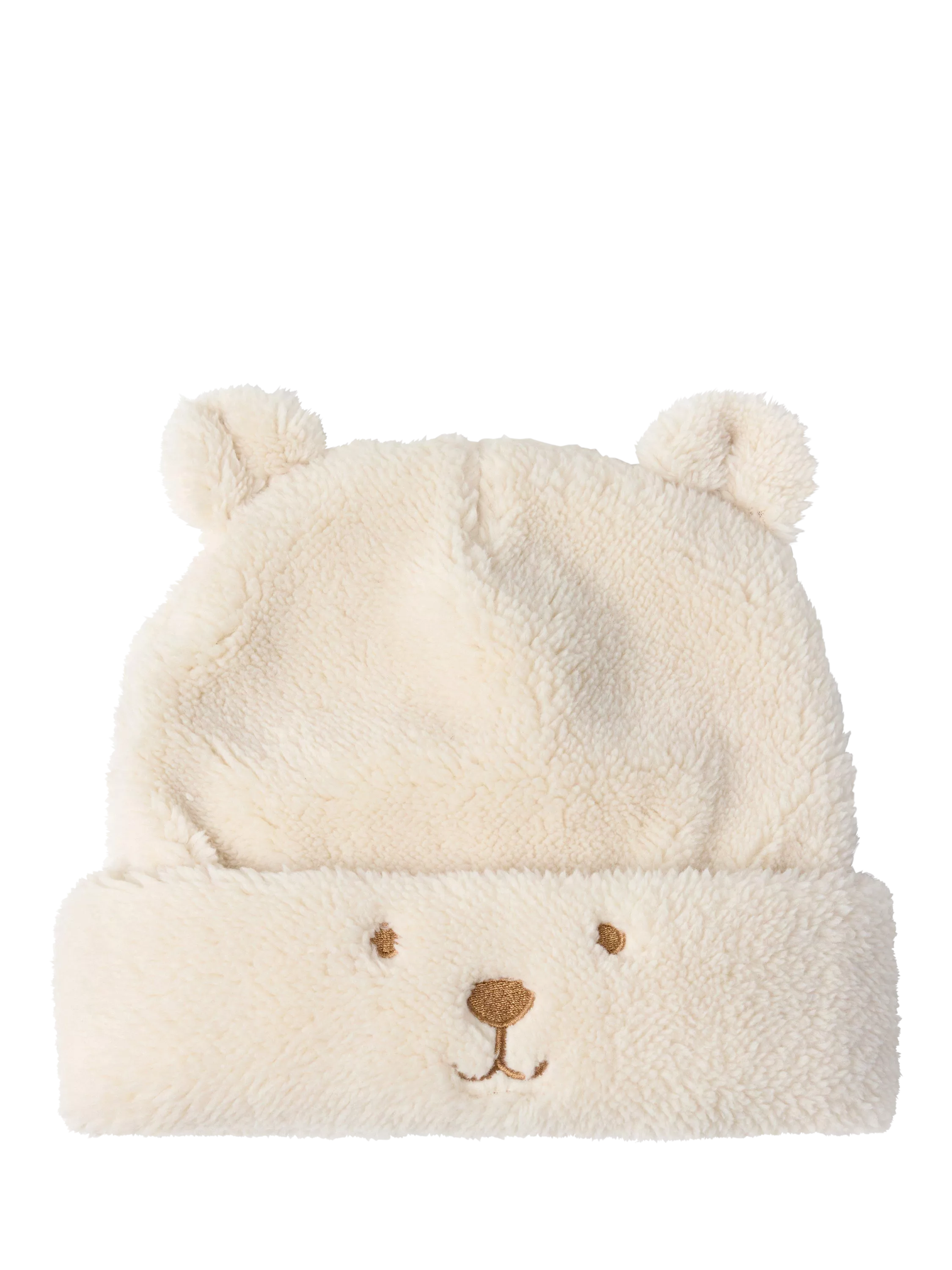 A cosy beanie style hat made in super soft pile material with sewn-on ears and a bear face on the front.