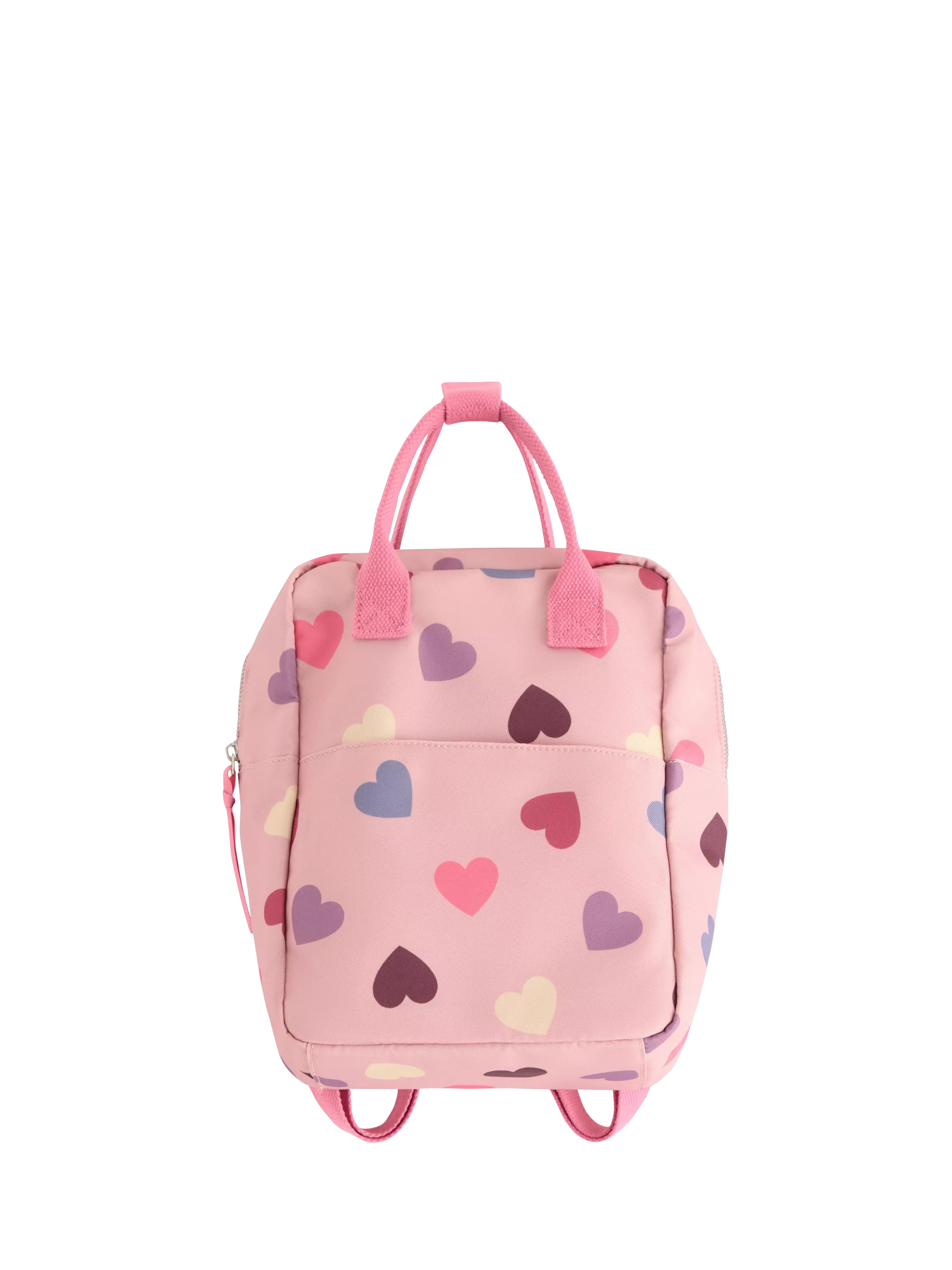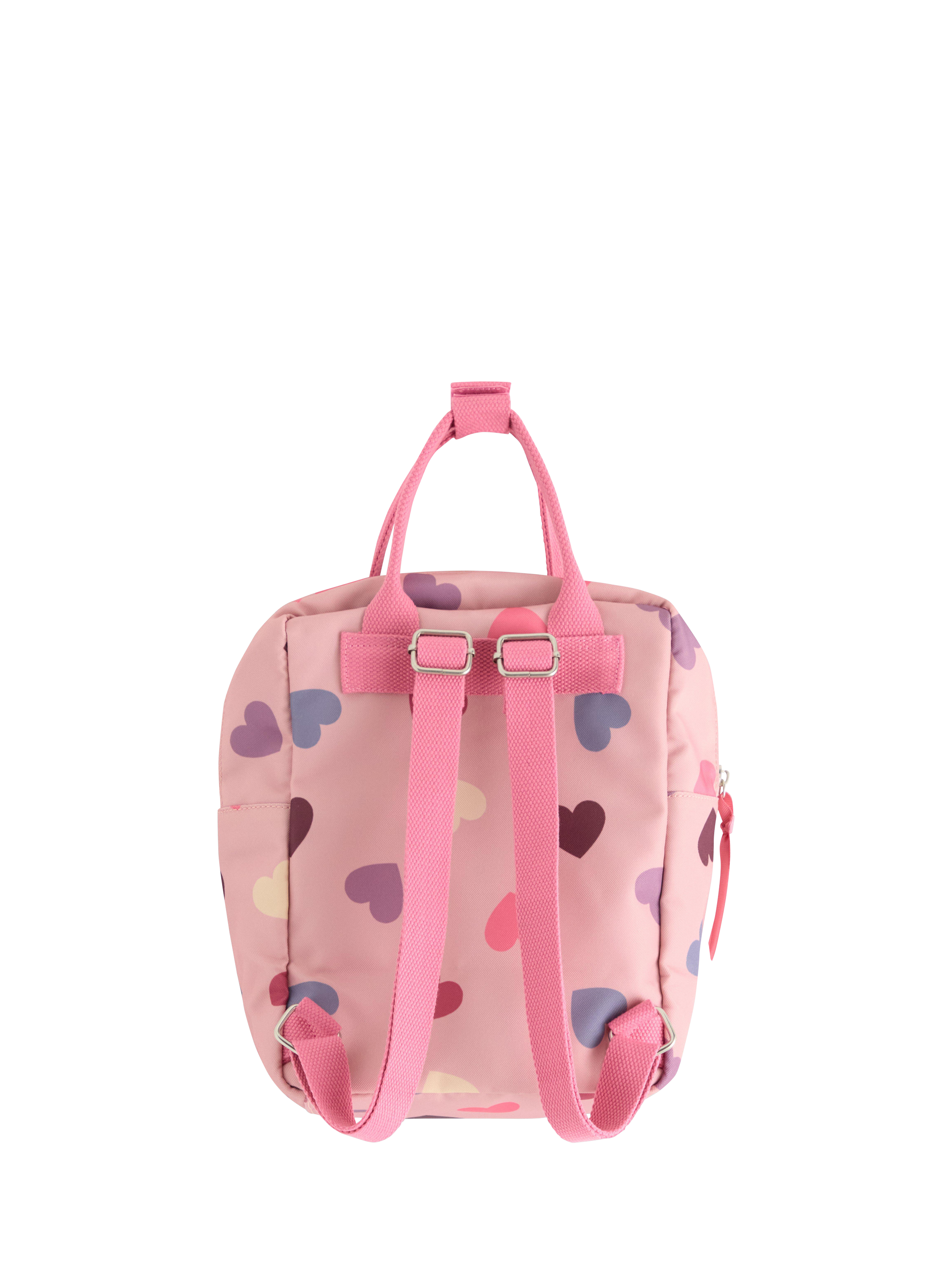 Backpack in sturdy canvas with a zip fastening and adjustable shoulder straps. Decorated with an all-over heart pattern.