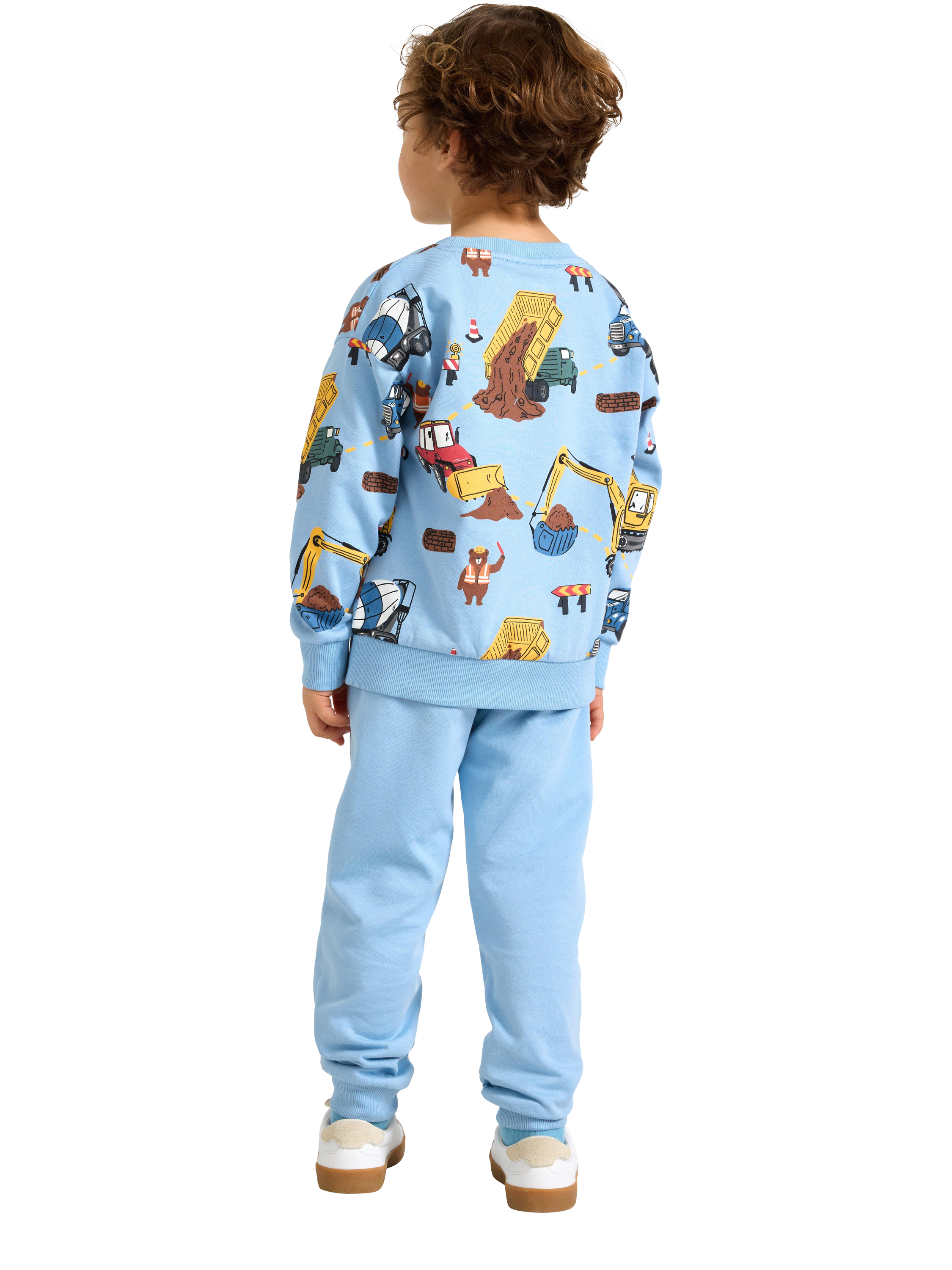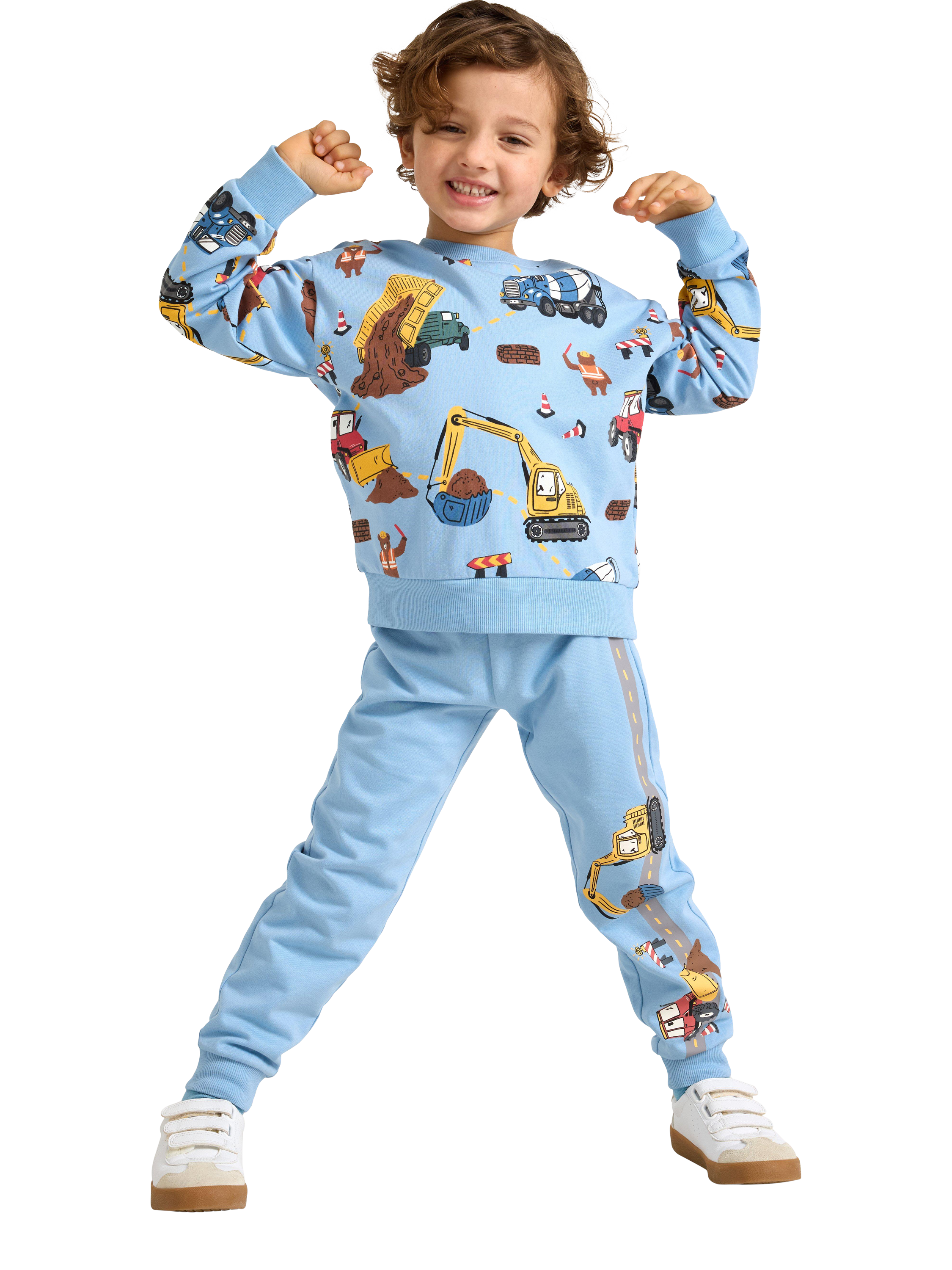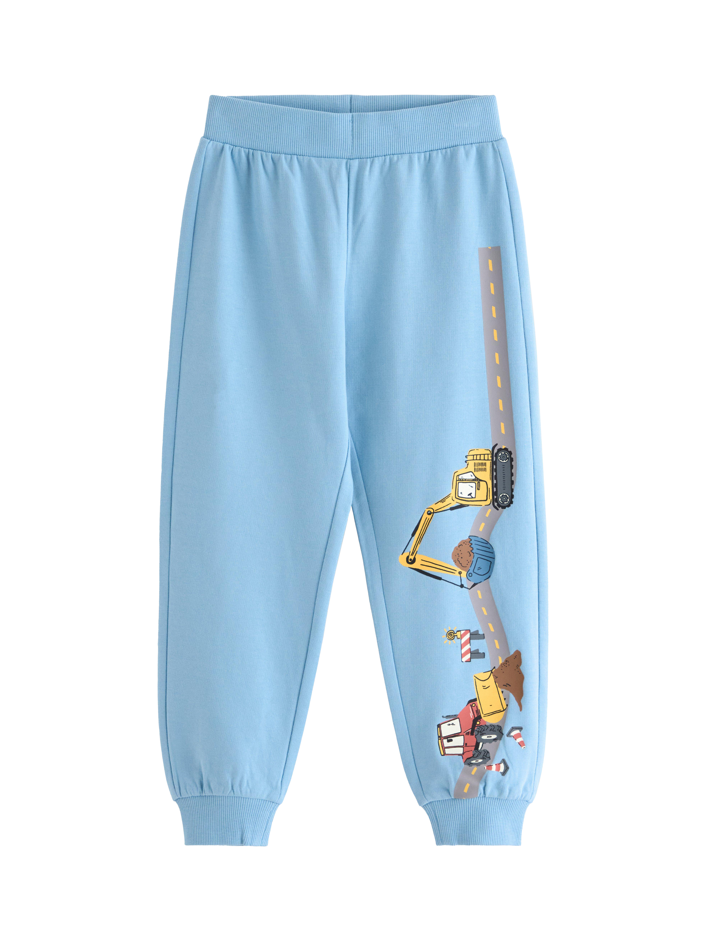 Soft joggers featuring a playful construction vehicle print and a brushed inside, perfect for cosy days.