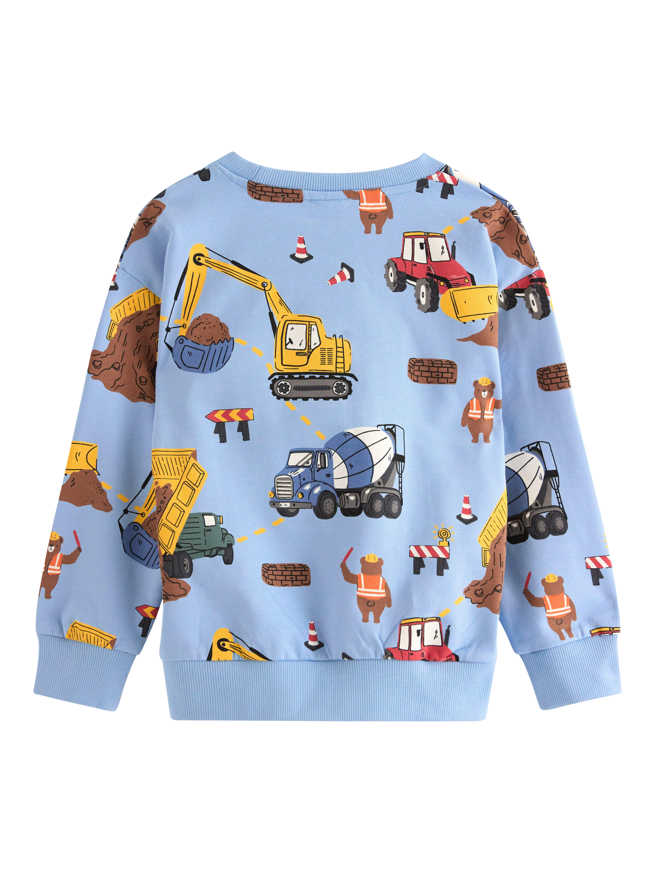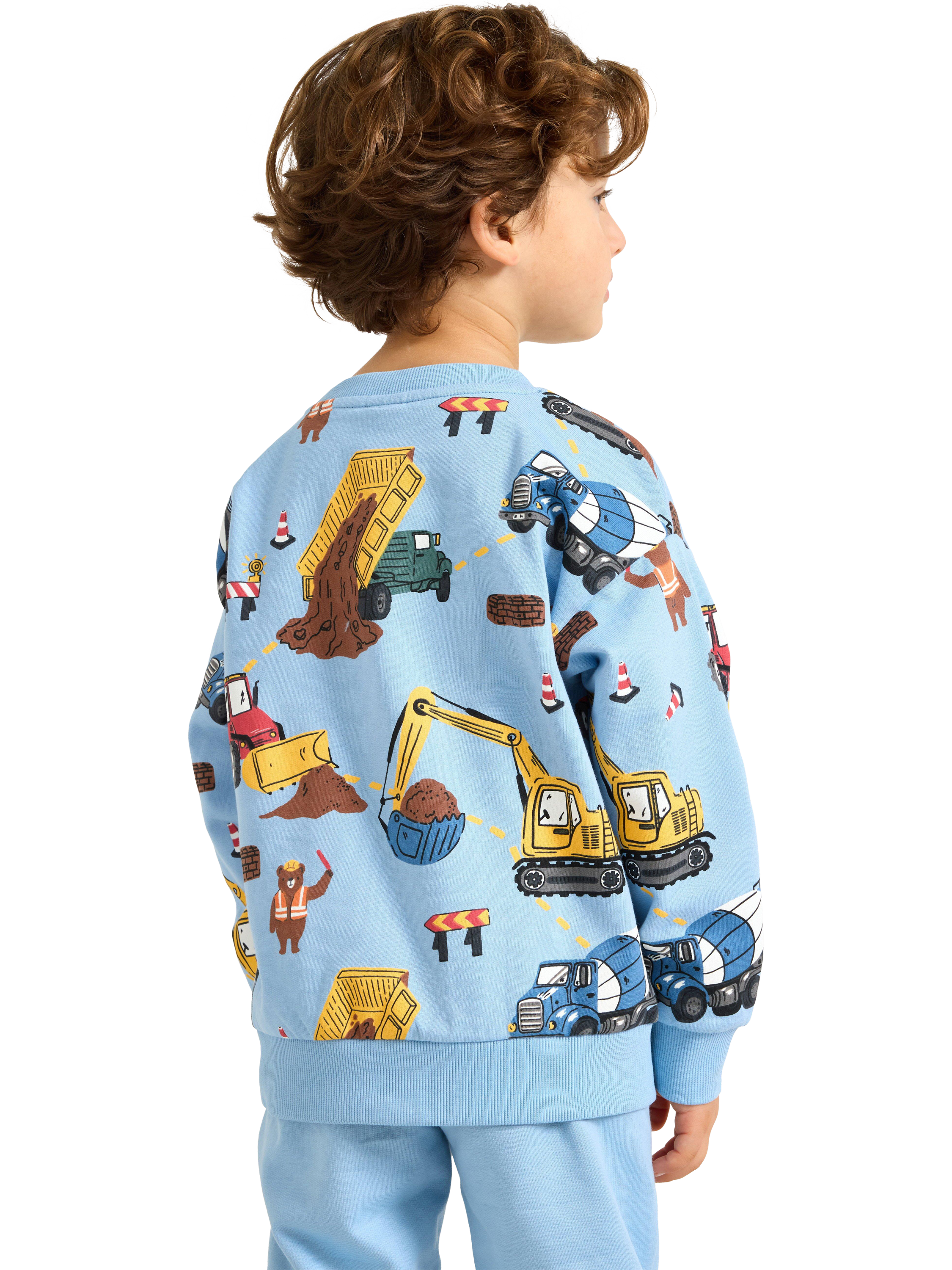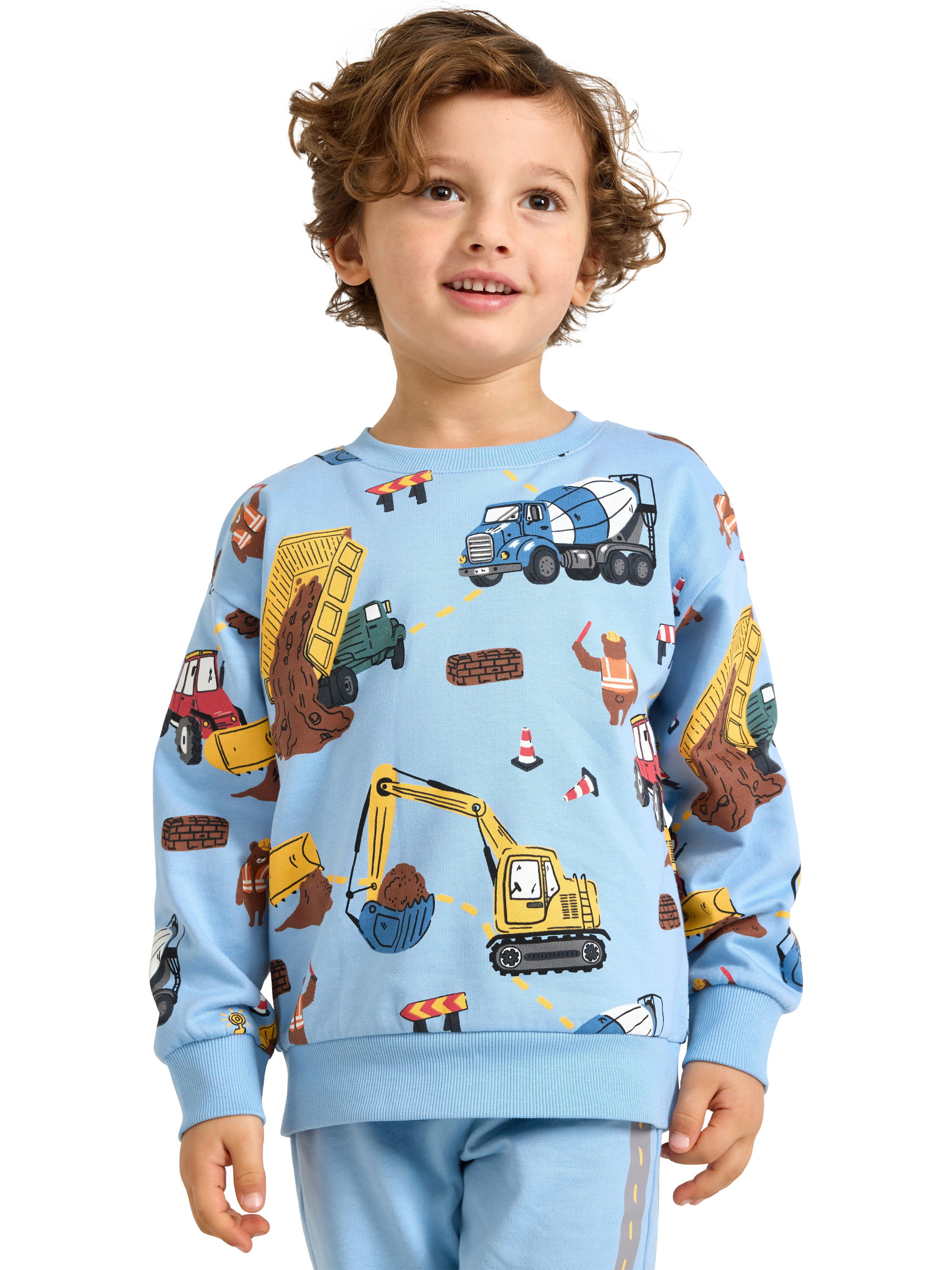 Soft cotton sweatshirt with a brushed inside and colourful construction-themed pattern. Ideal for a casual and playful look.