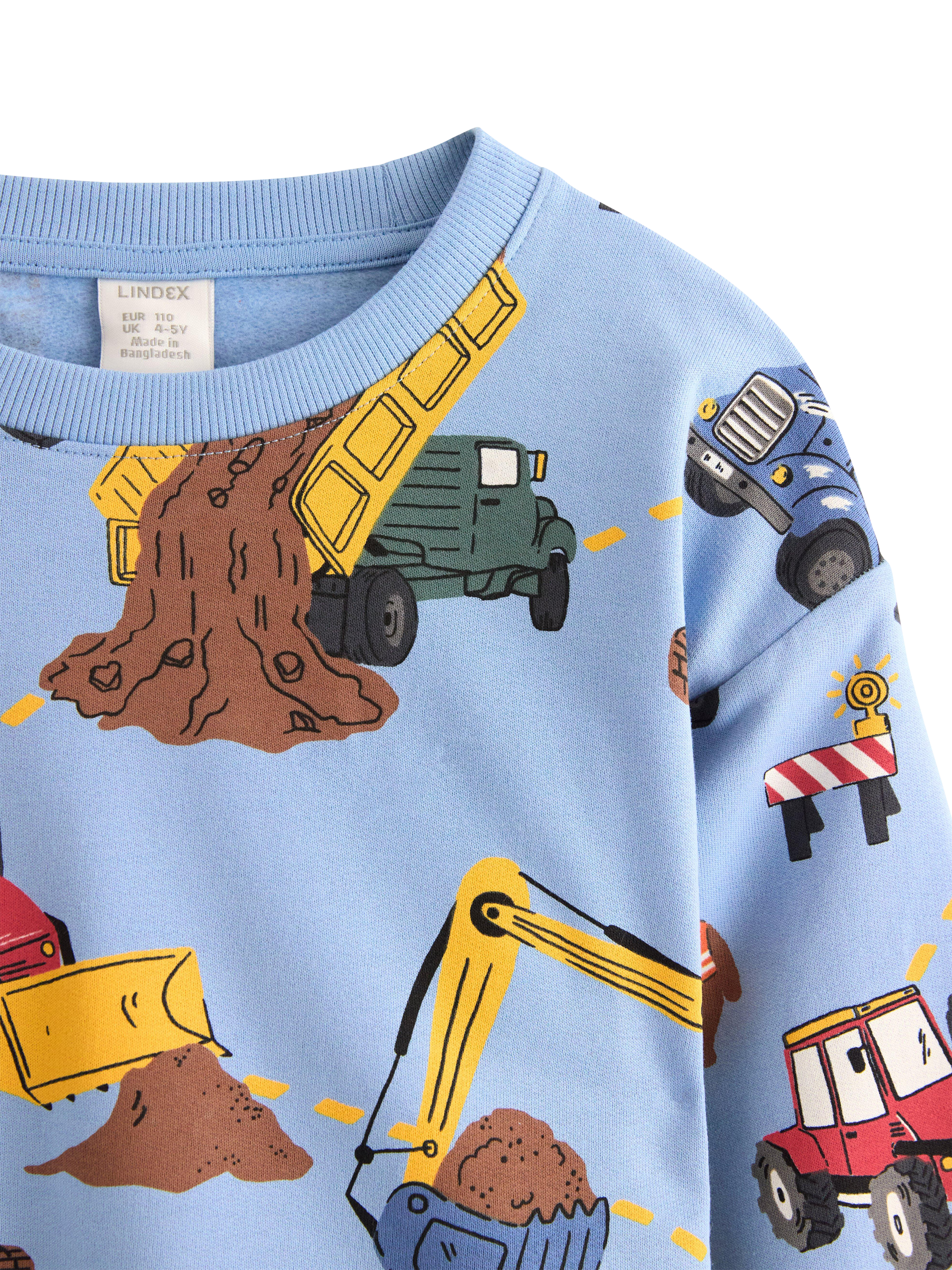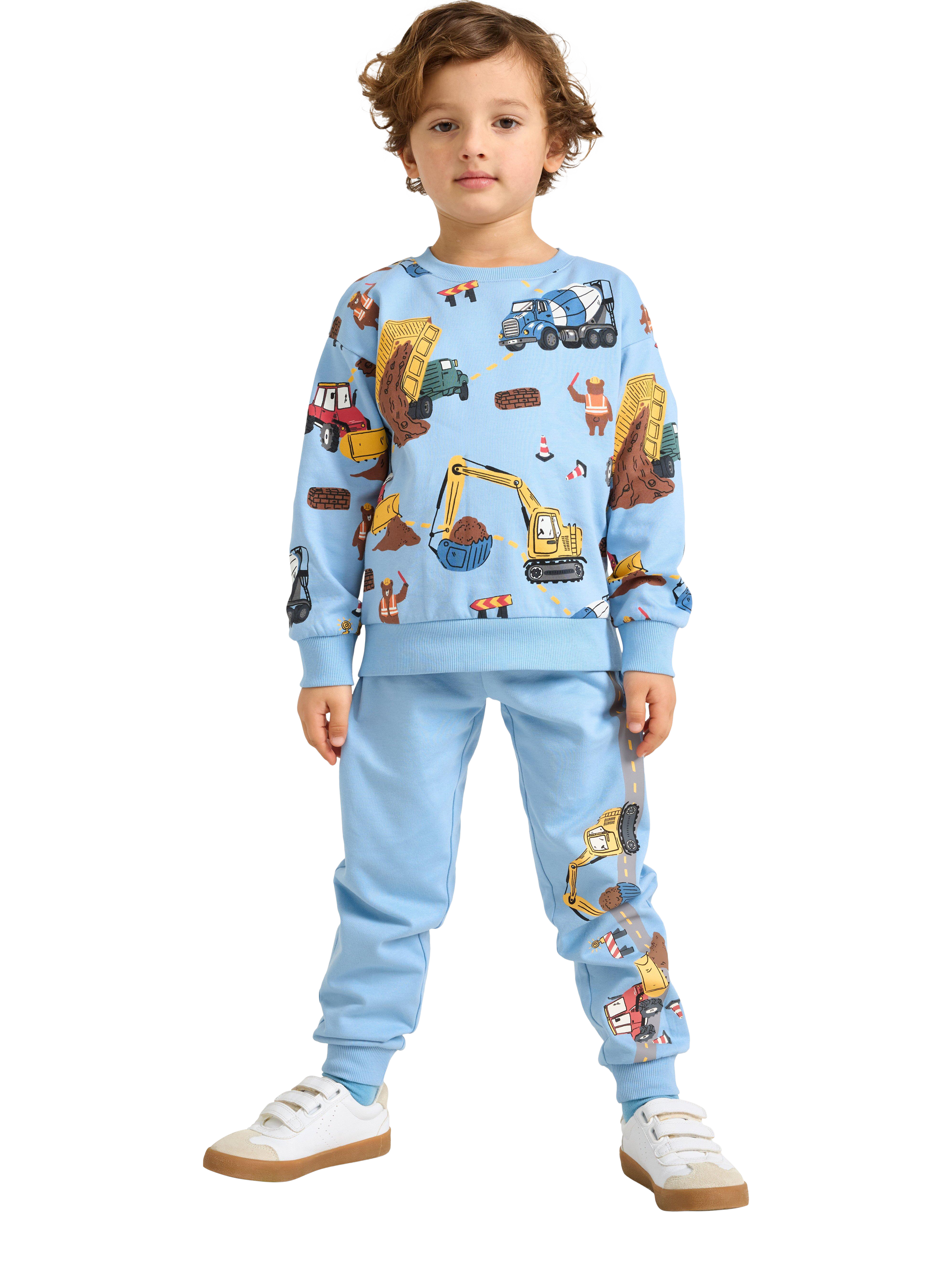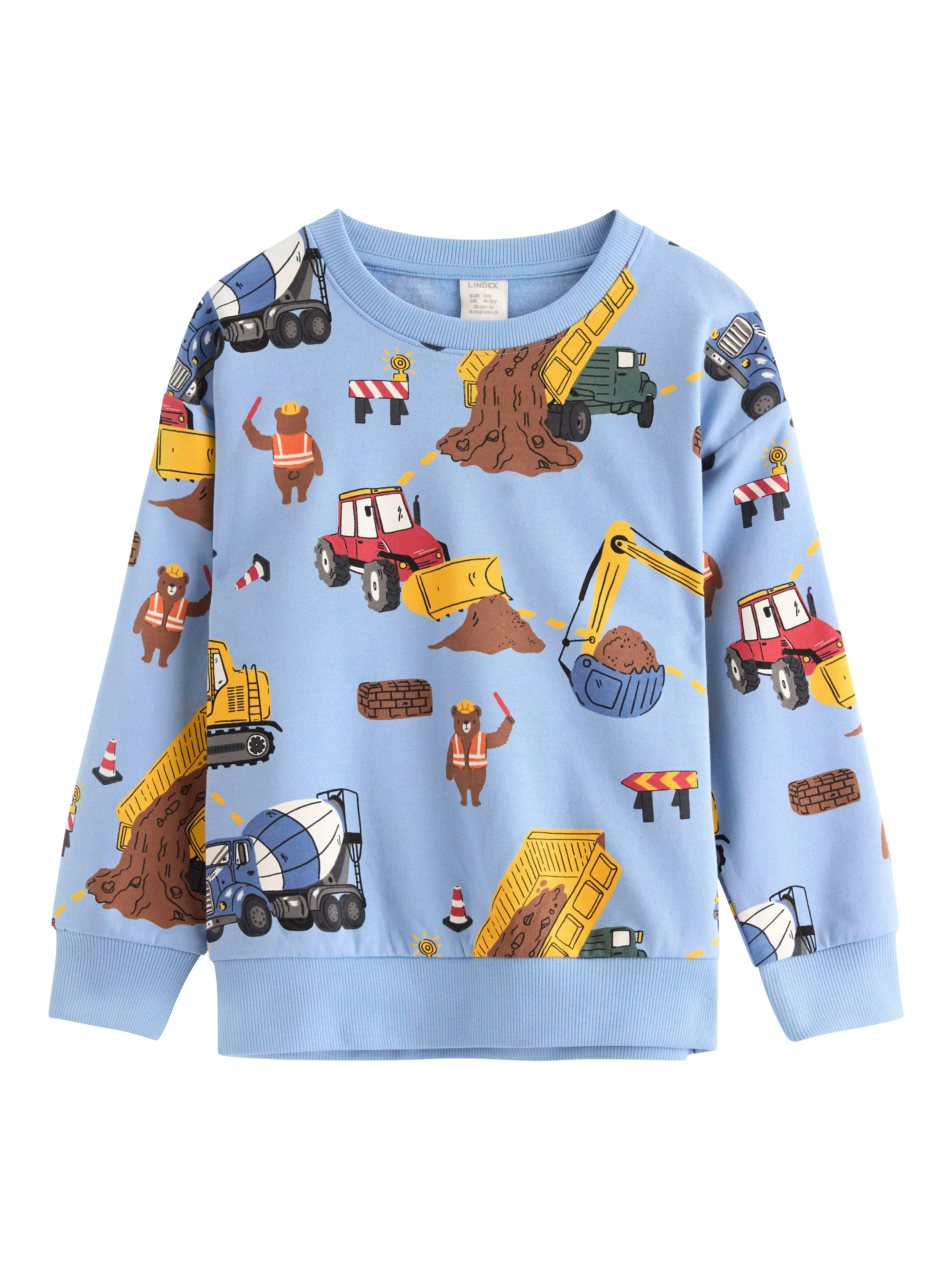 Soft cotton sweatshirt with a brushed inside and colourful construction-themed pattern. Ideal for a casual and playful look.