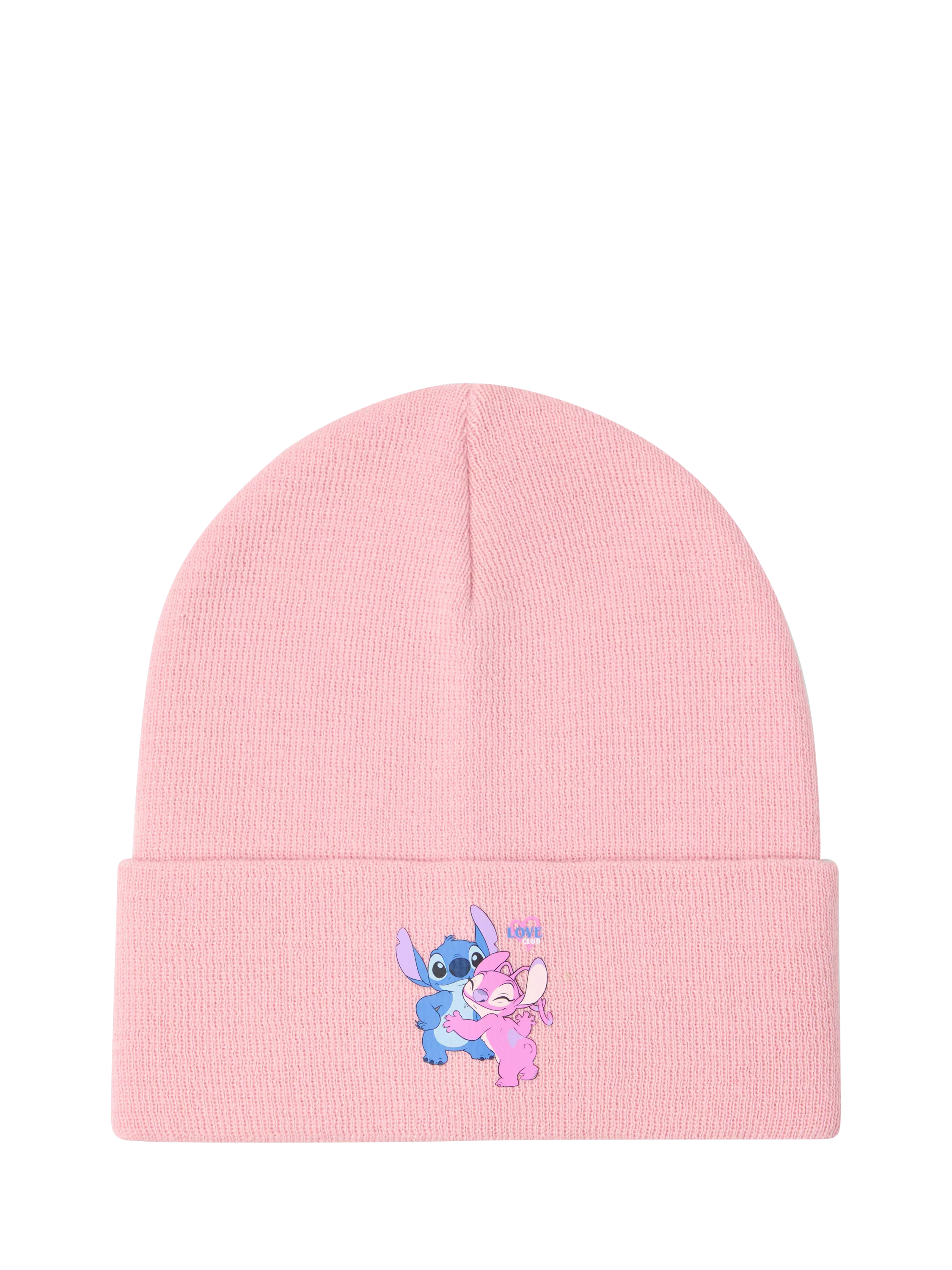 Cosy knitted beanie with a folded brim and a Lilo & Stitch motif at the front.