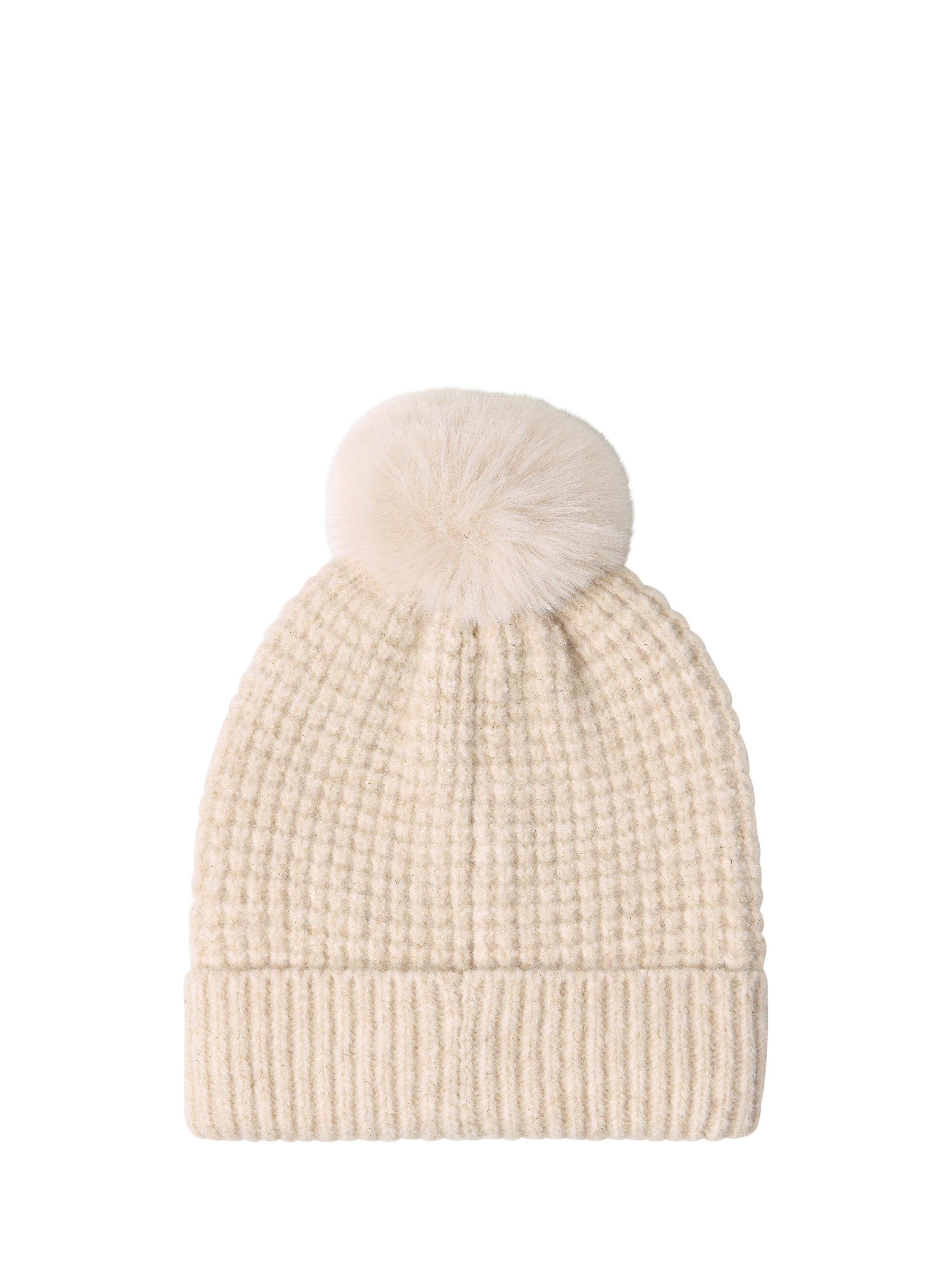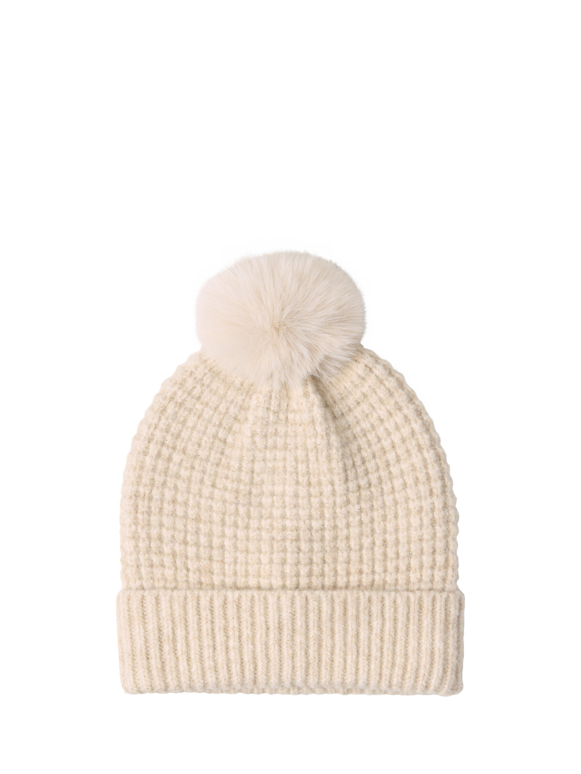 This cosy textured bobble hat is knitted with lurex and has a fluffy pom pom on top.