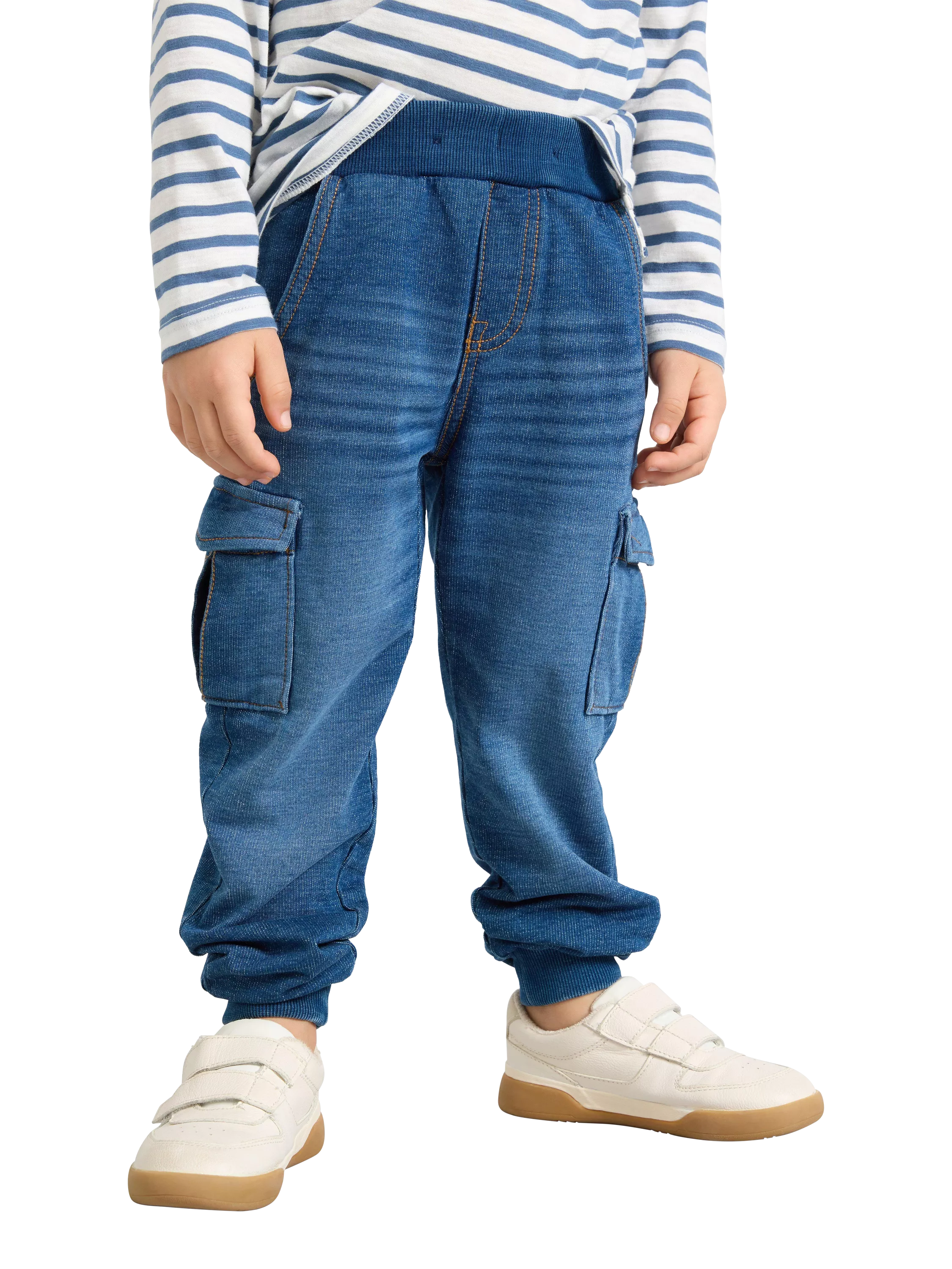 Soft and comfy cargo style joggers in organic cotton jersey with a denim look. Finished with a stretchy waistband and ribbed cuffs.