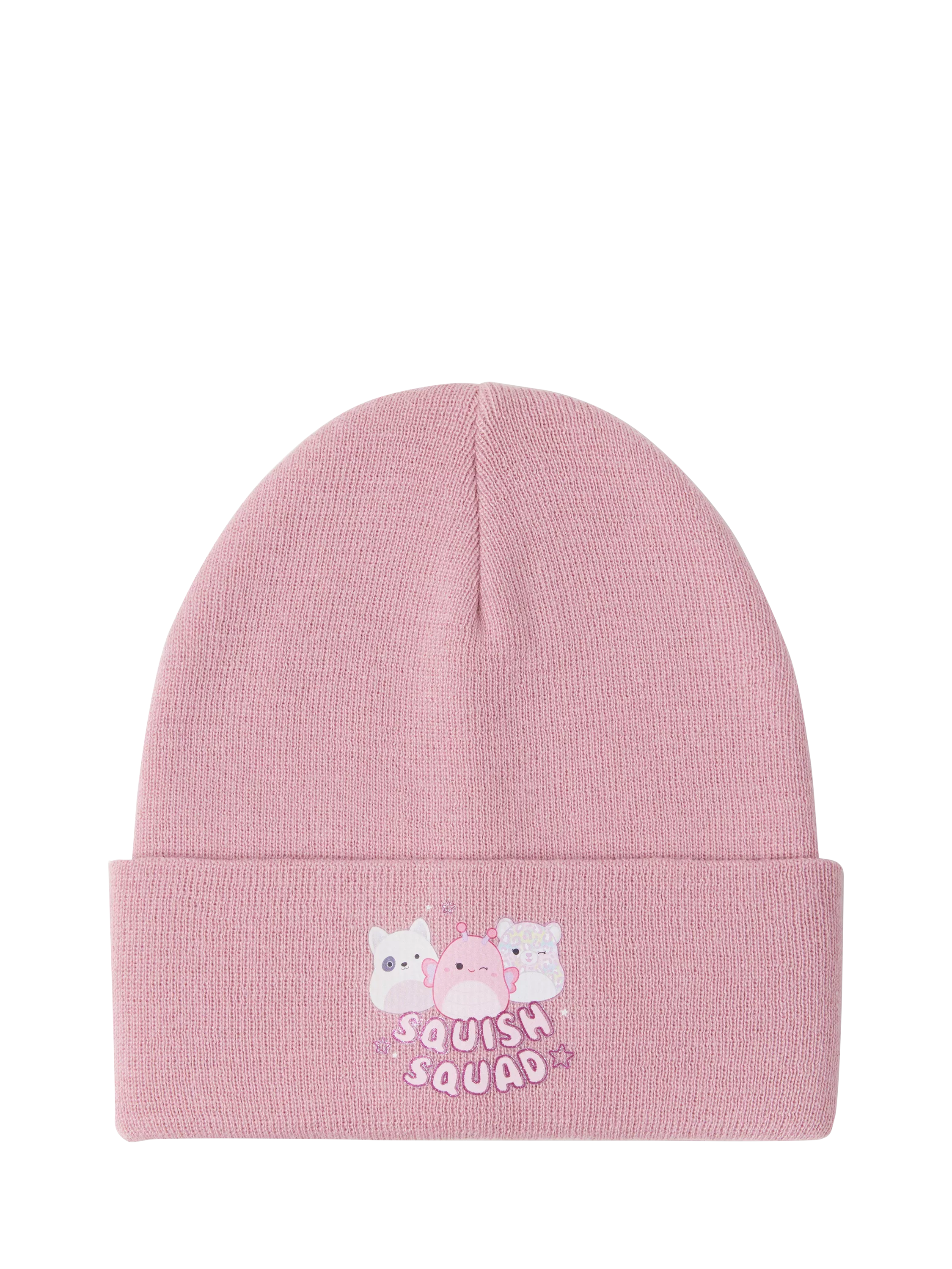 Cosy knitted beanie from Lindex, with a folded brim and a Squishmallows motif at the front.