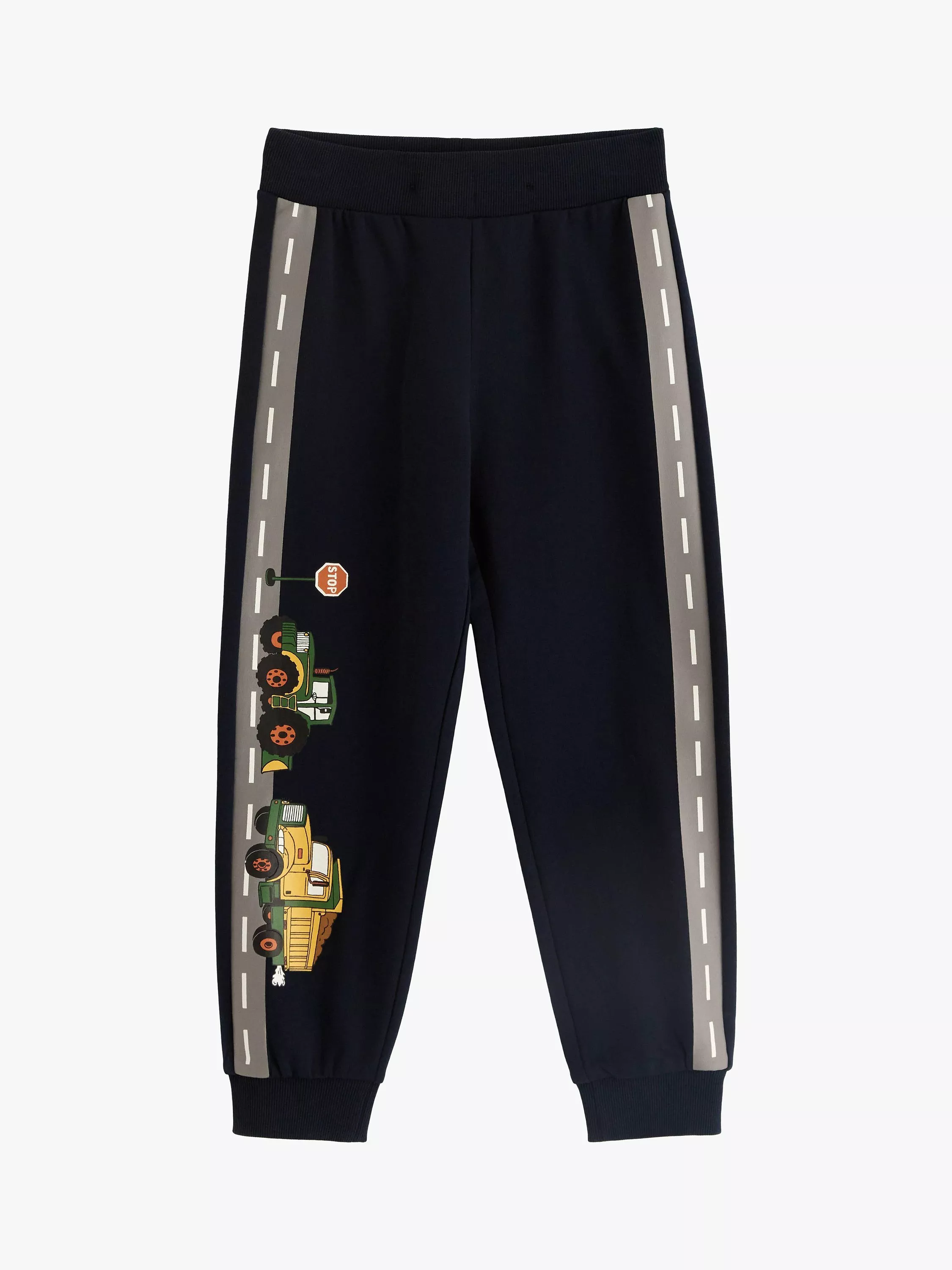 Soft, comfy joggers with a brushed cotton lining featuring vehicle and road print on the exterior.